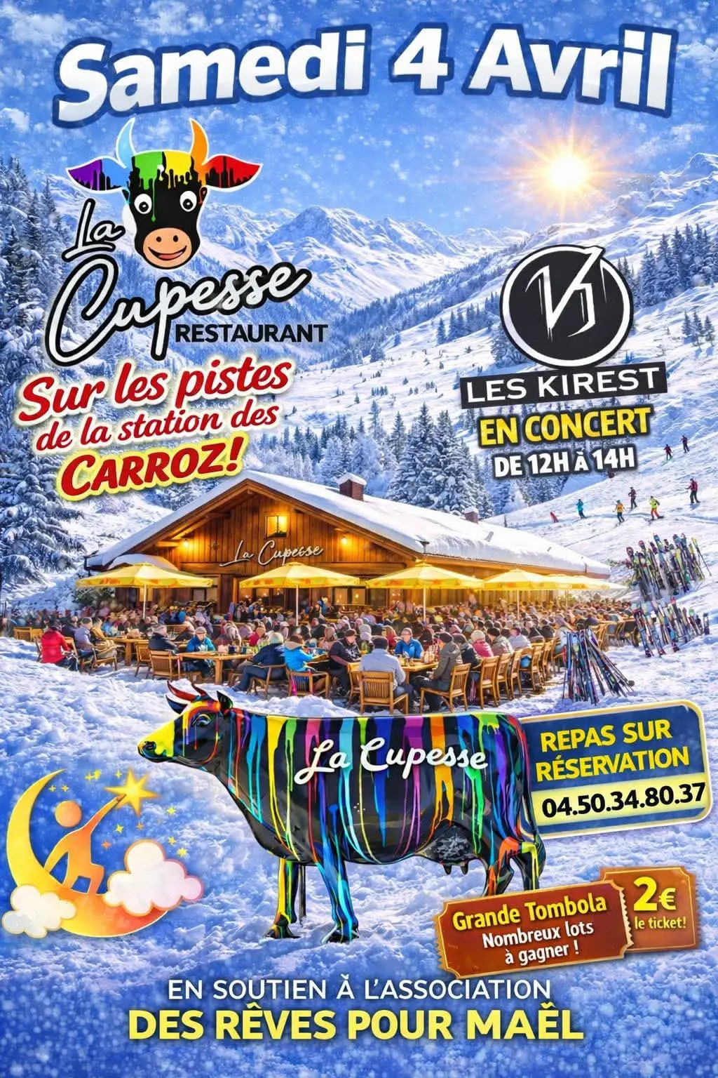 Sur les piste des Carroz, concert des Kirest. Repas sur réservation. Grande tombola avec de nombreux lots à gagner. Événement en soutien à l'association Des Rêves pour Maël.