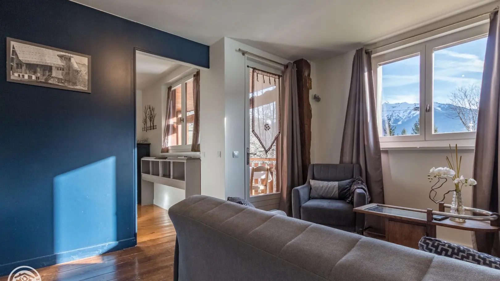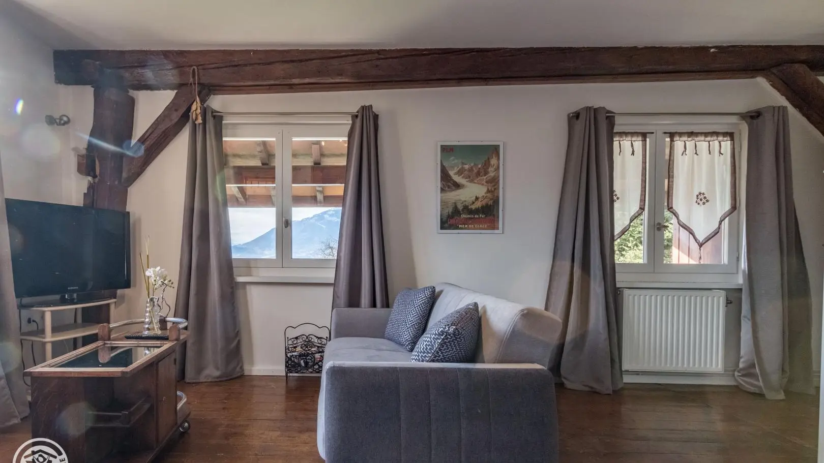 Au coeur d'un hameau calme, dans un chalet comprenant 3 autres gîtes et le logement des propriétaires, gîte de 50m². Au 1er étage : cuisine, séjour (canapé, TV ), salle d'eau, WC independant, CH1 (1 lit 140cm, 2 lits gigogne 90 cm). Lave-linge commun. Chauffage central. Draps et linge de toilette fournis, ménage de fin de séjour inclus dans le tarif. Terrain commun, accès à la piscine commune des propriétaires. Piscine couverte et chauffée de mars à octobre. Sauna et spa extérieur communs en option. Parking privatif. Thônes 18km. Lac d'Annecy 15km. Environnement calme et reposant, vue panoramique. Ordinateur à disposition dans le hall commun. Courts séjours sur demande auprès des propriétaires.