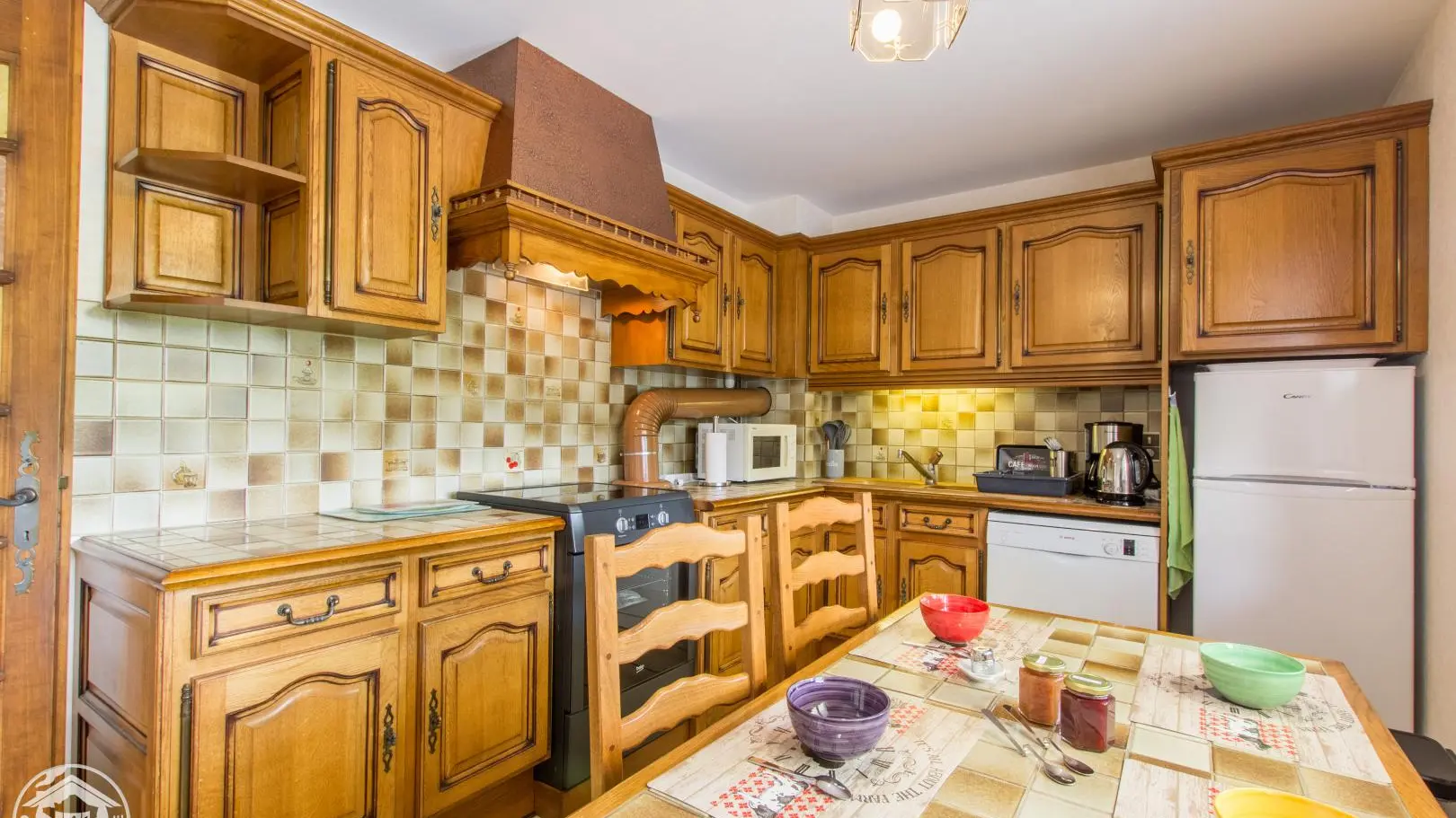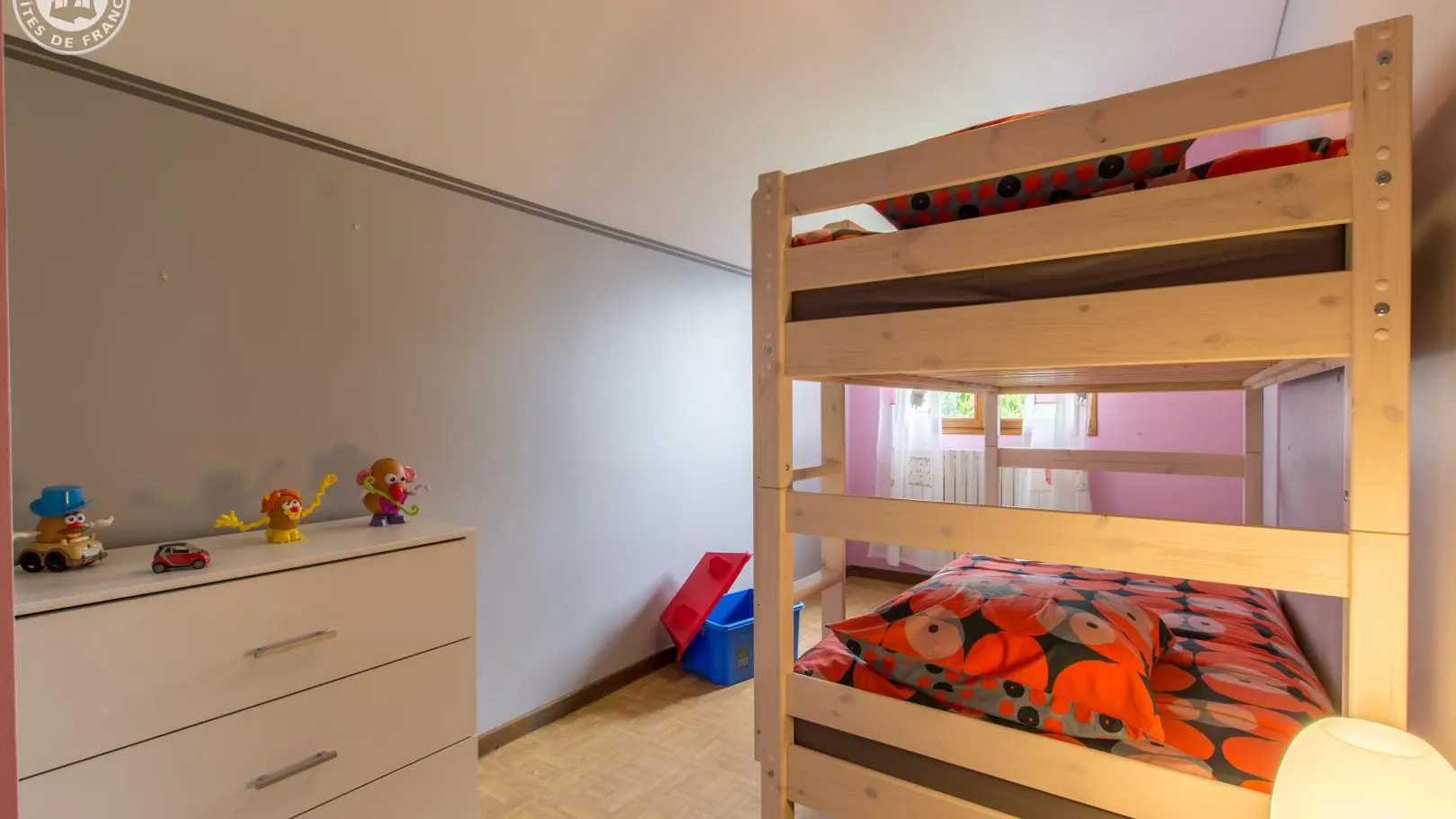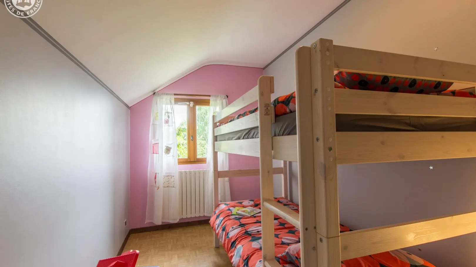 A l'étage: chambre 1 (1 lit 140x190cm), chambre 2 (1 lit 160x200cm, balcon), chambre 3 (2 lits 90x190cm superposés), wc indépendant.