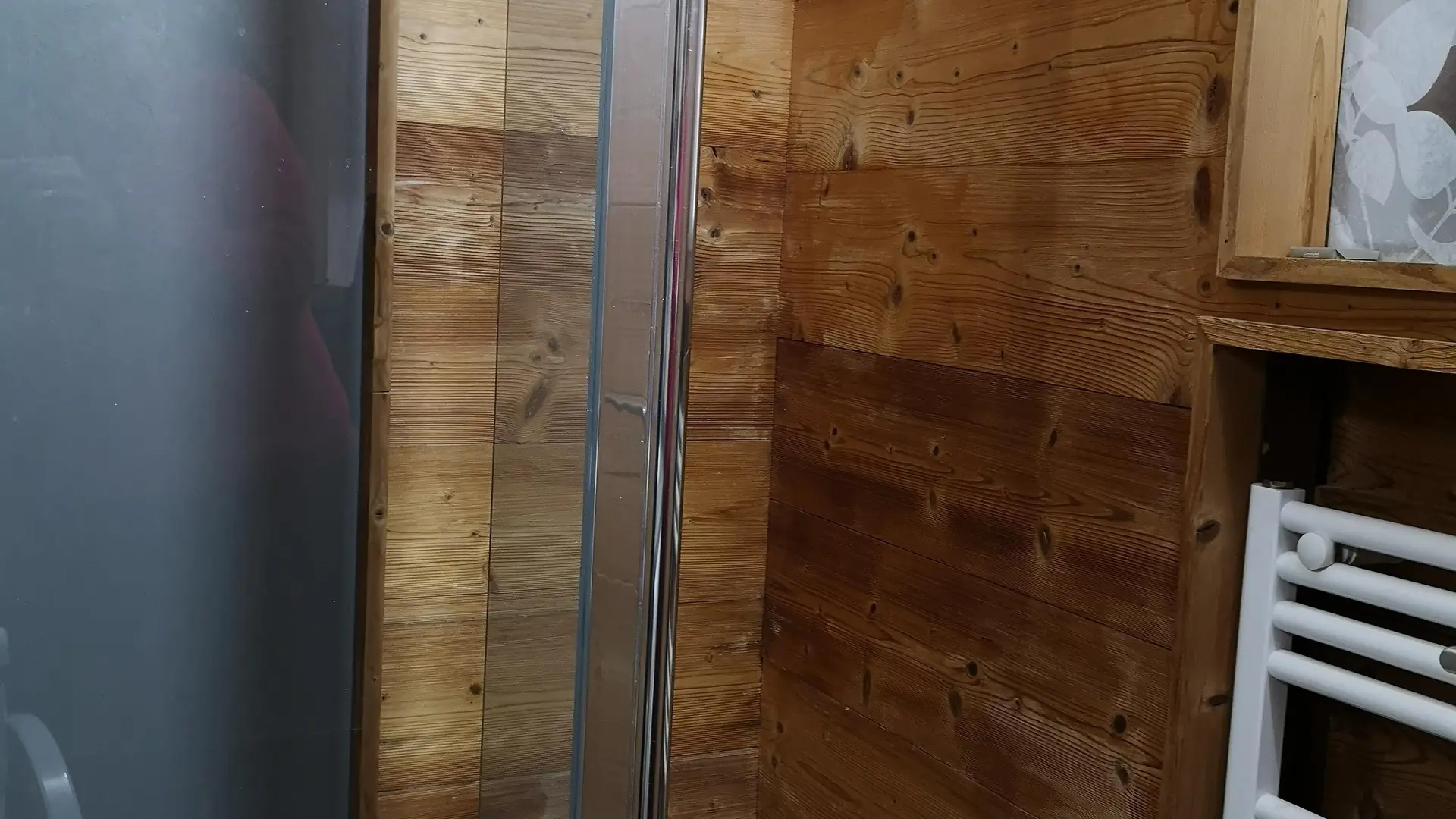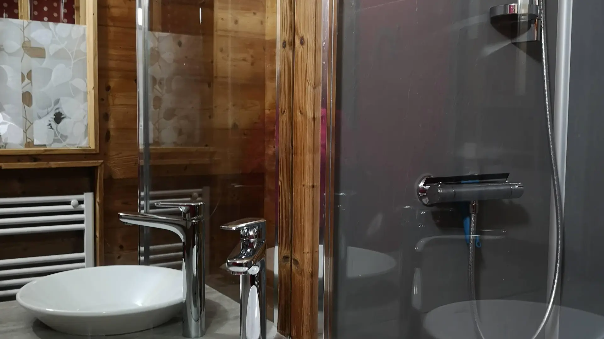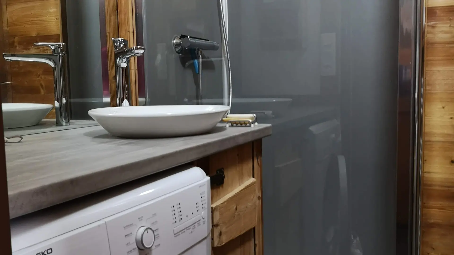 Salle de bains (douche, vasque et sèche serviettes). WC indépendant.