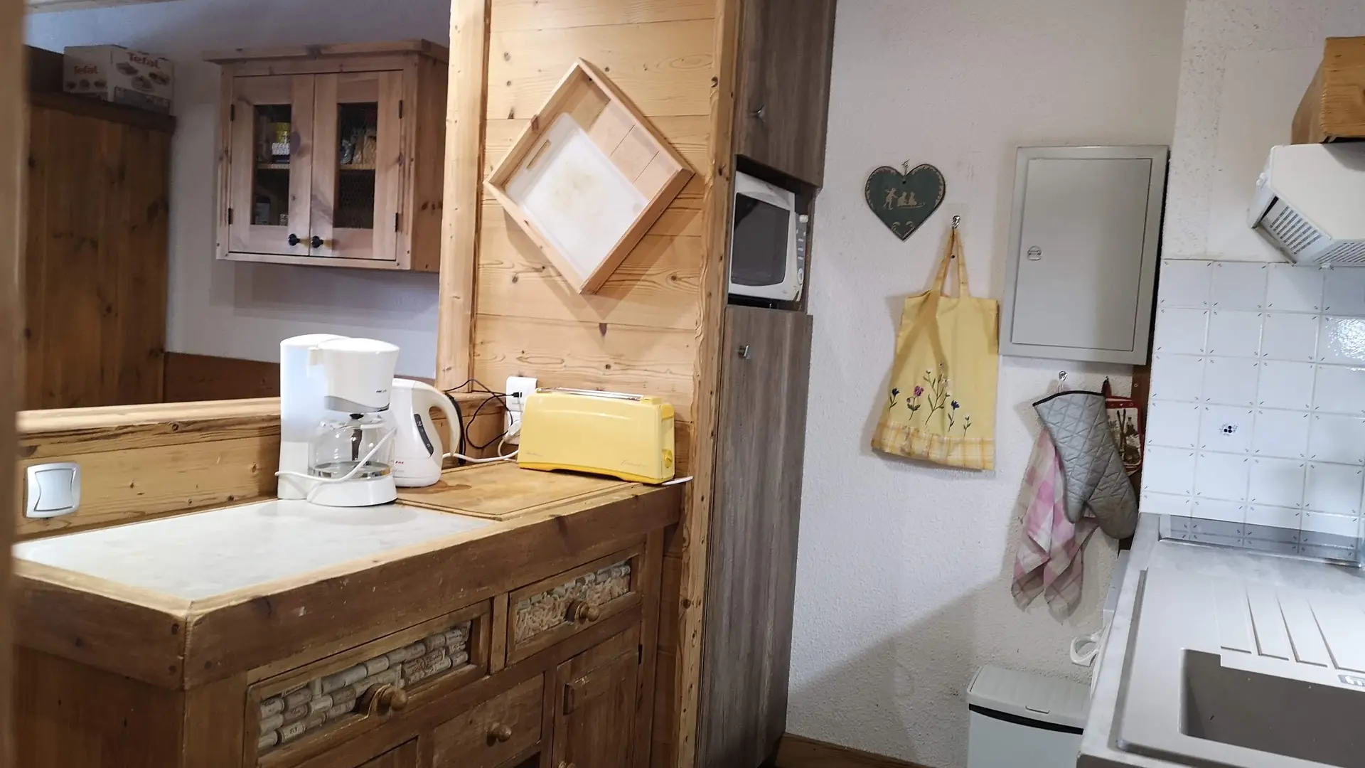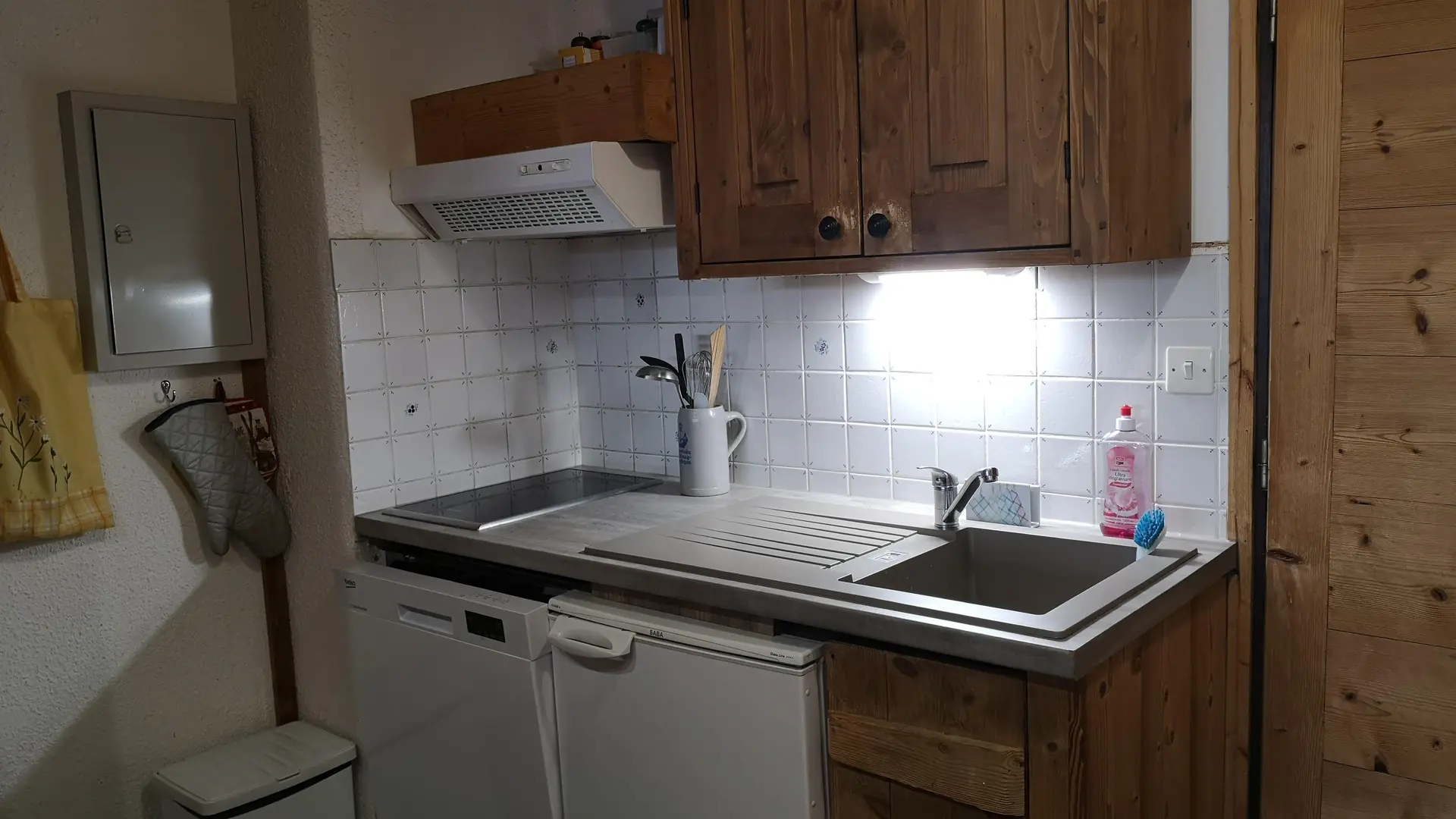 Cuisine avec réfrigérateur, 2 plaques de cuisson à induction avec hotte aspirante, lave-vaisselle, four multifonctions (grill et micro-ondes),mixer, cafetière filtre, bouilloire électrique, grille pain, lave-vaisselle, cocotte minute, wok, appareil à raclette, appareil à fondue.