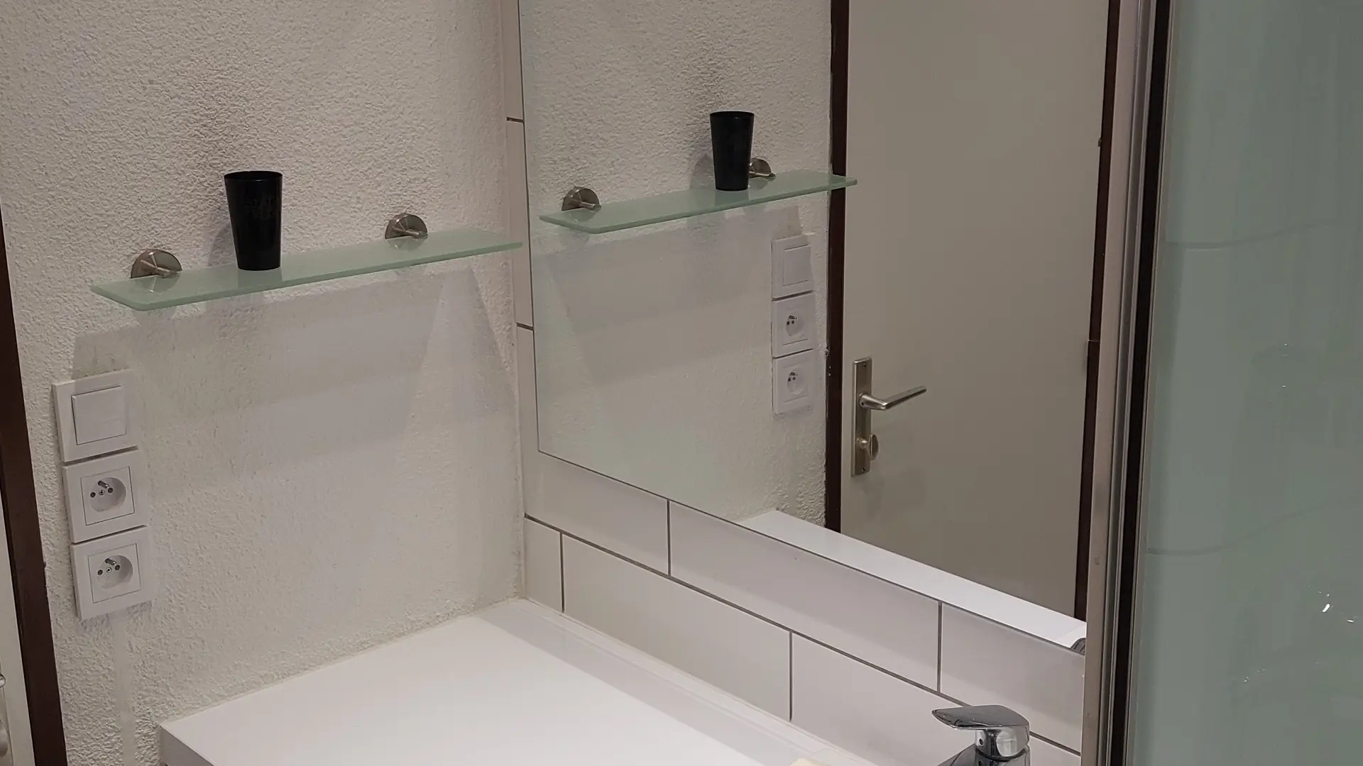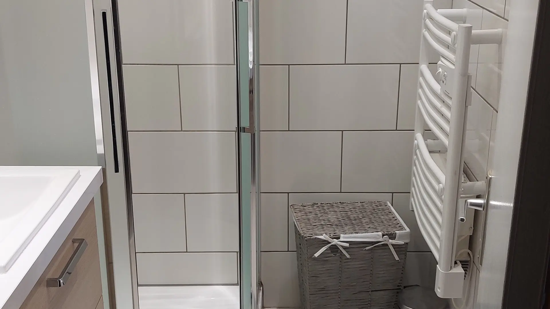 Salle de bains entièrement rénovée avec douche, vasque et sèche-serviettes. WC avec accès indépendant.