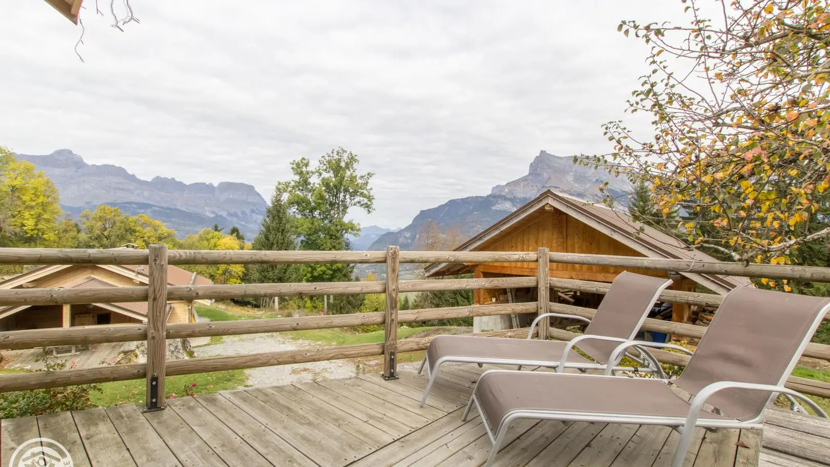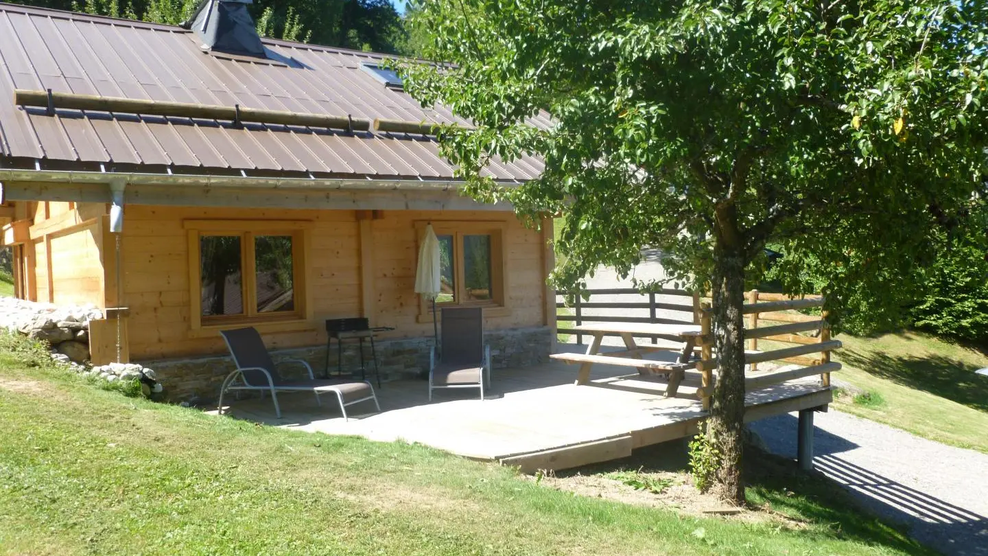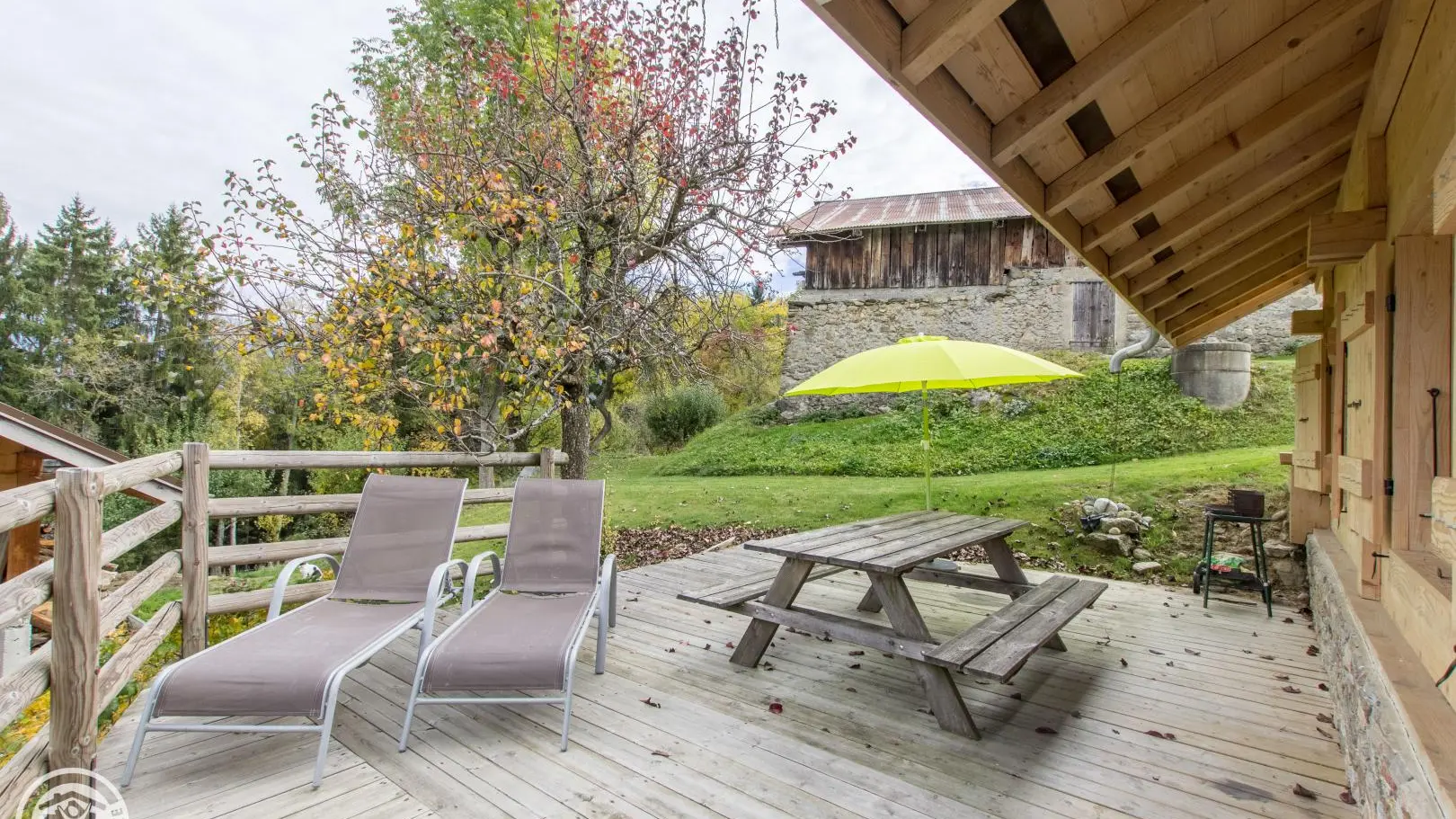 Terrasse avec table forestière, barbecue et transats. En été, place de parking devant le chalet ou sous abri en contrebas.