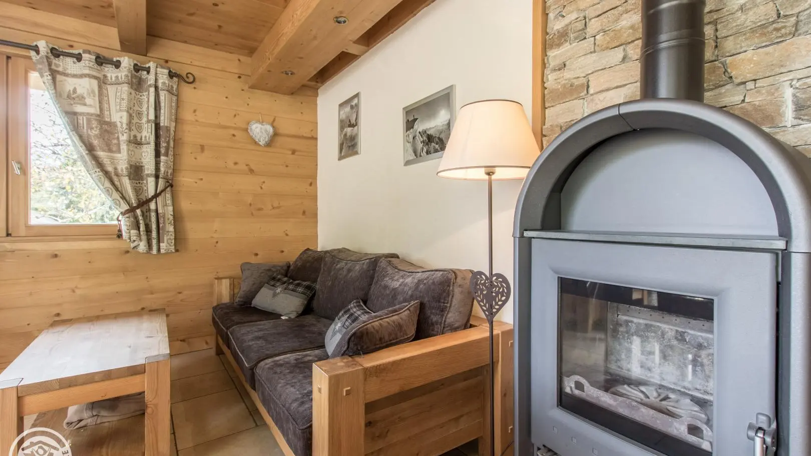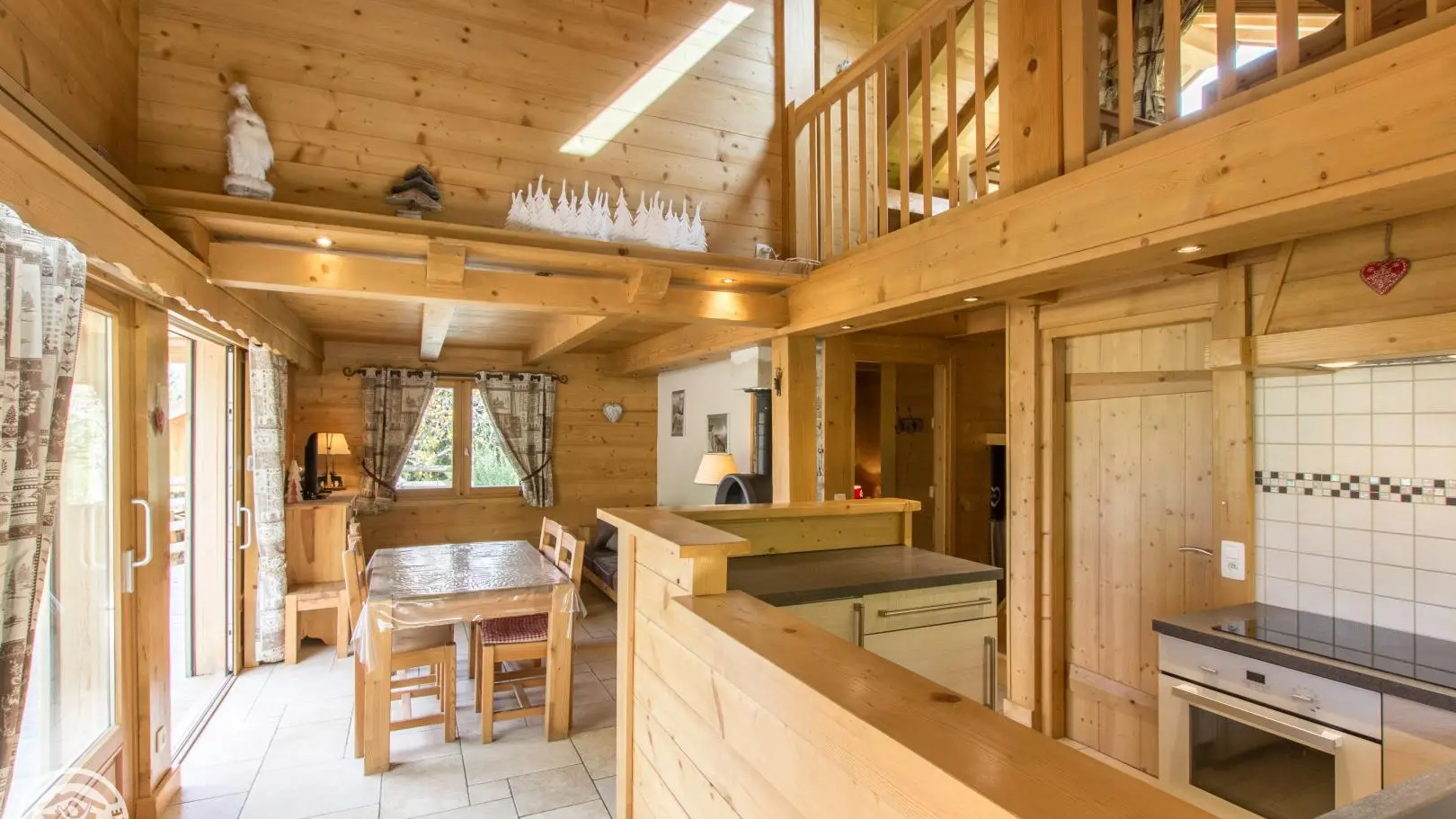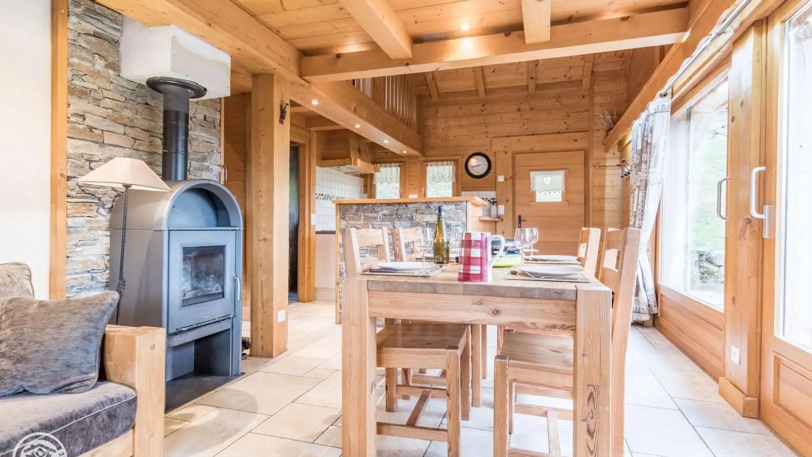 Chalet indépendant de 48m2 (+mansardes) aménagé sur 2 niveaux. Ambiance et décoration chaleureuse typiquement savoyarde. Au rez-de-chaussée: cuisine intégrée ouverte sur séjour (canapé, Tv, poêle à bois), chambre 1 (1 lit 140x190cm), salle d'eau (douche) avec wc.
