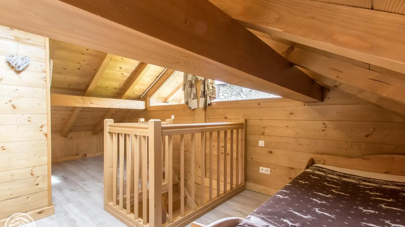 A l'étage: chambre 2 (1 lit 140x190cm), mezzanine avec 1 lit d'appoint 90cm. Les draps sont fournis.