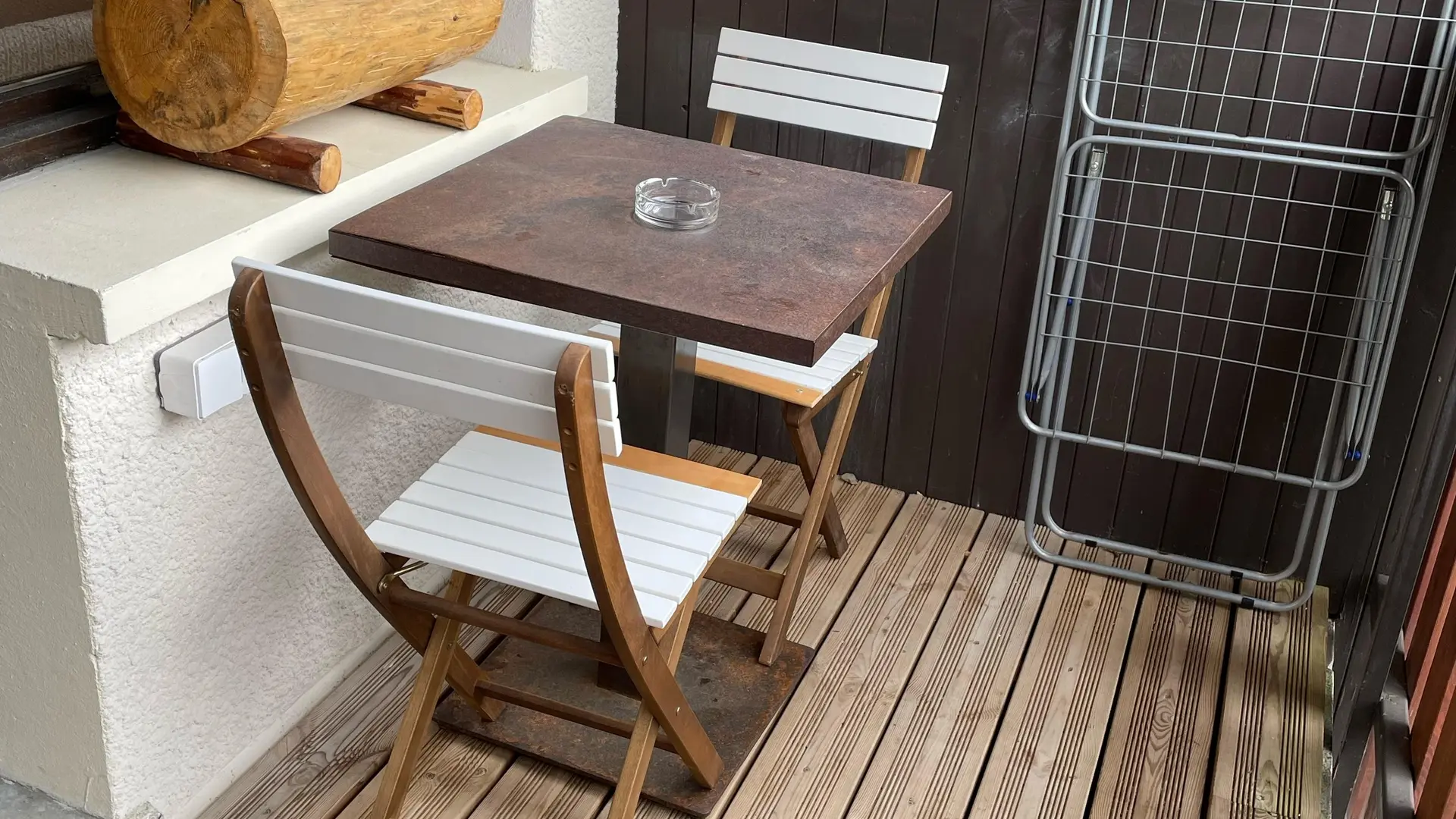 Un séjour avec canapé convertible (2 places), téléviseur écran plat mural, coin repas, table basse.