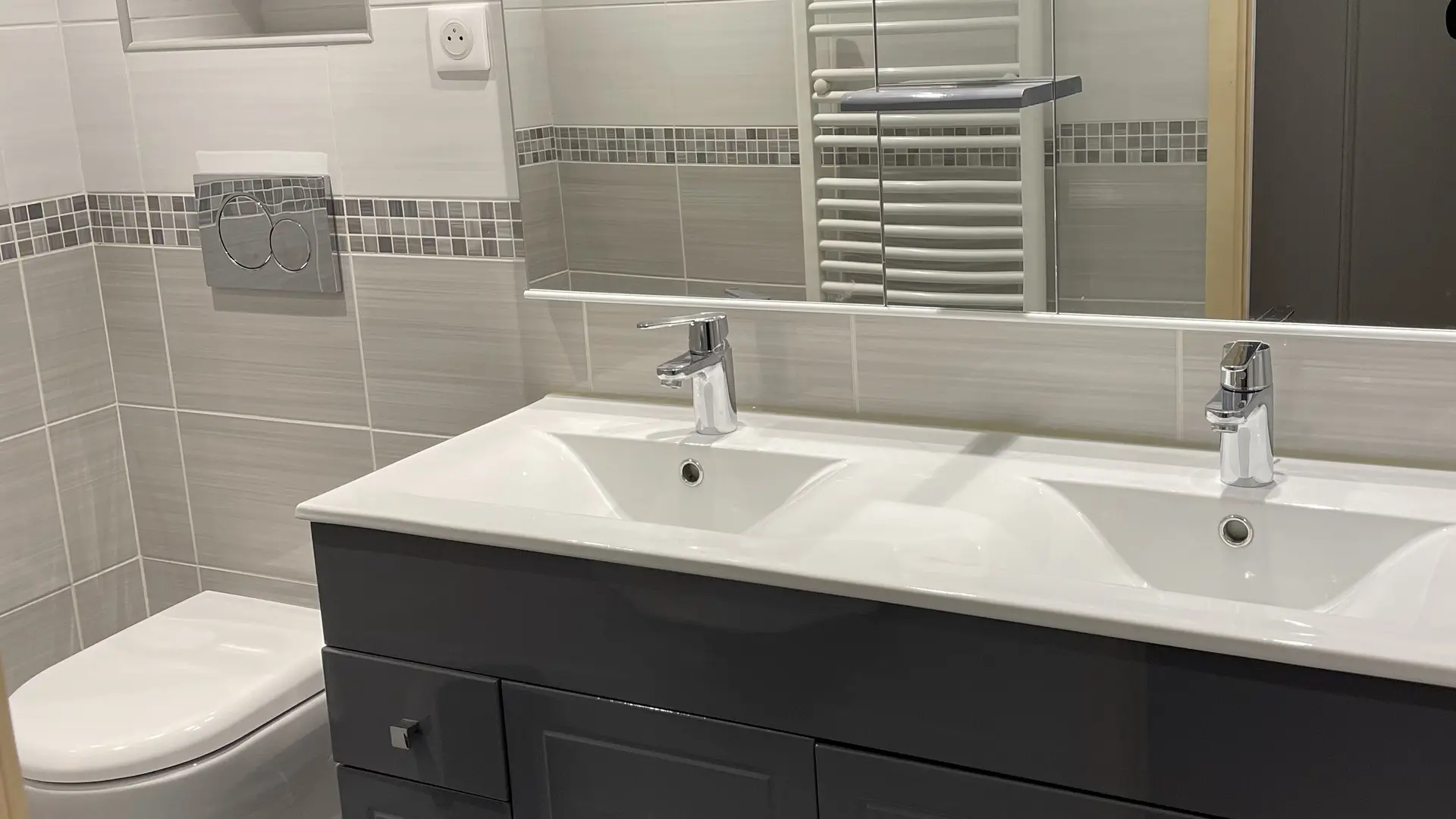 Salle d'eau avec douche et sèche serviettes. WC séparé