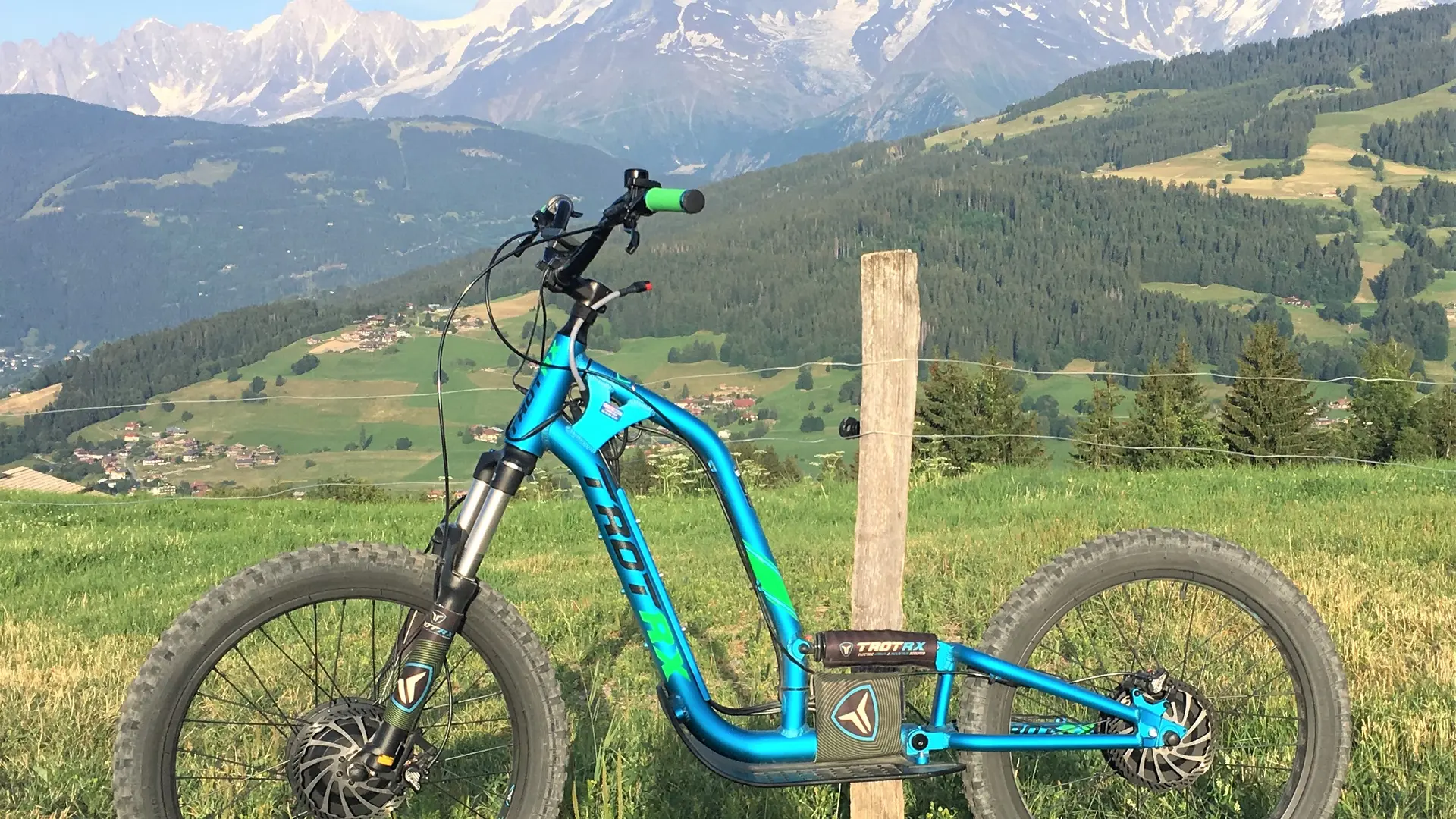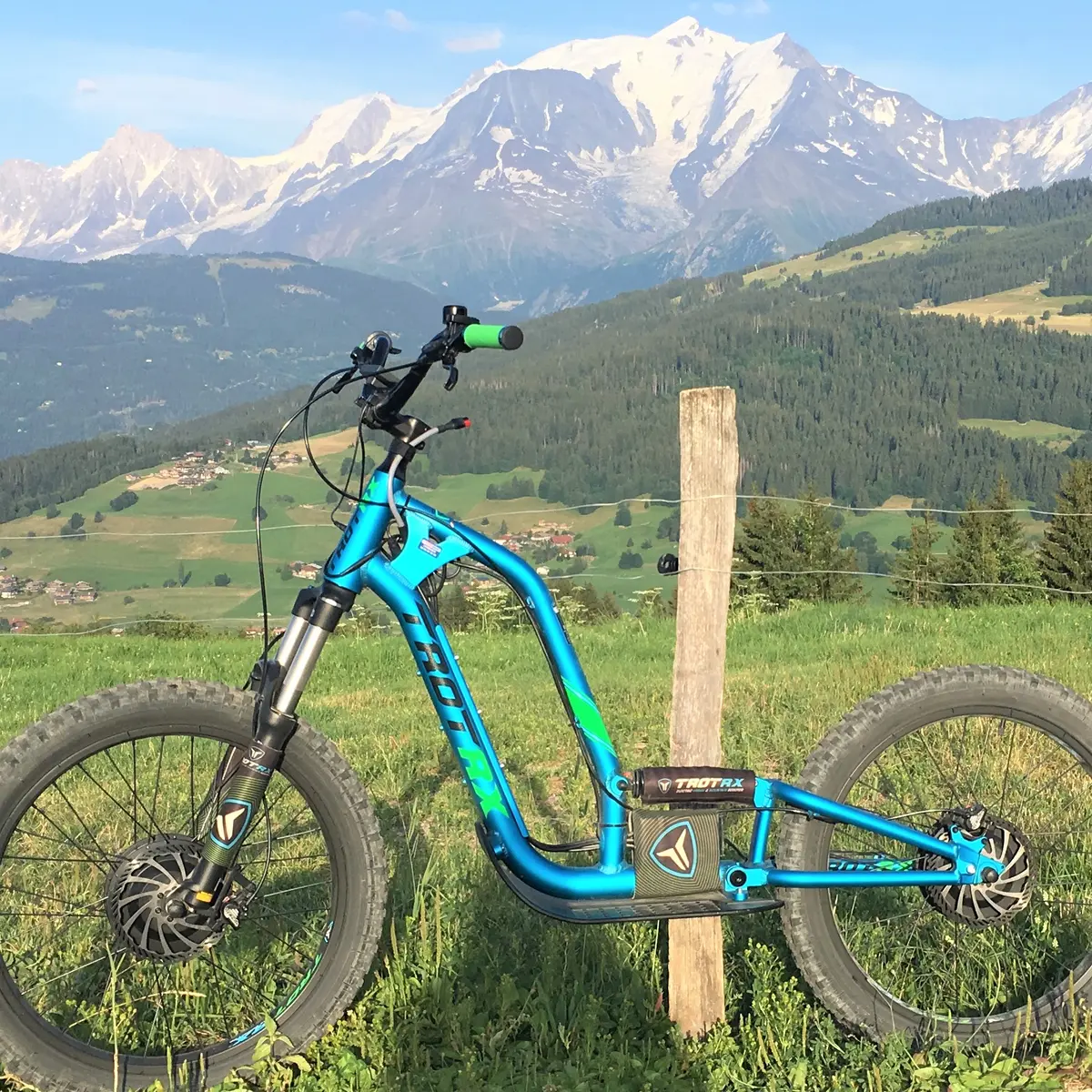 Équipée de deux roues motrices, la trottinette 100% électrique TROTRX offre de réelles performances aux multiples facettes : balade, randonnée tout-terrain, descente, urbaine.