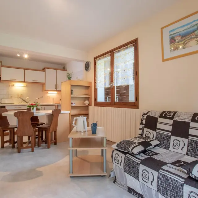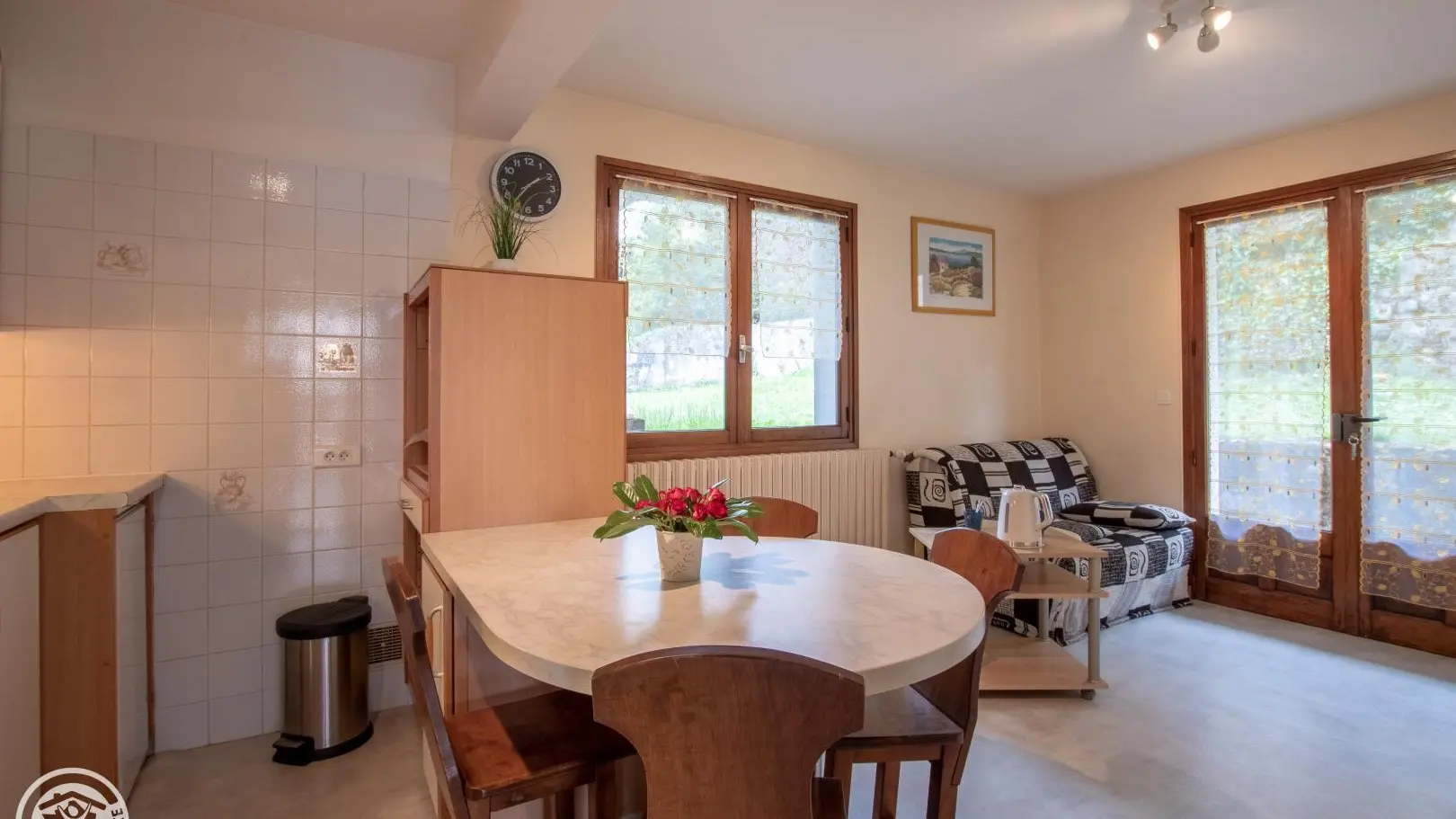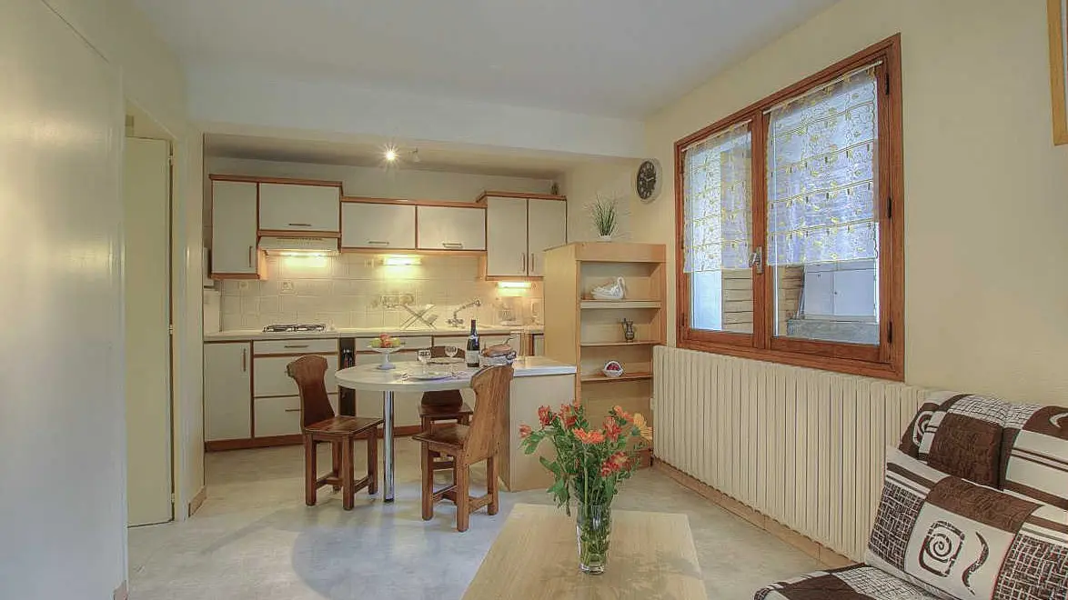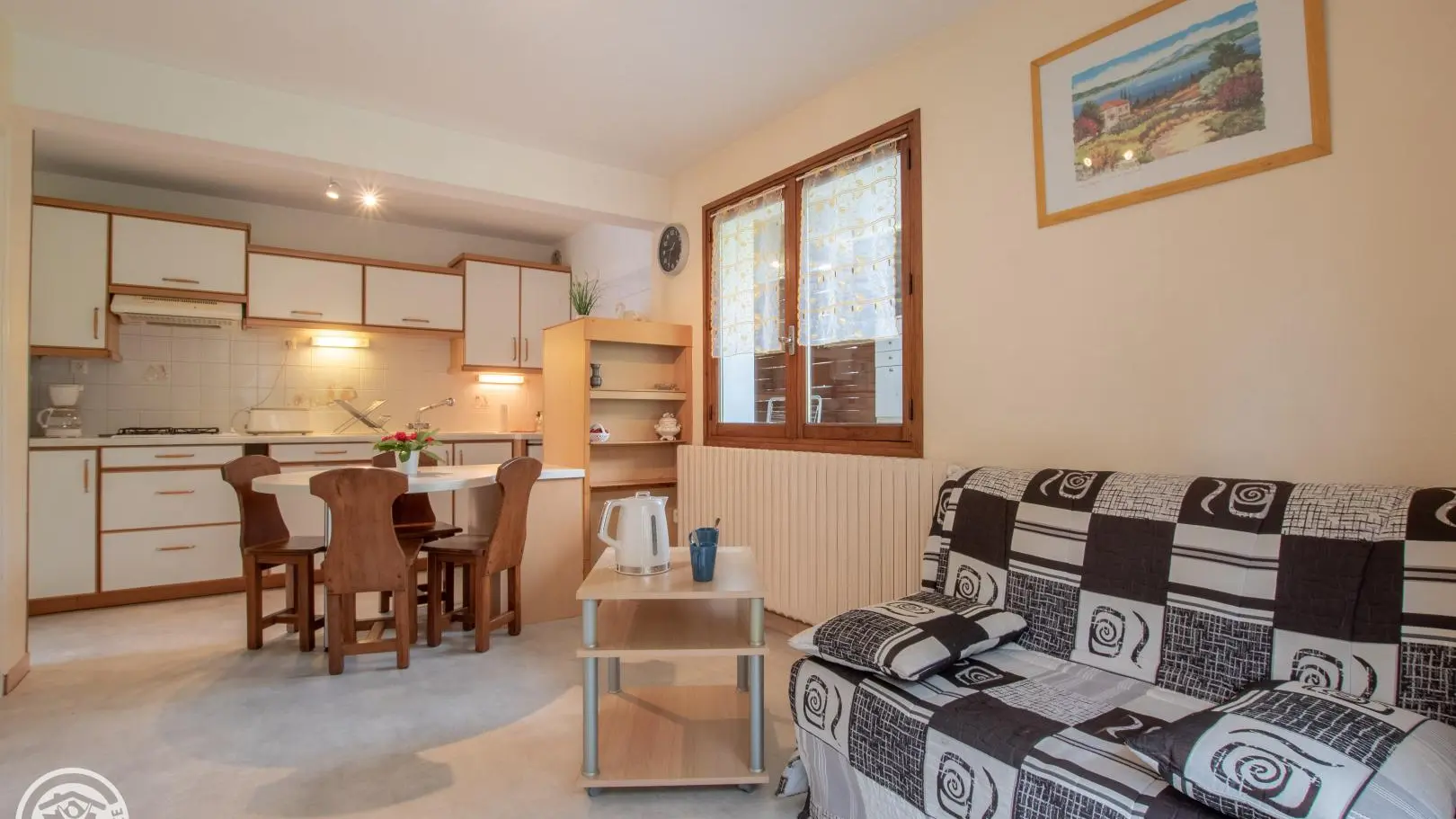 Gîte de 33m2 aménagé en rez-de-jardin d'une maison mitoyenne comprenant également 2 autres gîtes. Entrée indépendante et de plain pied : cuisine intégrée ouverte sur séjour (banquette), chambre (1 lit 140x190cm), salle d'eau avec douche et wc.