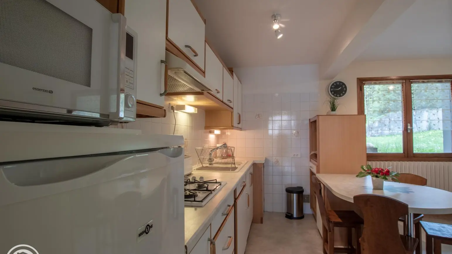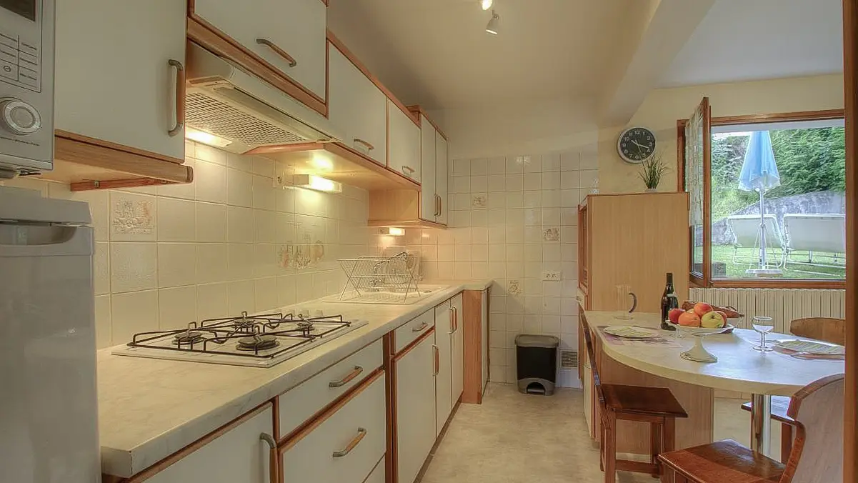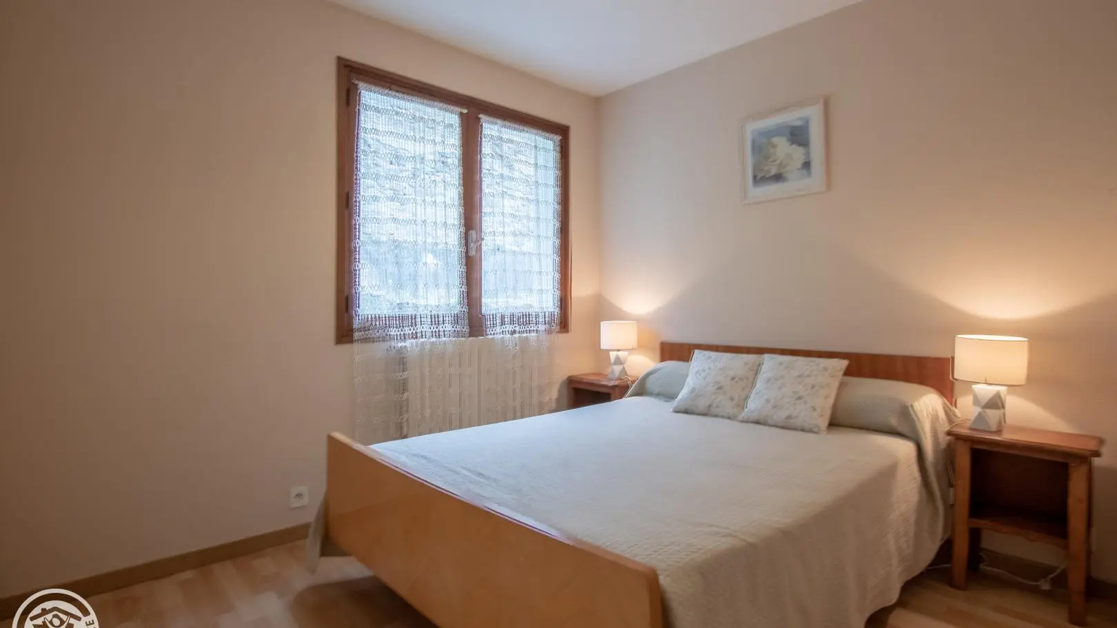 Gîte de 33m2 aménagé en rez-de-jardin d'une maison mitoyenne comprenant également 2 autres gîtes. Entrée indépendante et de plain pied : cuisine intégrée ouverte sur séjour (banquette), chambre (1 lit 140x190cm), salle d'eau avec douche et wc.