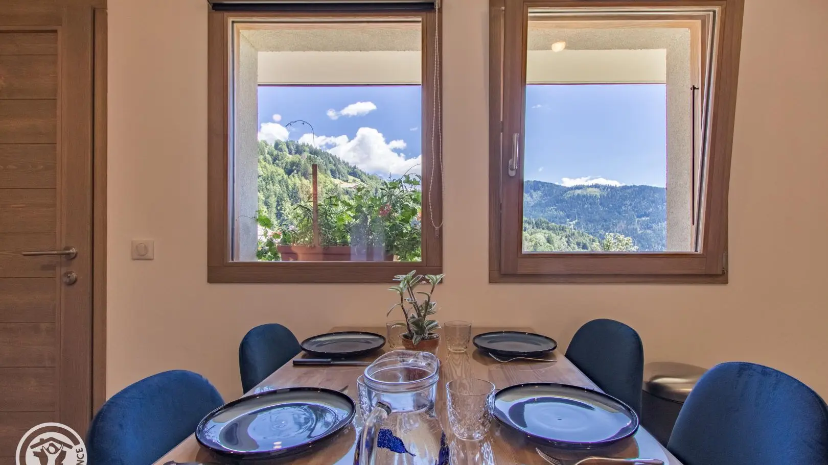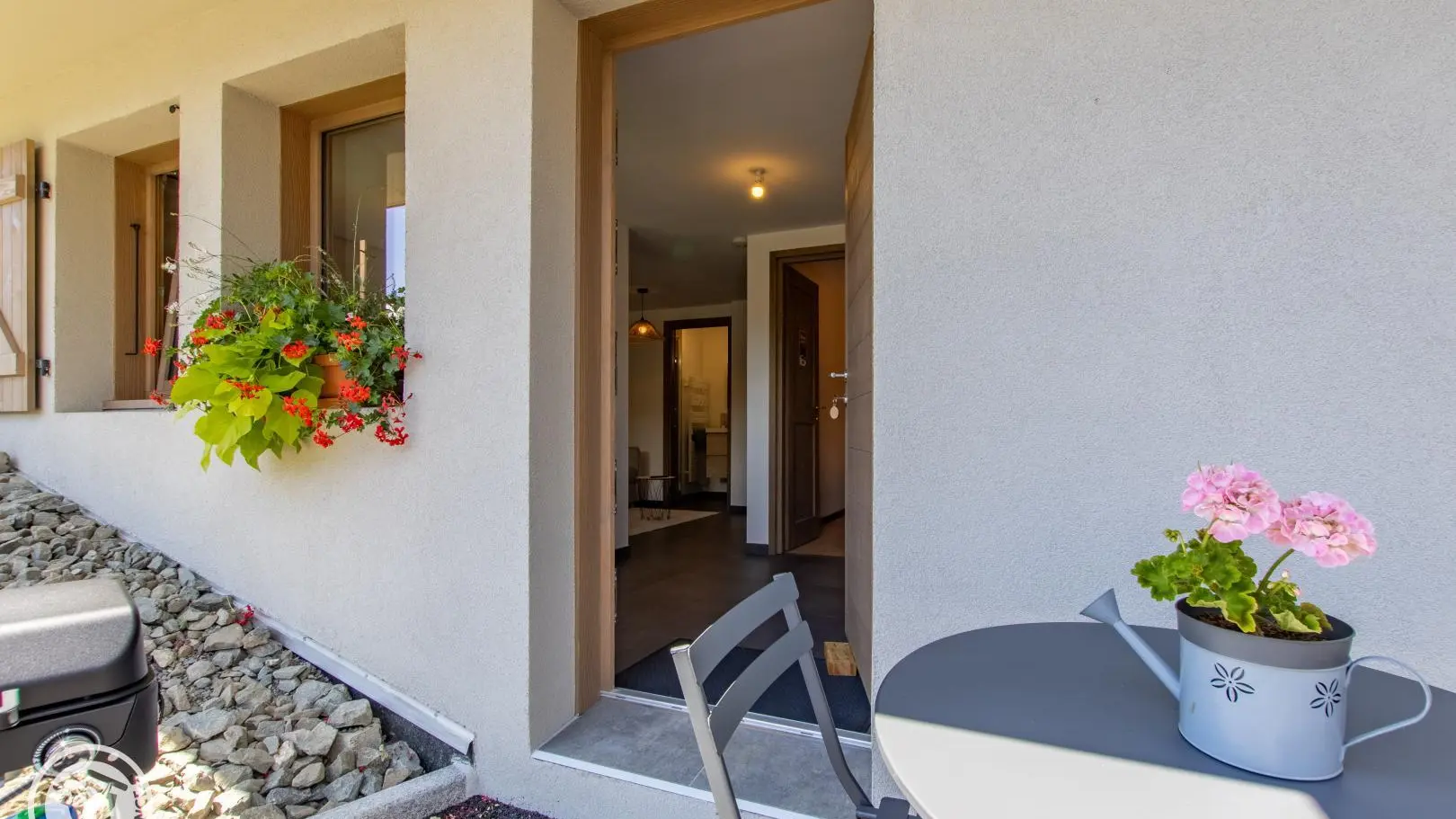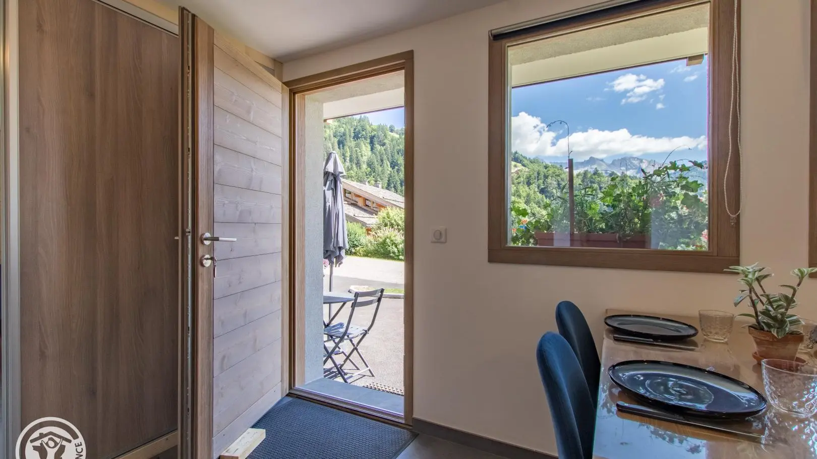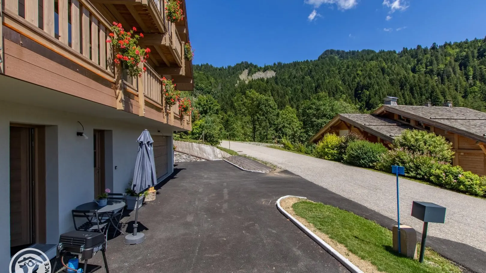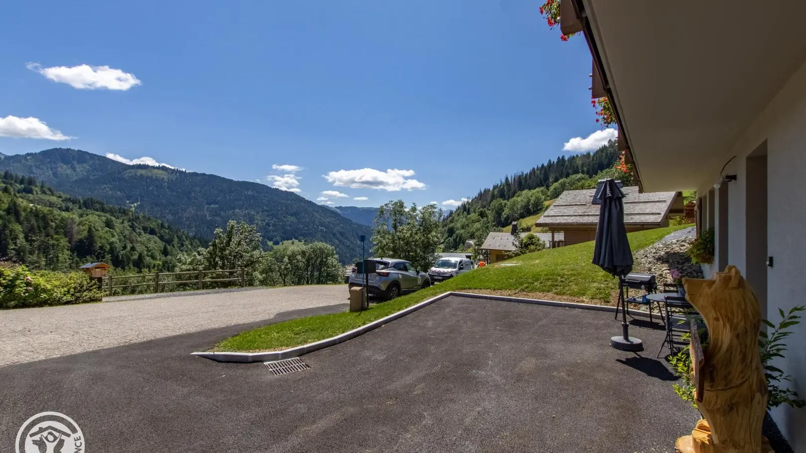 Salon de jardin et barbecue devant le gite sur la cour. Vue sur la chaine des Aravis. 1 place de parking privative devant le gîte.