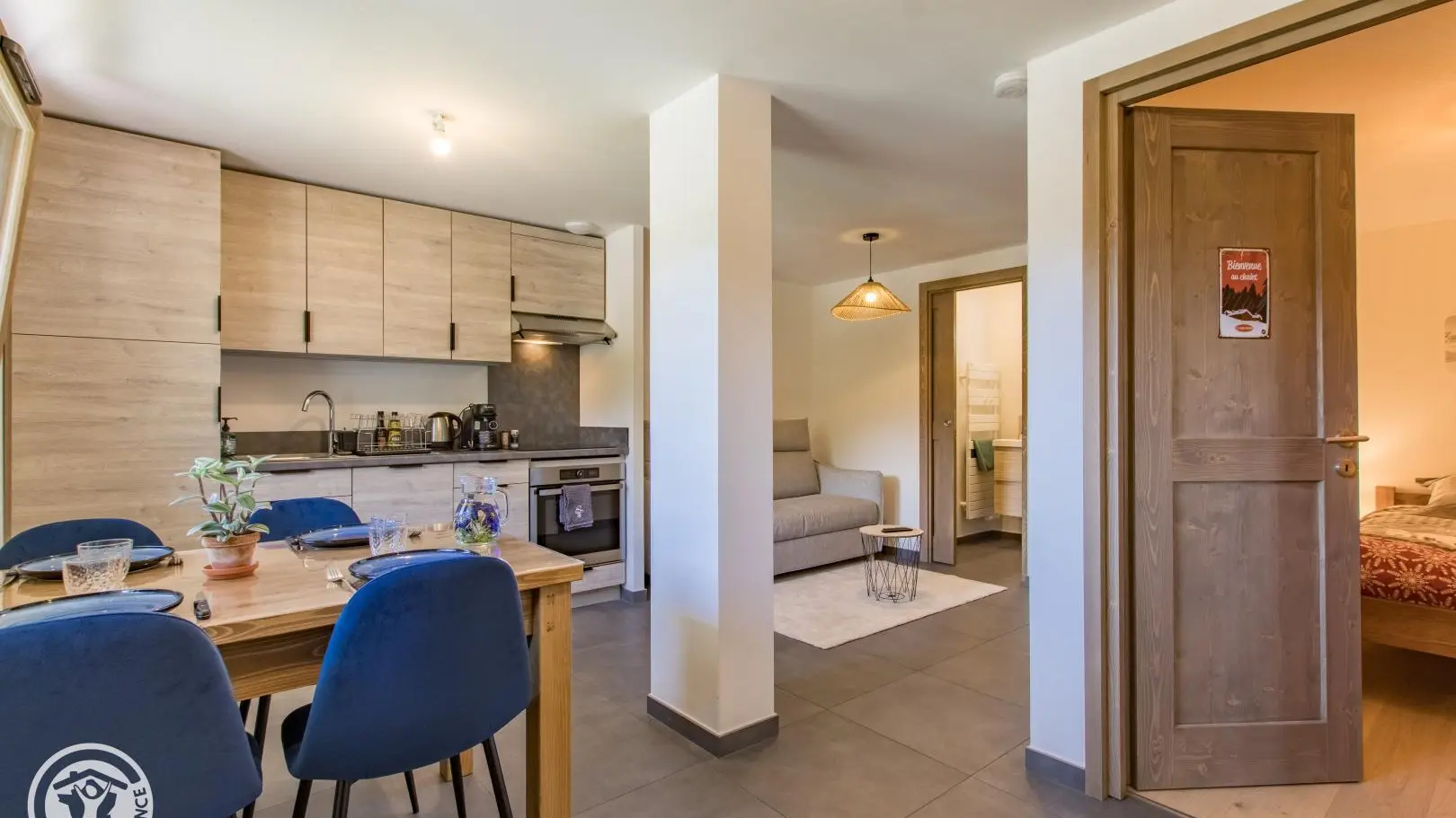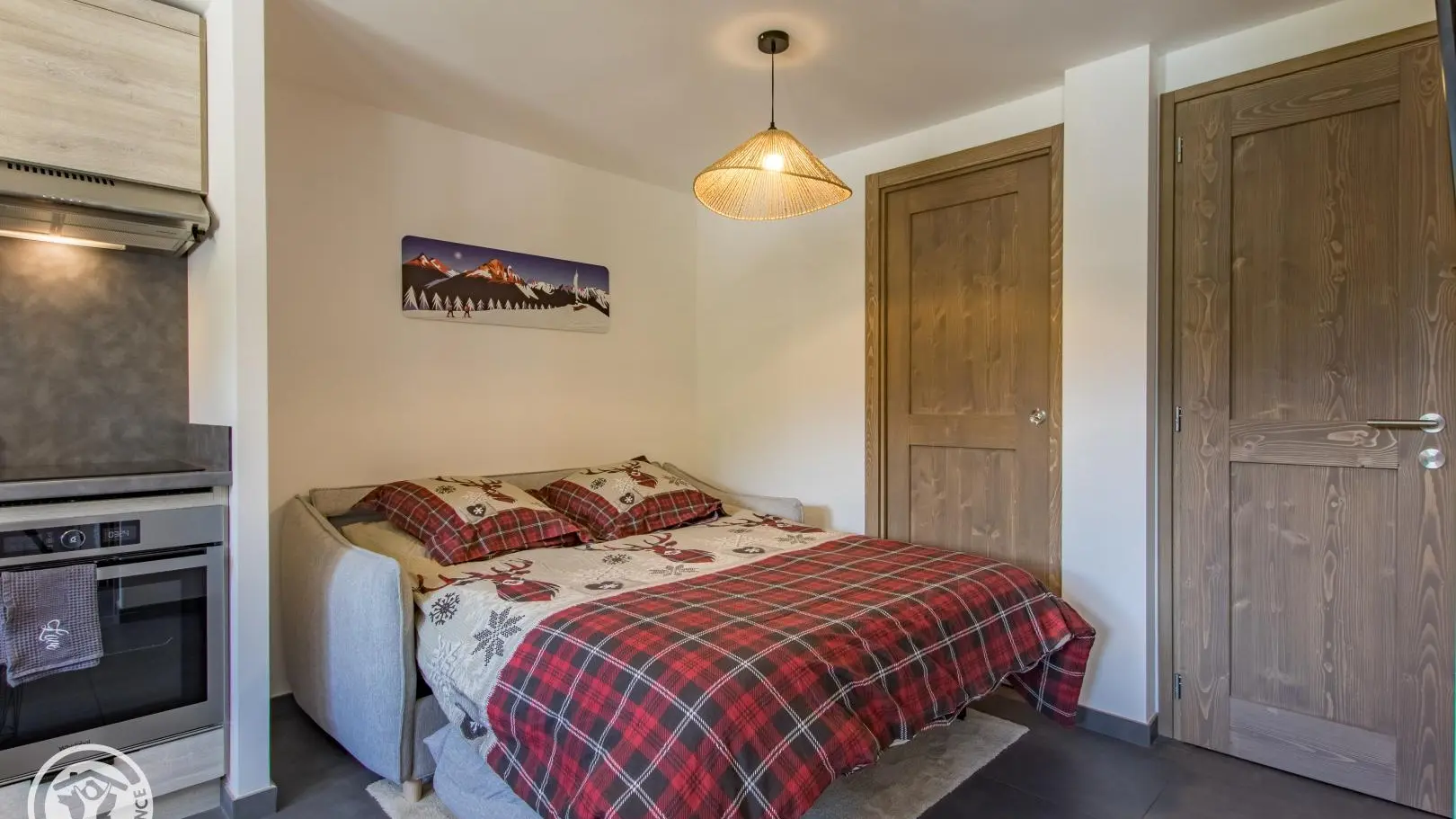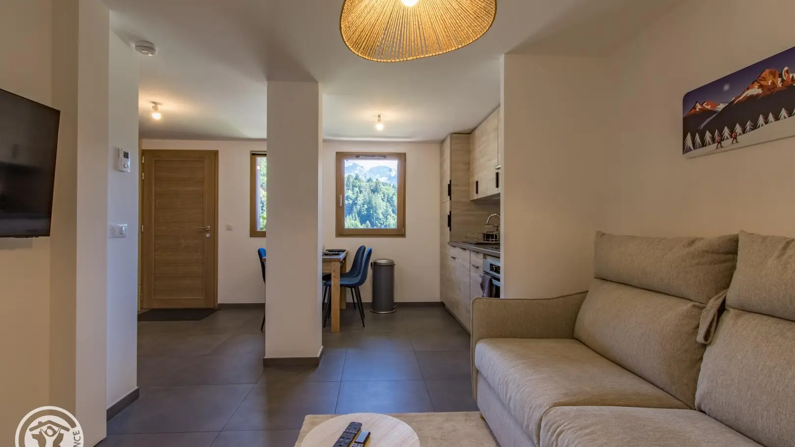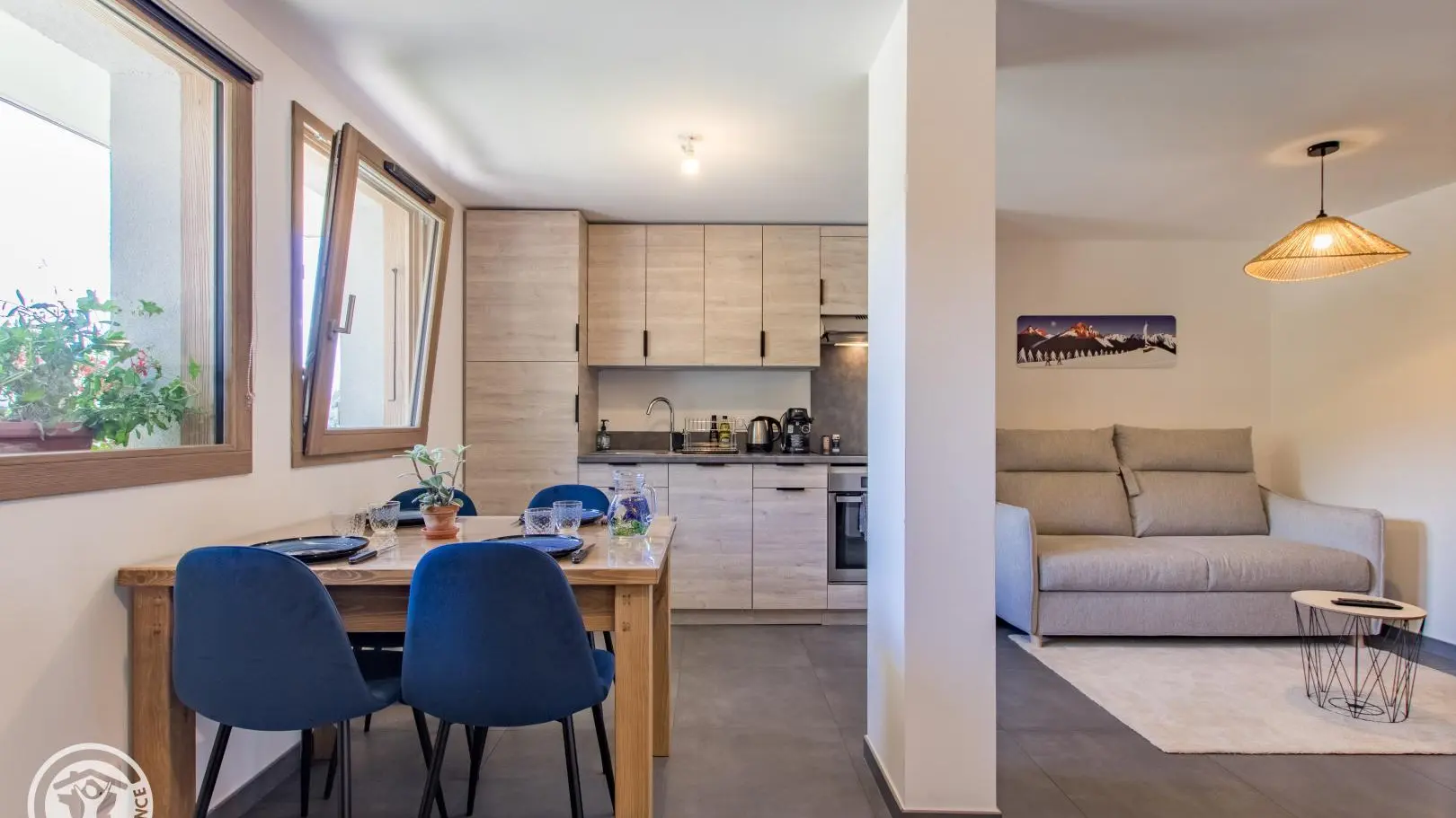 - Cuisine ouverte sur le séjour (table repas, canapé convertible type rapido pour couchage 2 personnes, télévision).