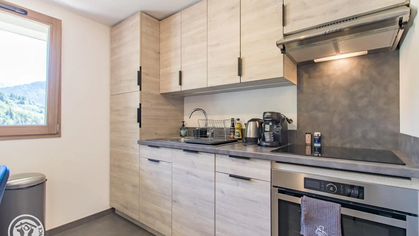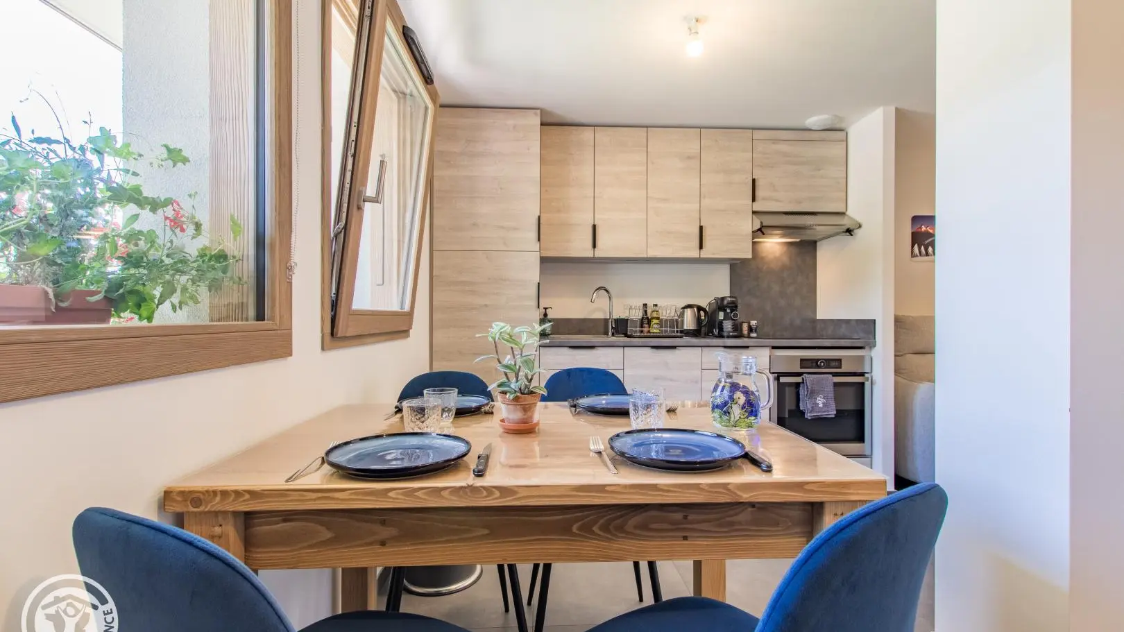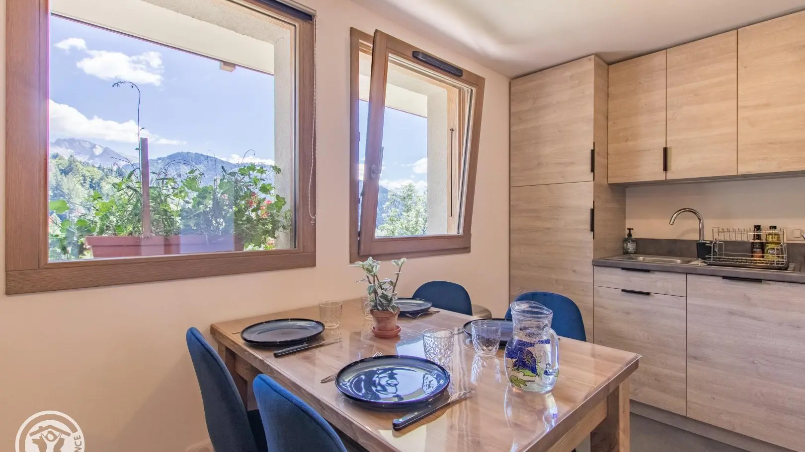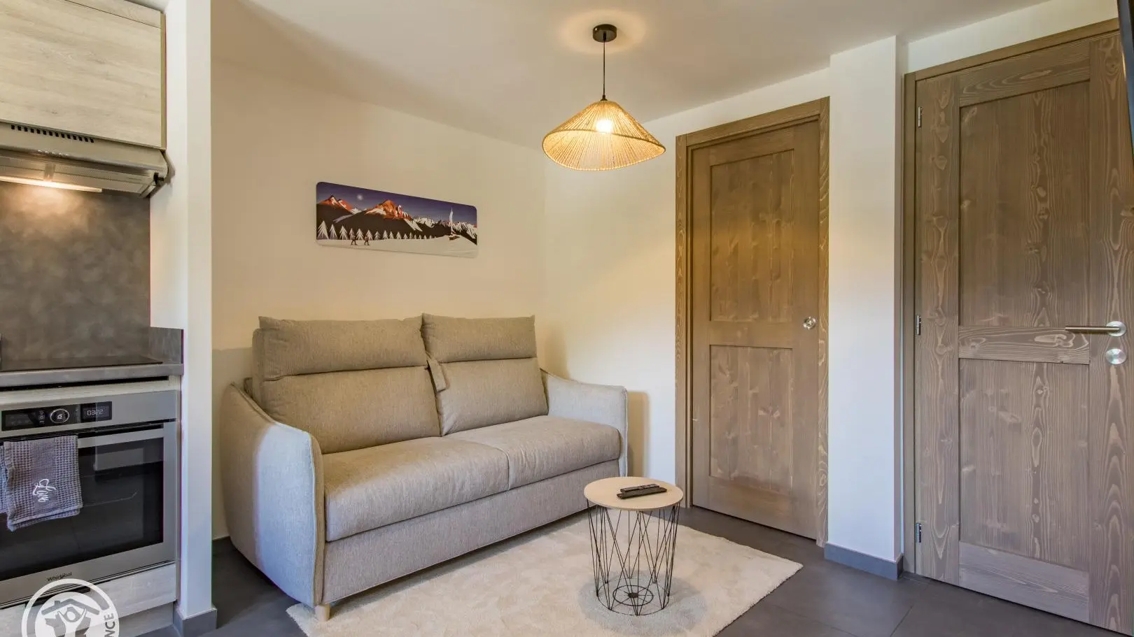 - Cuisine ouverte sur le séjour (table repas, canapé convertible type rapido pour couchage 2 personnes, télévision).