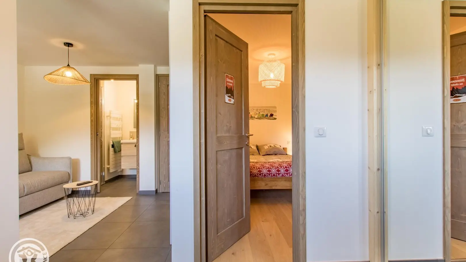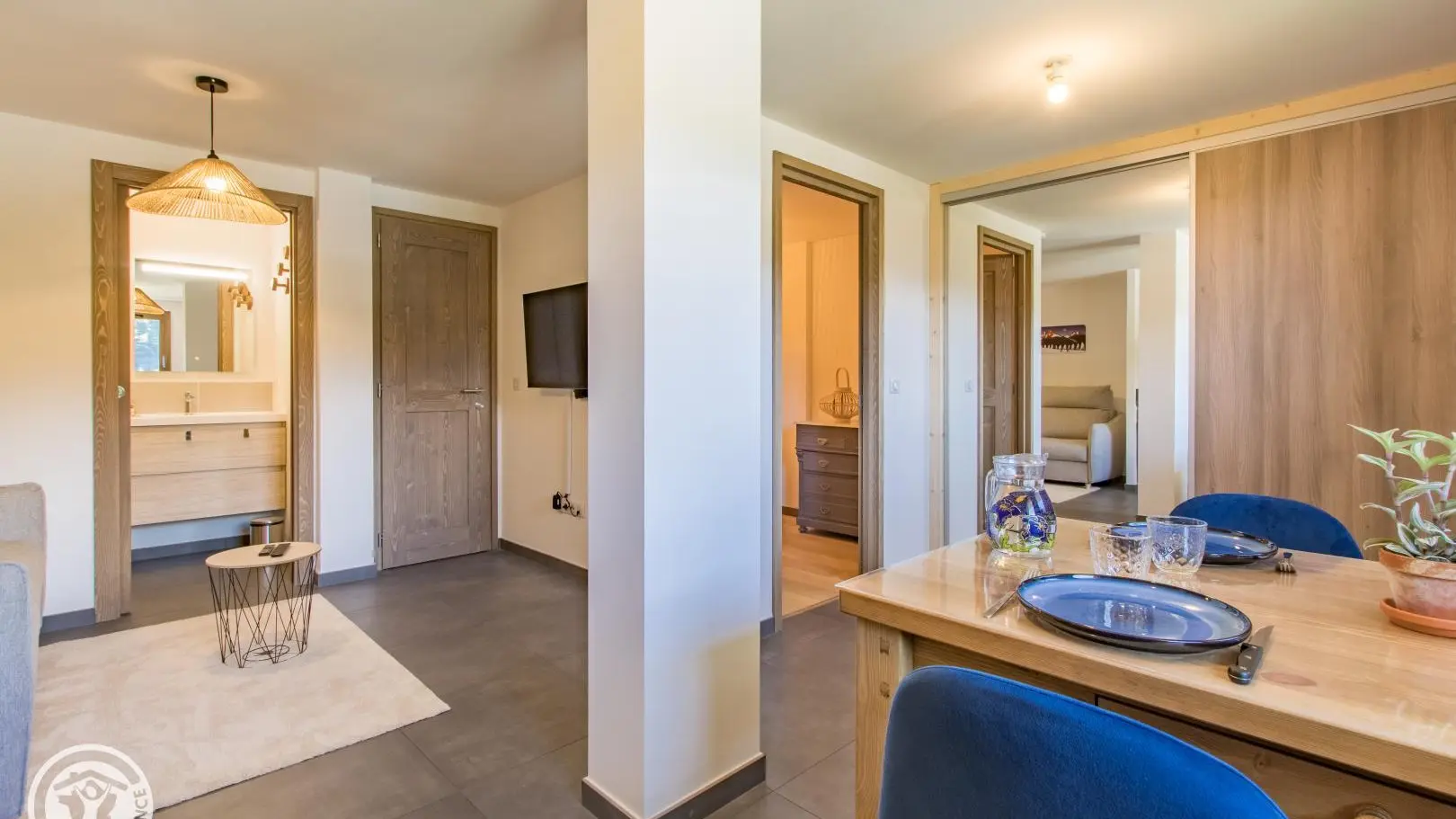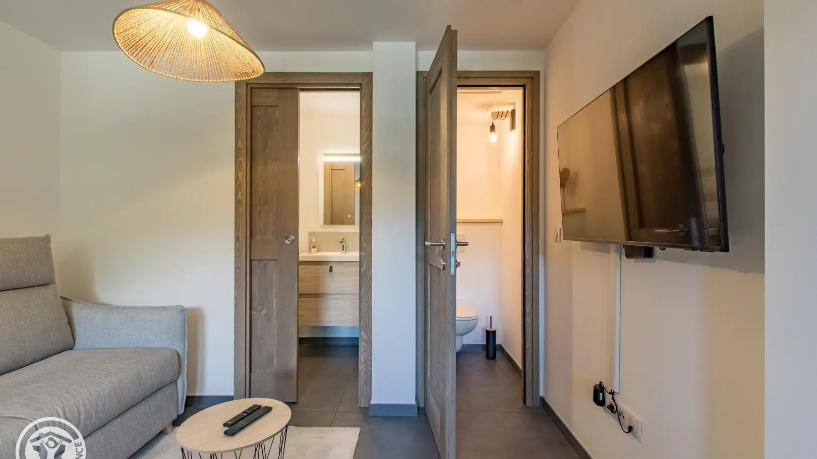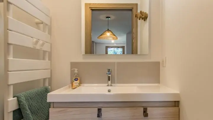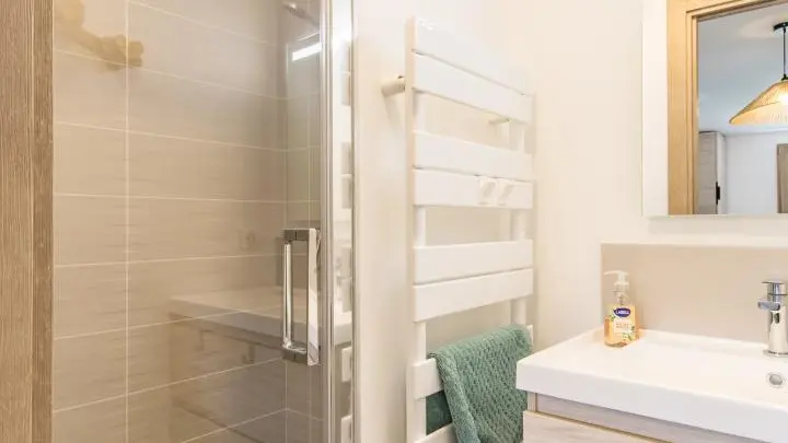 - Salle d'eau : vasque, douche, sèche-serviettes.