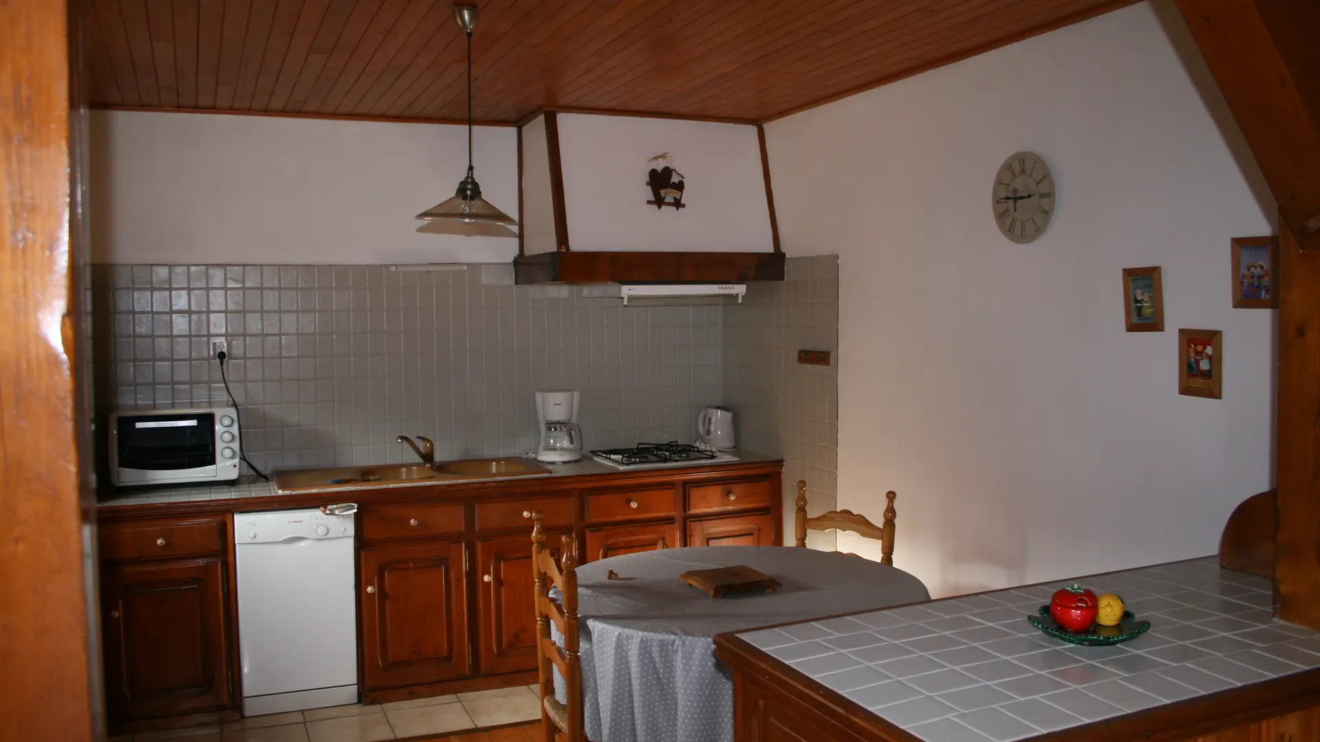 Cuisine ouverte équipé : four, hotte, congélateur, micro-ondes, réfrigérateur, lave vaiselle.