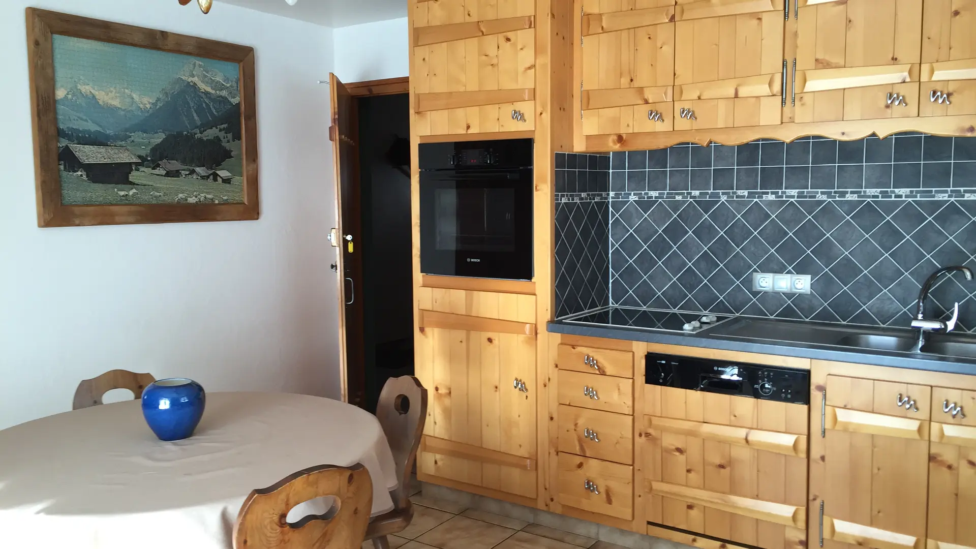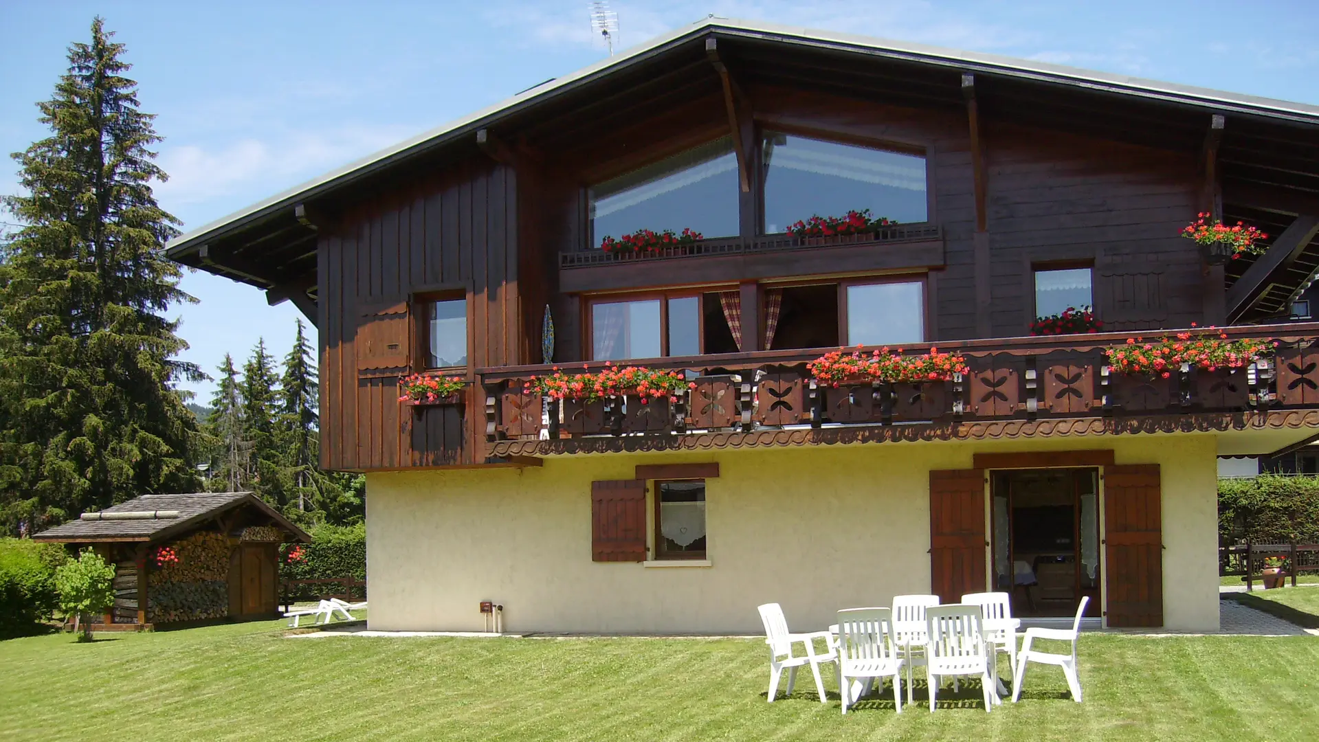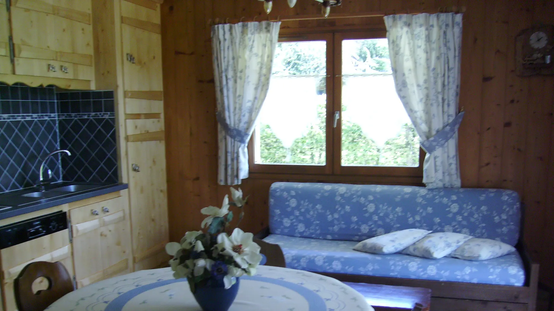 L'intérieur est de caractère montagne, avec beaucoup de bois et meublé dans le style du pays. Le séjour avec son coin-cuisine équipé de façon moderne où rien ne manque : micro-onde, cafetière électrique, grille-pain, batteur électrique, service à raclette, à fondue, bénéficie d'un ensoleillement maximum (une fenêtre à l'est et une porte-fenêtre au sud coté pelouse). Télévision et lecteur DVD. WIFI. Bouquins et guides pratiques sur la station sont à votre disposition.