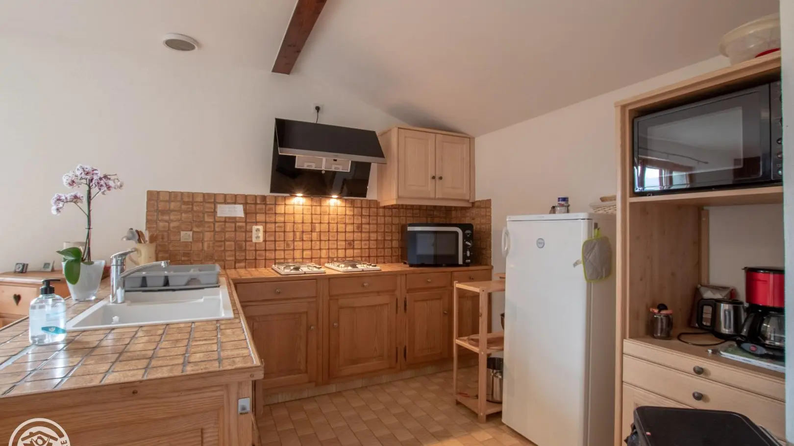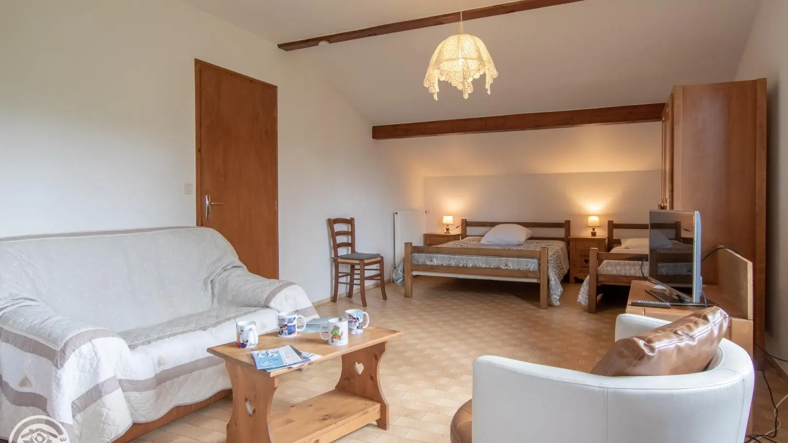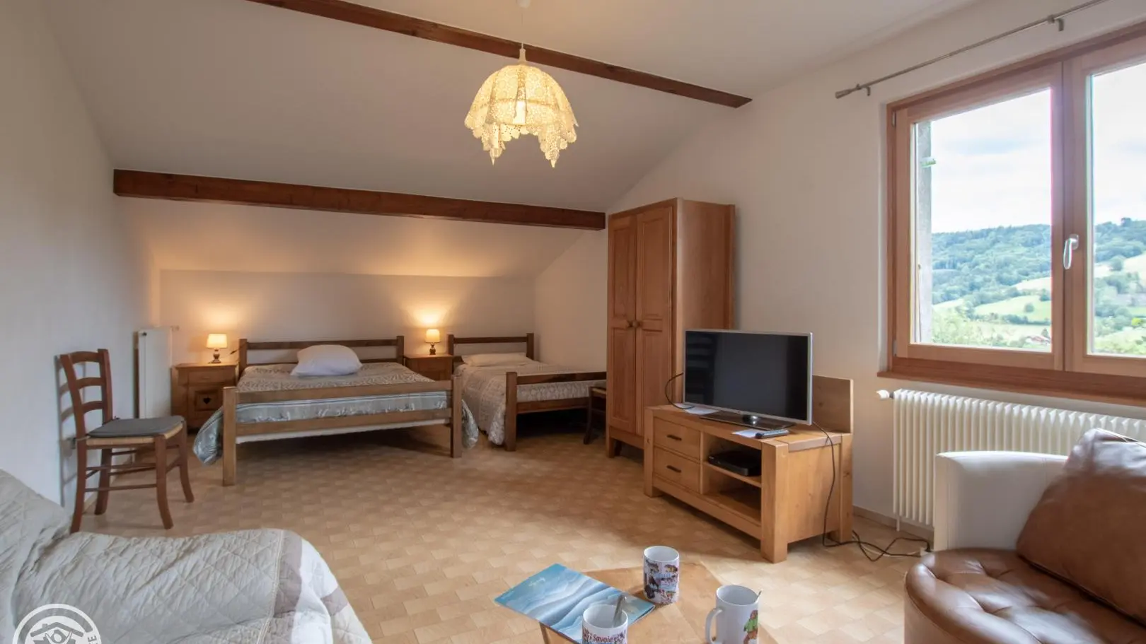 Belle vue sur les montagnes de la Vallée Verte : Gîte de 75 m2 aménagé au 1er étage de la maison des propriétaires. Cuisine (m-ondes) ouverte sur espace repas. Séjour / chambre séparé par une cloison mobile (Prise TV, 1 lit 140 cm, 1 lit 90 cm), Chambr...