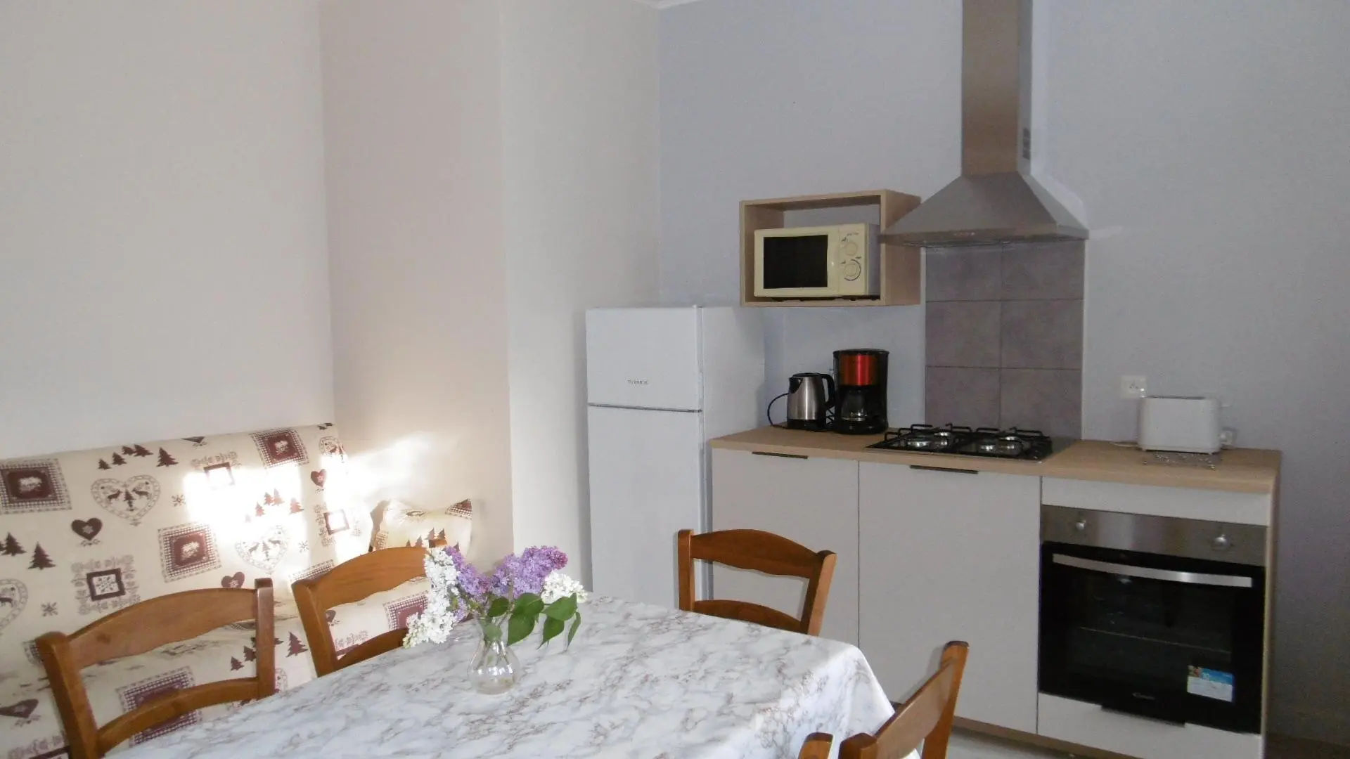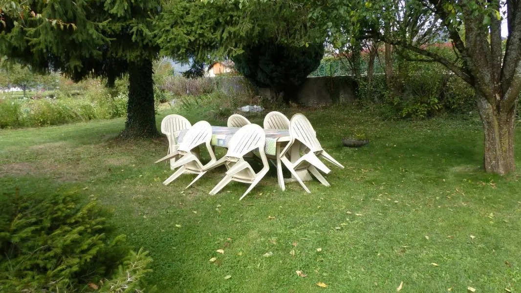 Au pied du Massif du Clergeon, entre lac d'Annecy et lac du Bourget : Gîte de 61 m2 au 1er étage d'une maison comprenant un logement de la famille. Cuisine-séjour, Chambre 1 (1 lit 140 cm), Chambre 2 (1 lit 140 cm), Chambre 3 (2 lits 90 cm), salle de bains, WC. Petit balcon fermé, terrasse avec salon de jardin, terrain, cour commune. Chauffage électrique. Base de loisirs à Rumilly (4km). Nombreux sentiers balisés sur la commune.