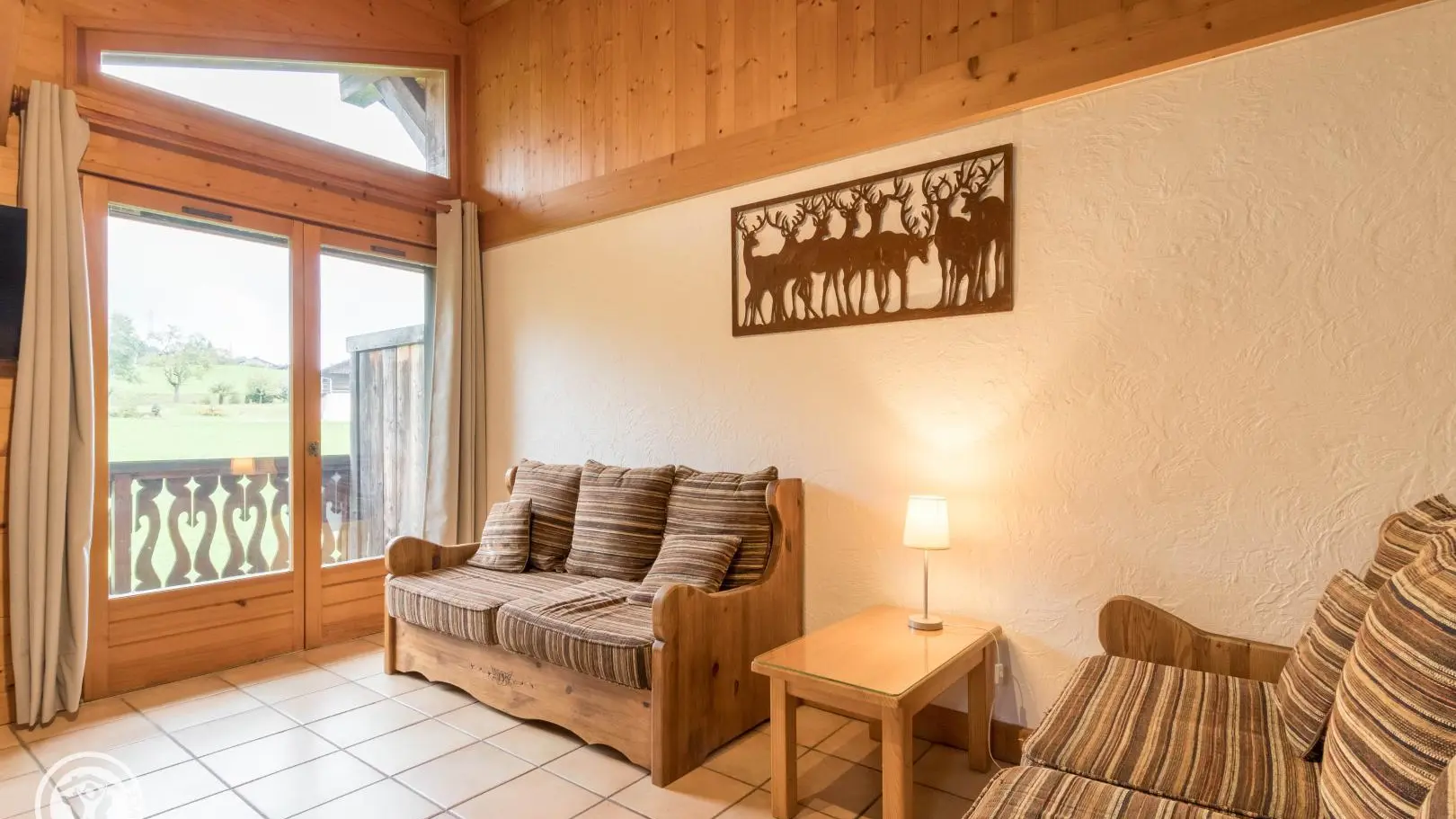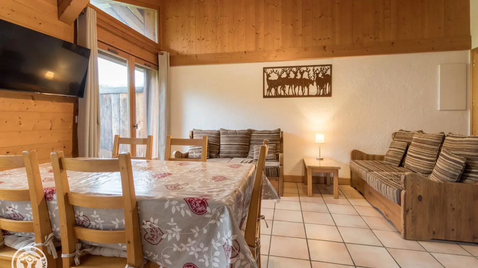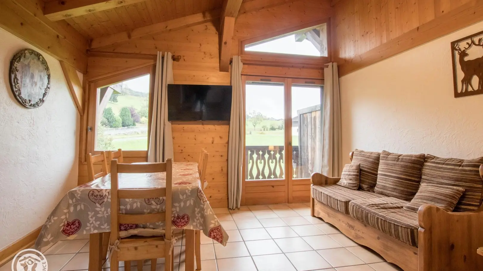 Gîte de 51m2 (dont 4m2 mansardés) aménagé au 2ème étage d'un chalet comprenant le logement des propriétaires et 2 autres gîtes. Cuisine intégrée ouverte sur séjour, Chambre 1 (1 lit 2 pers 160 x 200 cm, et possibilité d'1 lit 80cm d'appoint pour un enfant < 10 ans), Chambre 2 (2 lits 90), Salle de bains, WC indépendant. Buanderie commune au rez-de-chaussée (lave-linge). Chauffage central, balcon, terrain commun, local à ski, salon de jardin, barbecue, possibilité d'une place de garage (en option 30€/s). Jeux enfants. Parking privé. Possibilité de location de draps/et linge de toilette. Télécabine de la Princesse à 300m, Palais des sports Megève à 3Km (piscine, patinoire, remise en forme, tennis,etc...), VTT, promenades en traineau. Gîte en retrait de la route menant à Saint-Gervais. Circuits et parcours raquettes à 1.5km. Plan d'eau biotope à 1.5km. Chamonix à 30km.
