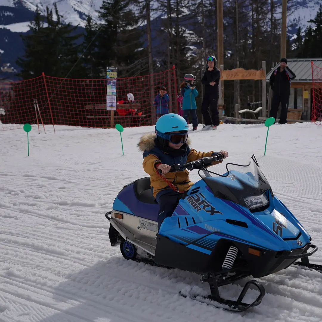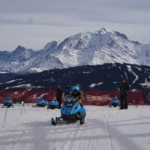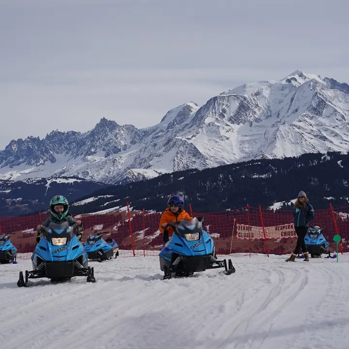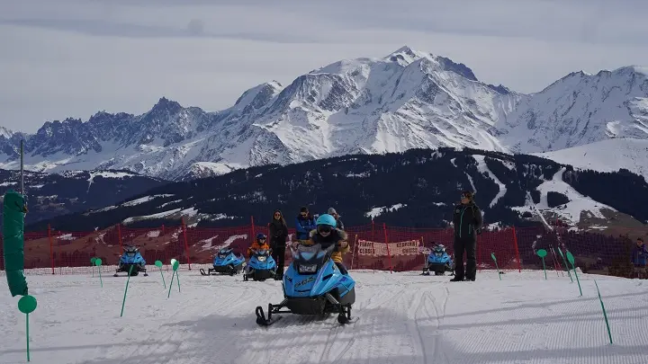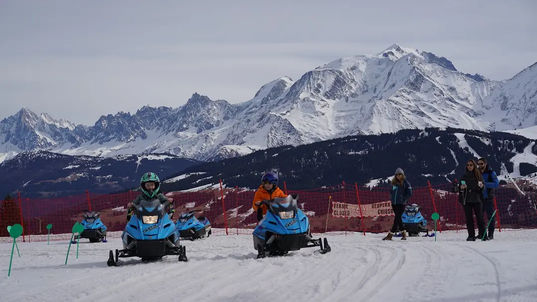 Pour les enfants de 5 à 13 ans, profitez de tours en motoneiges électriques à partir de seulement 15 € / 15 min face au Mont-Blanc.
