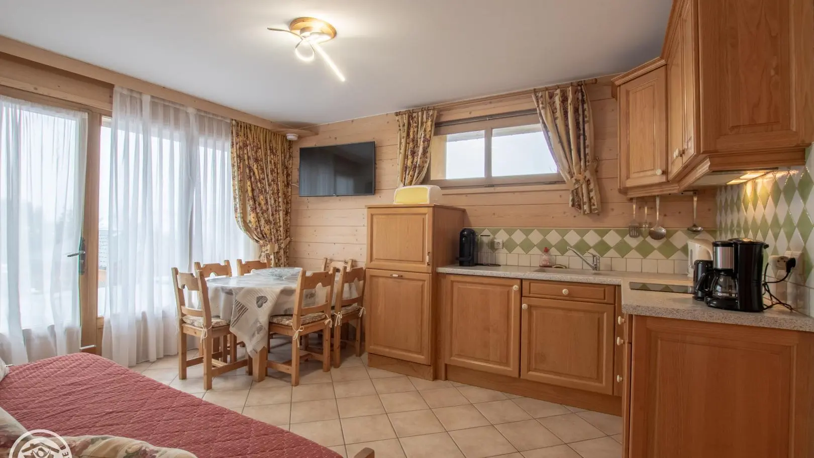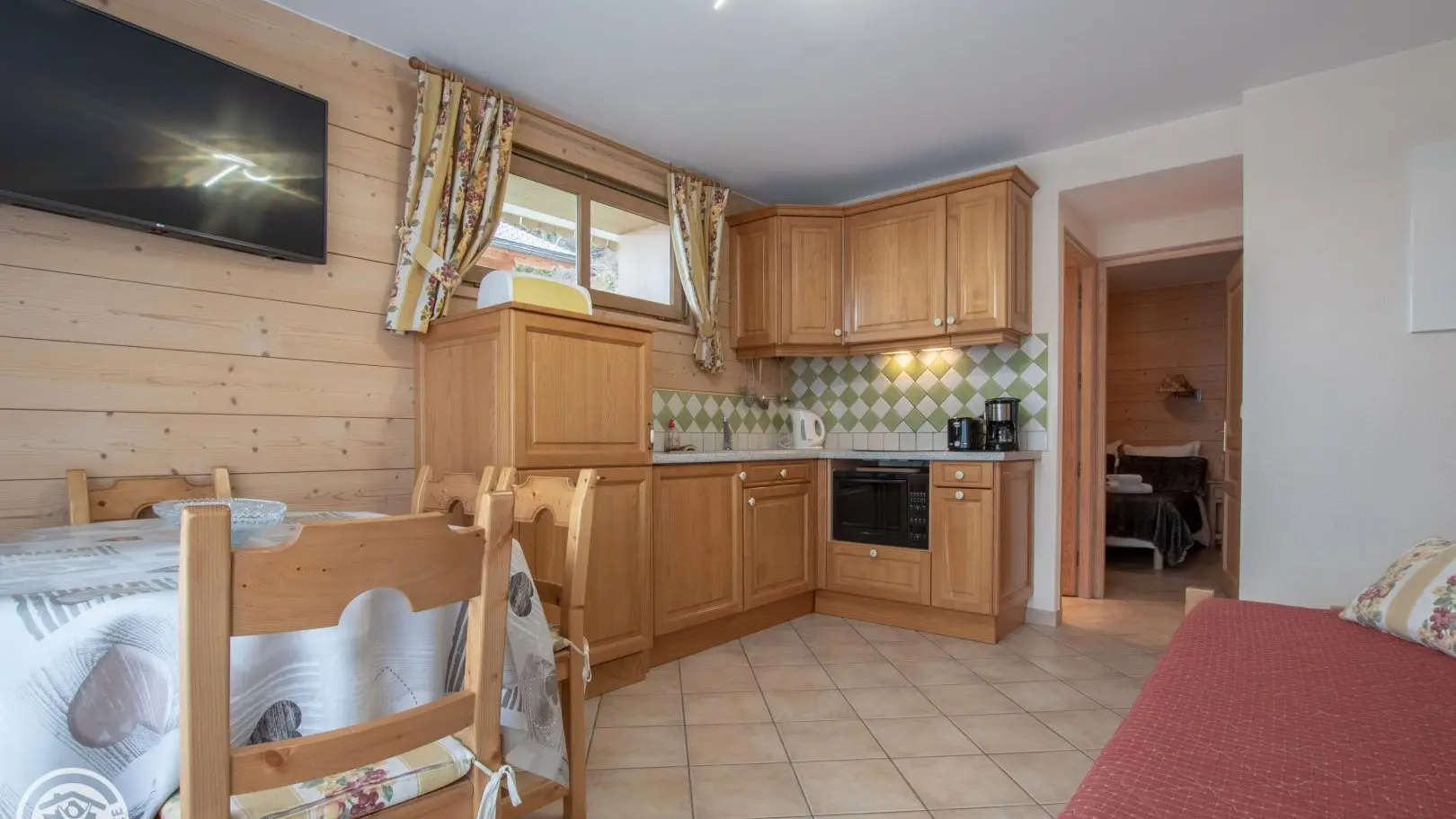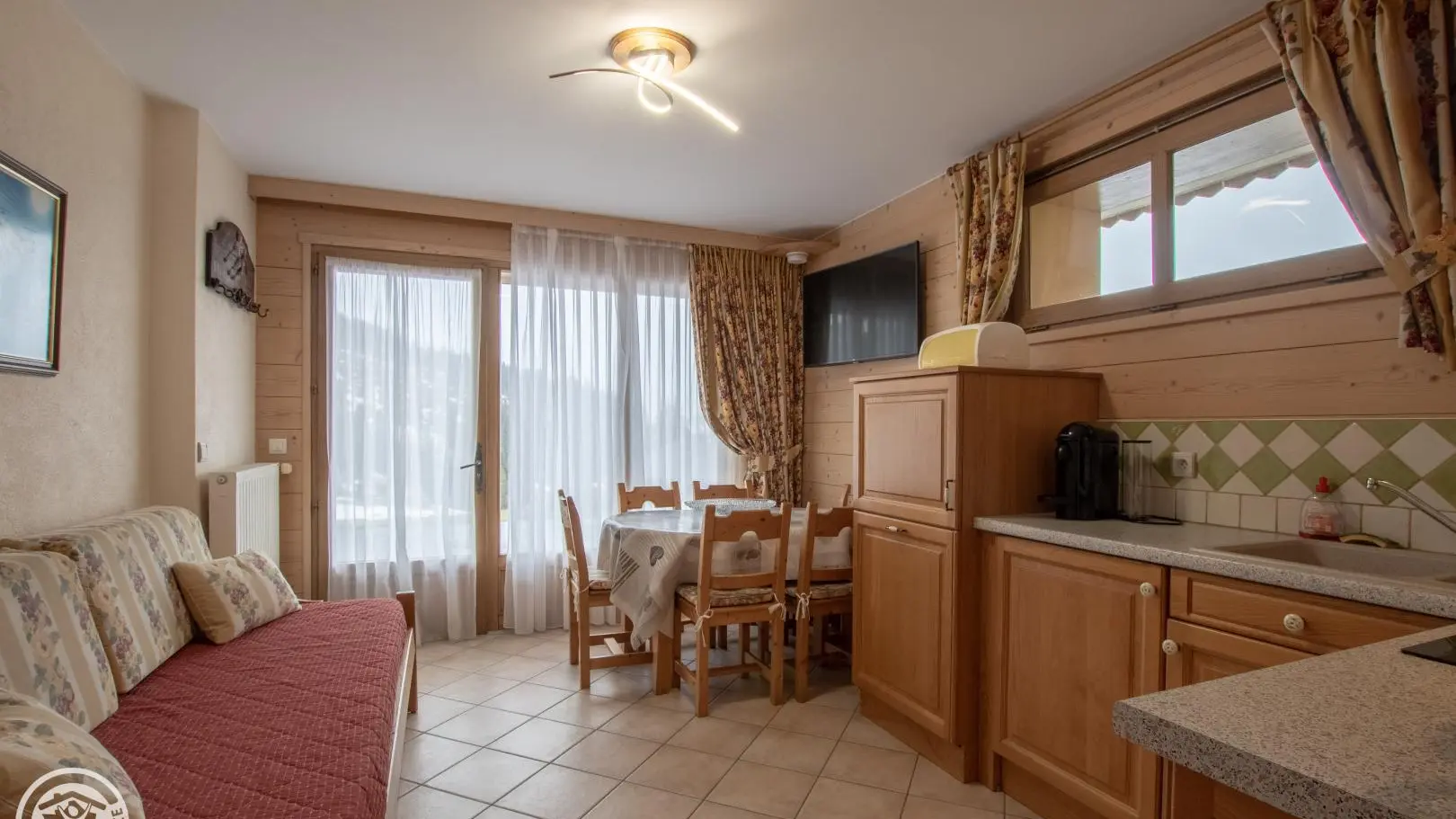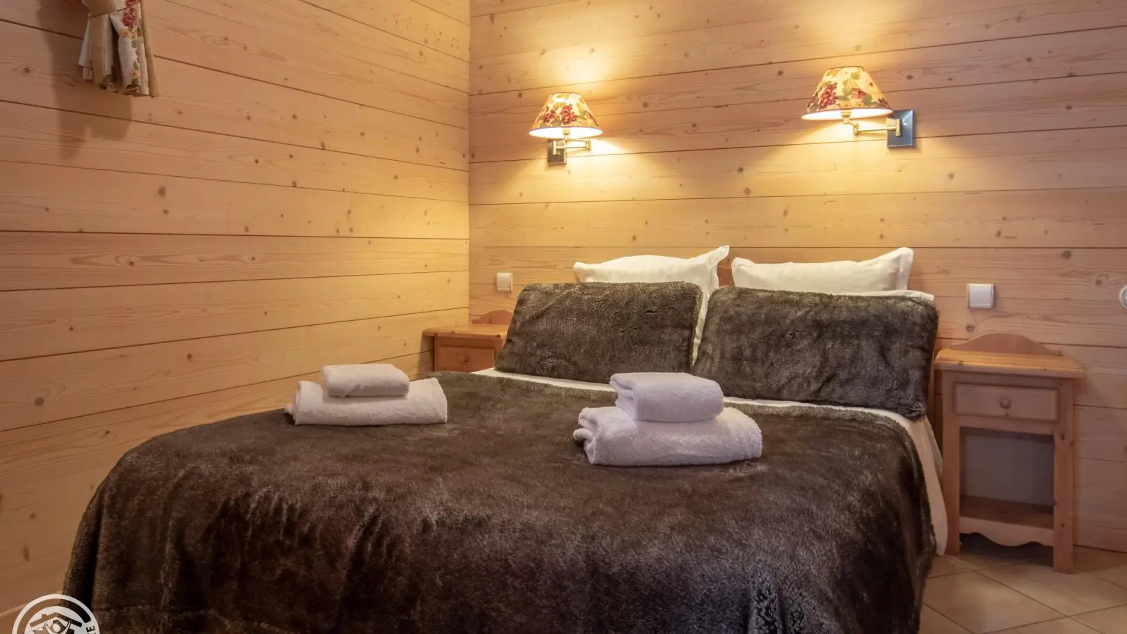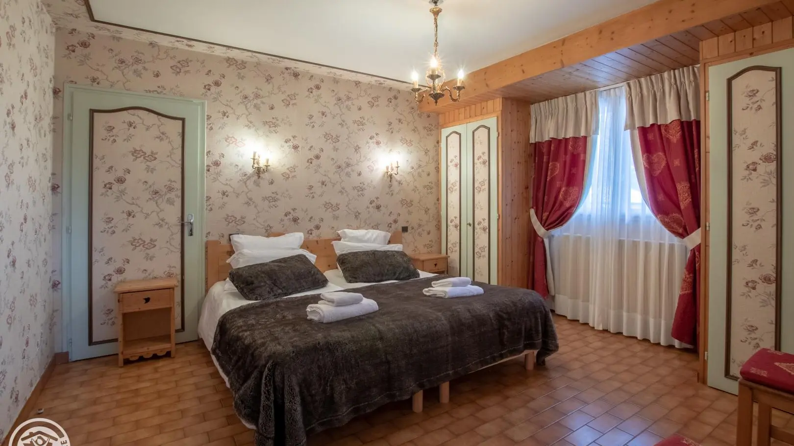 Gîte de 55 m2 en rez de chaussée : cuisine équipée/séjour (canapé convertible : 2x90 cm), Chambre 1 (1 lit 140), Chambre 2 (2 lits jumeaux 90). Salle d'eau, WC indépendant. Local à skis + terrasse. Chauffage central. Accès à la piscine intérieure de l'hôtel (selon dates et horaires d'ouverture) des propriétaires face au chalet. Été : tennis à 3 km. Nombreuses randonnées au départ du gîte.