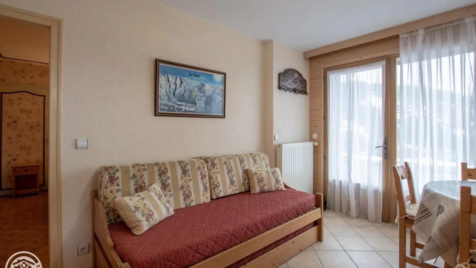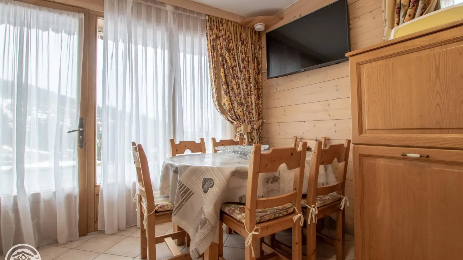 Face au magnifique panorama de la Tournette et de la chaîne des Aravis, notre chalet se situe à 50 m des pistes. Gîte de 55 m2 en rdc : Ch1 (1 lit 140), Ch2 (2 lits jumeaux 90). Séjour avec canapé convertible (2 lits de 90). TV avec parabole, coin cuis...