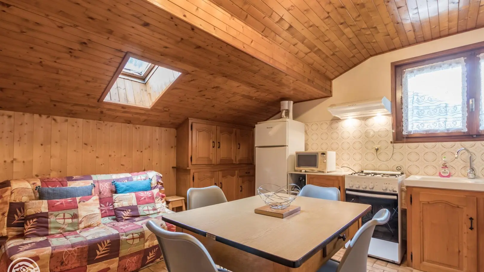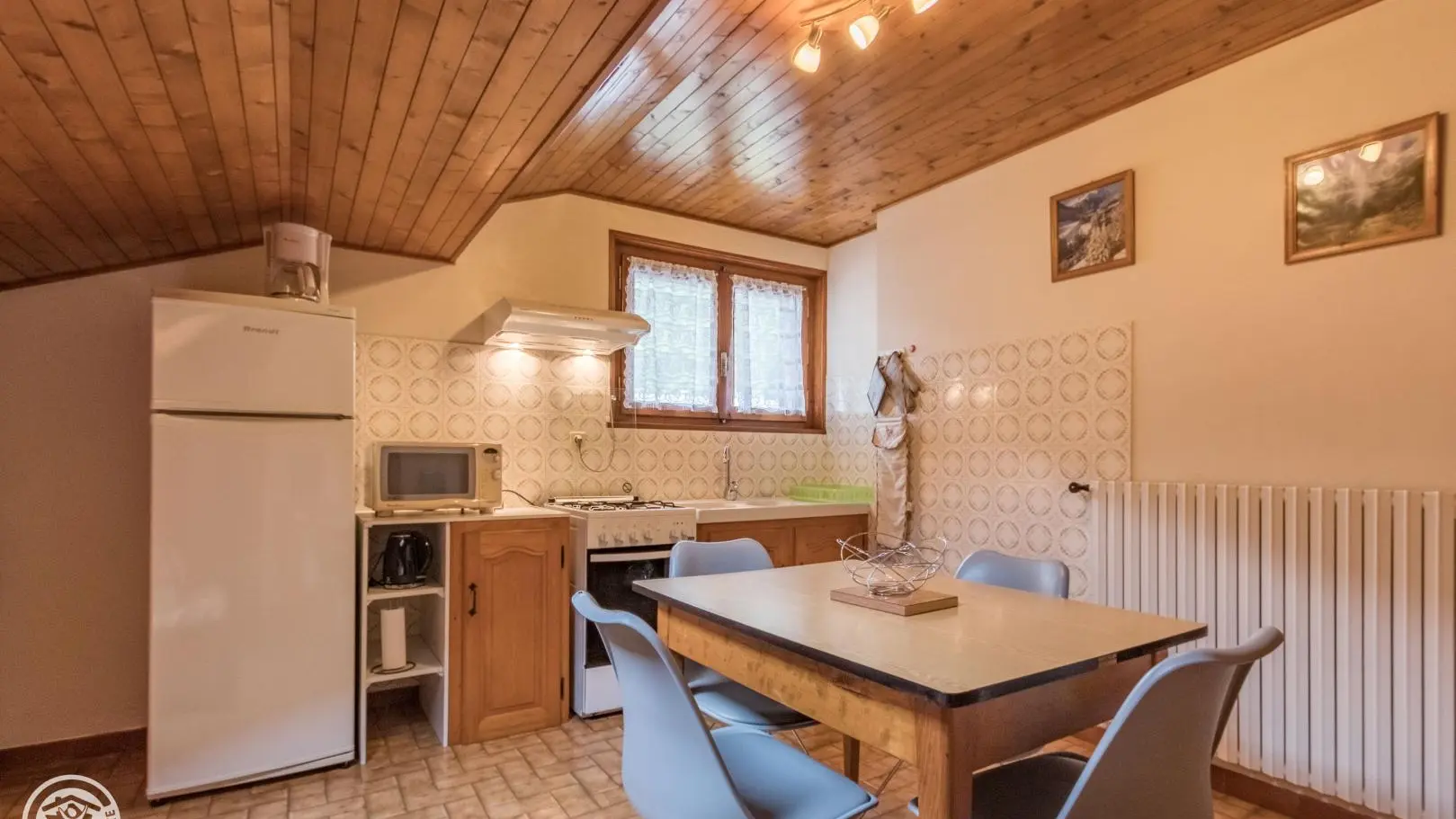 Maison comprenant 3 gîtes et le logement des propriétaires. Gîte de 44 m2 au 2ème étage : cuisine/séjour (canapé), chambre 1 (1 lit 140 cm), chambre 2 (2 lits 90 cm), salle d'eau /WC, chauffage central, balcon, terrain commun, pelouse avec salon de jardin et barbecue. Lave linge commun. Possibilité de location de draps. Station de ski : Morzine à 2,5 km. Navette gratuite à 50m.