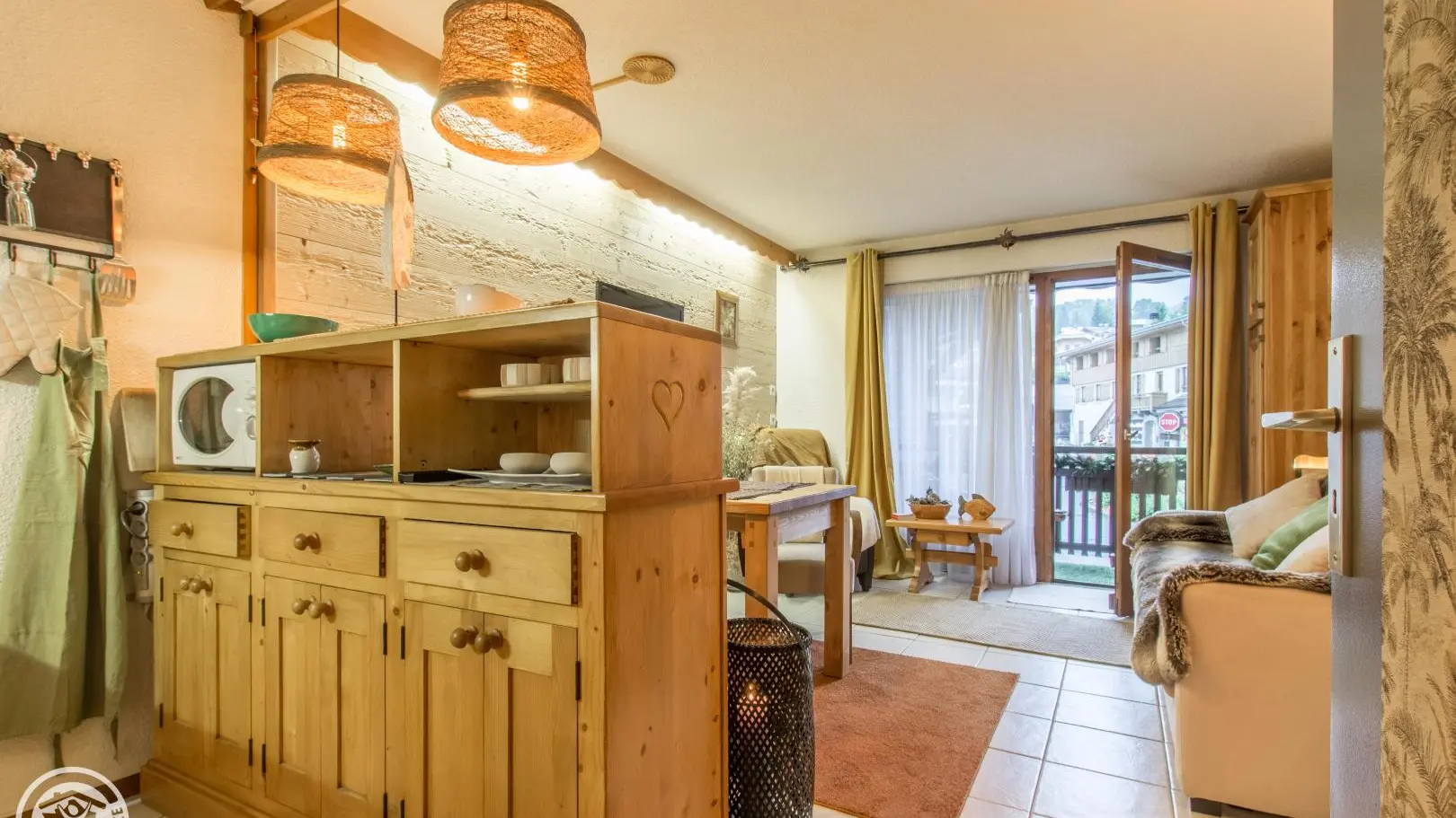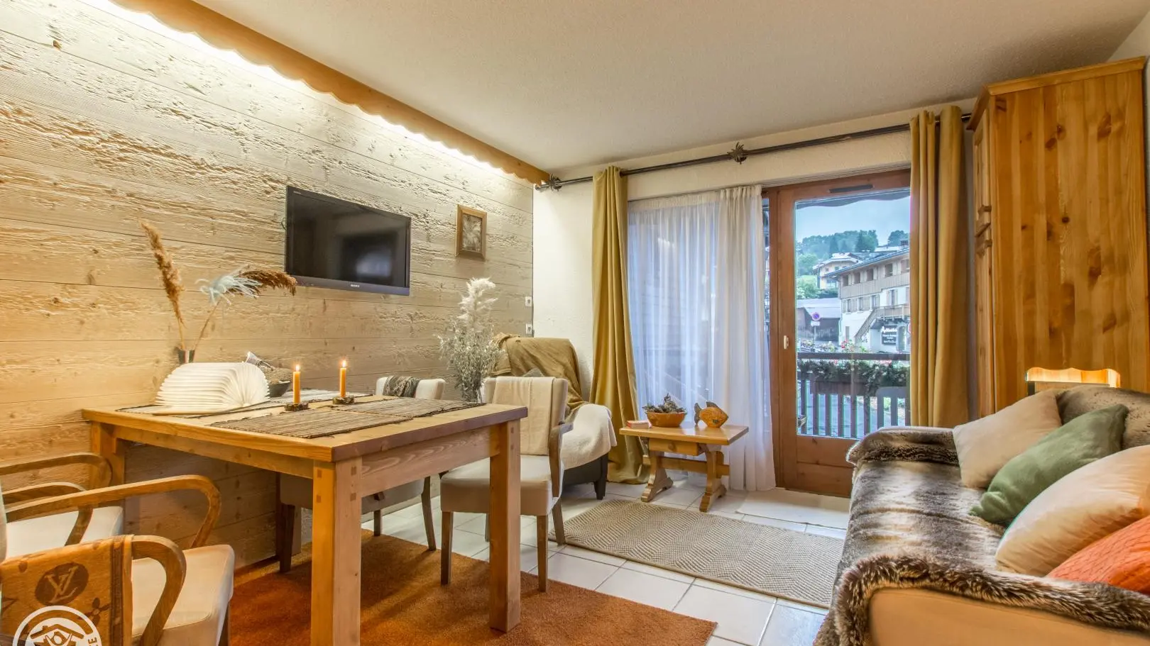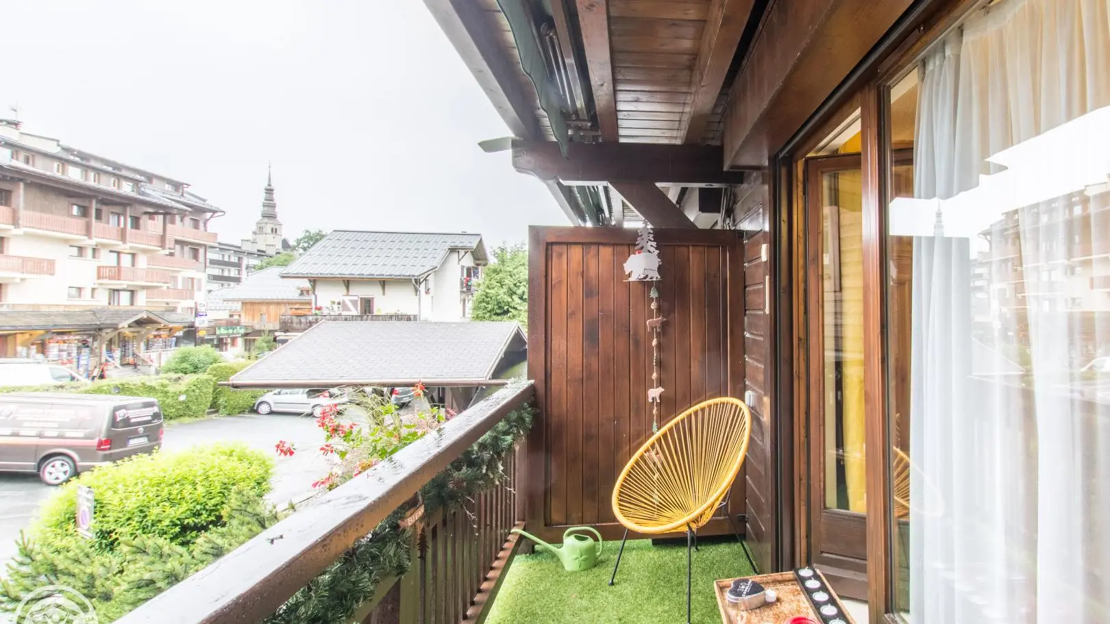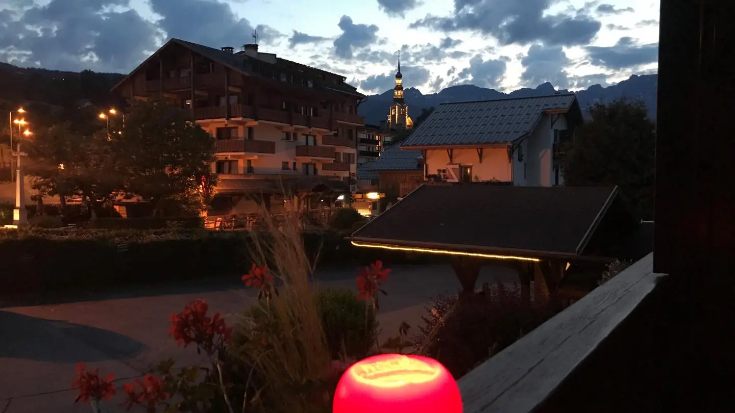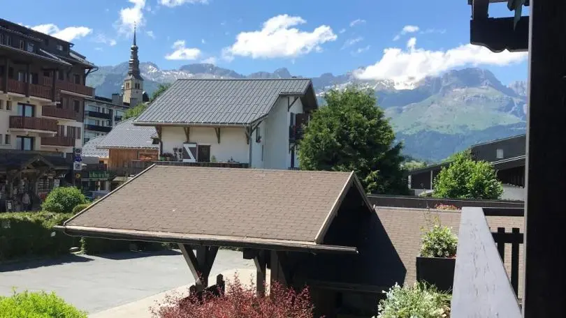Le studio offre une vue sur le clocher du village et la chaîne des Aravis.