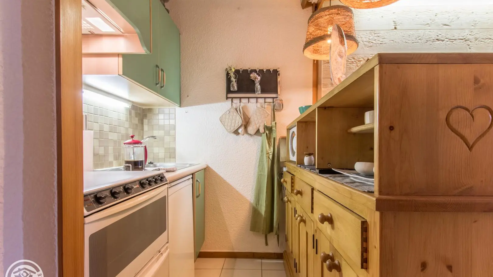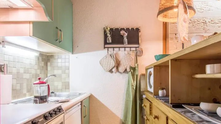 Hall d'entrée avec rangement et lit escamotable 140x190cm, coin cuisine ouvert sur séjour (Tv, canapé rapido offrant un couchage 140x190cm), salle d'eau avec douche, wc indépendant.