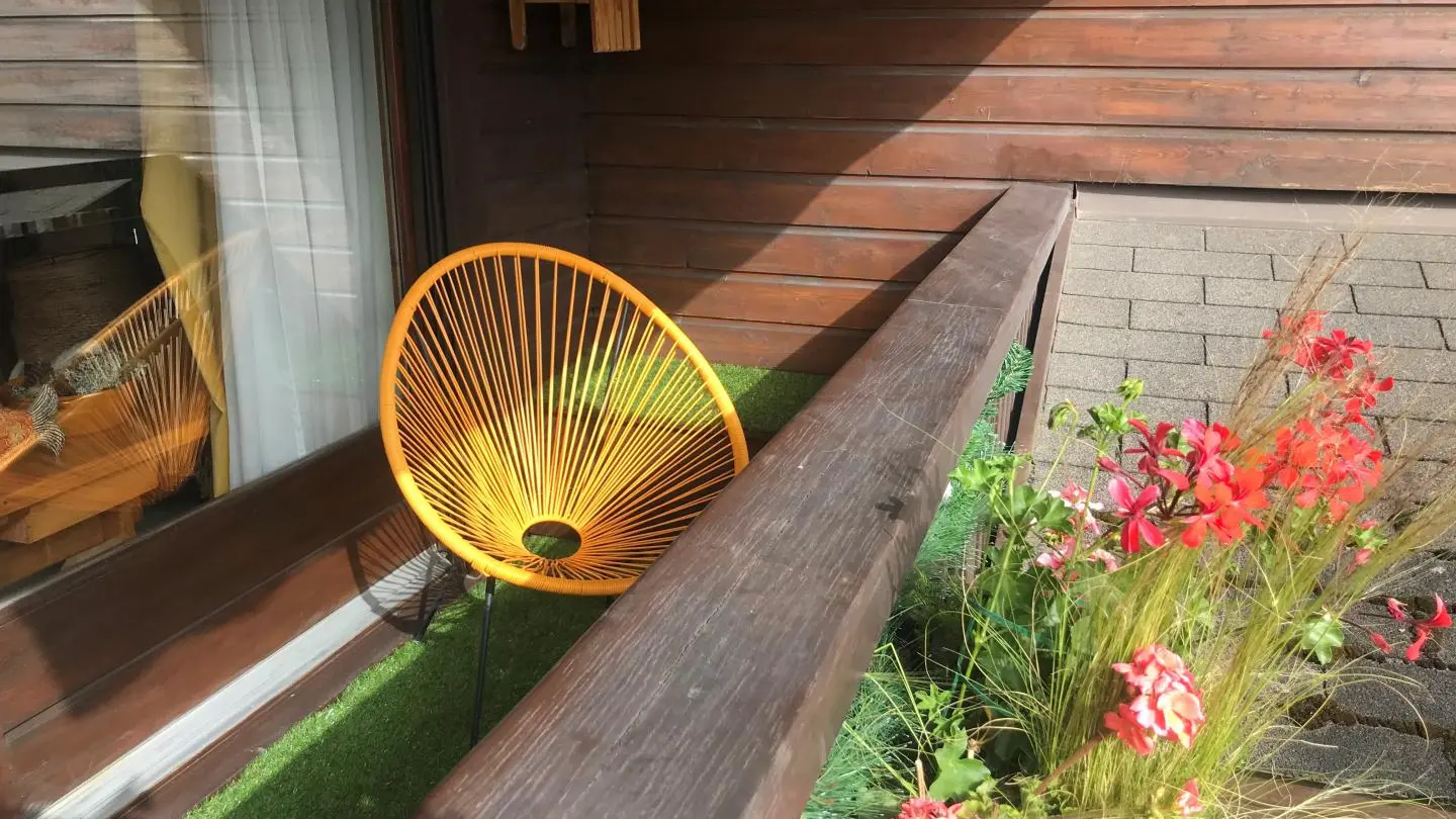 Balcon exposé Sud-Ouest avec fauteuils et store électrique. Internet Wifi.