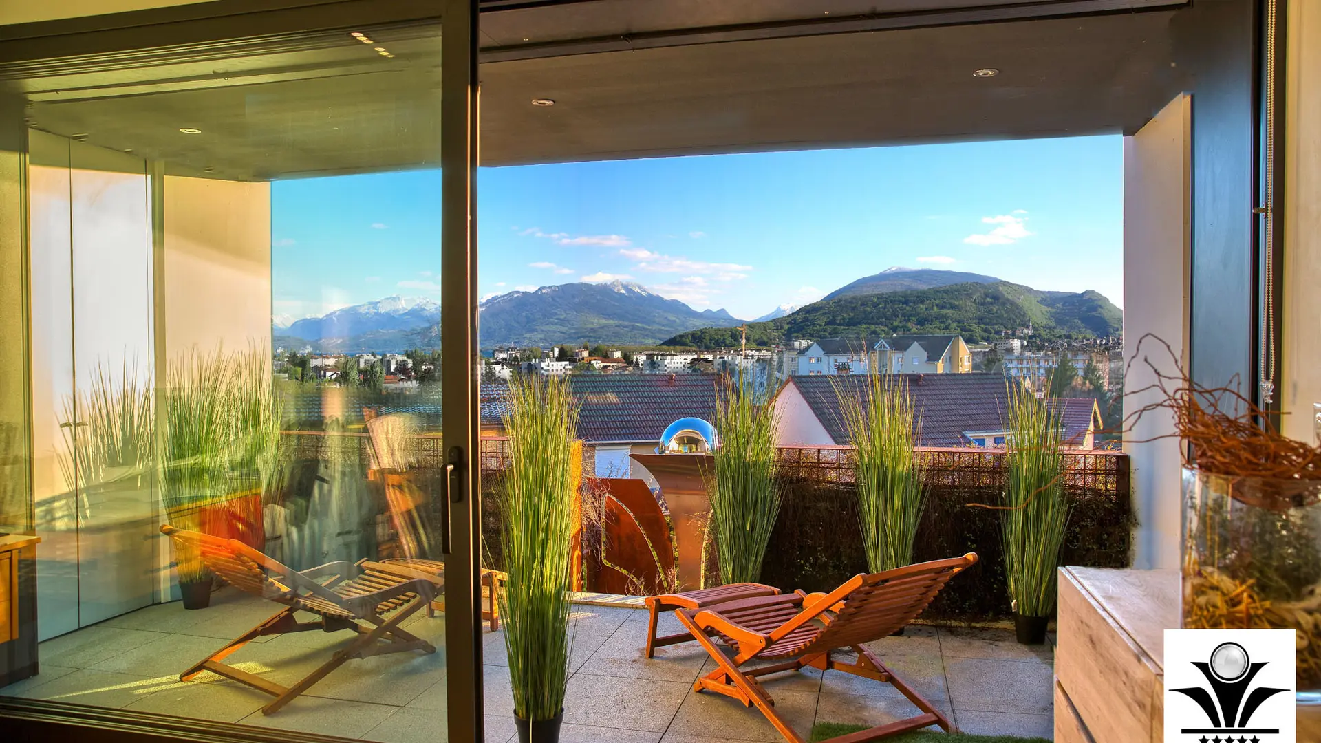 - au rez d'un espace jour de 20 m2 avec coin cuisine donnant sur une terrasse de 12 m² avec panorama sur les montagnes et son jardin romantique avec bassin.