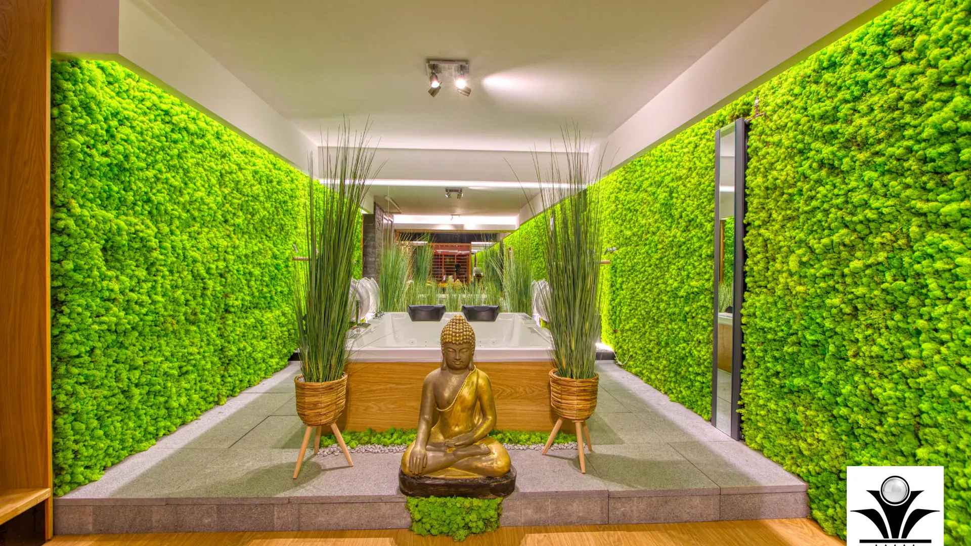 - au niveau inférieur, l'espace spa de 45 m2 avec jacuzzi , sauna et vaste lit rond pour vos nuits dans la magie d'un décor végétal. Un soin particulier a été donné aux matériaux, dont 2 vasques taillées dans des blocs de marbre de Carrare.