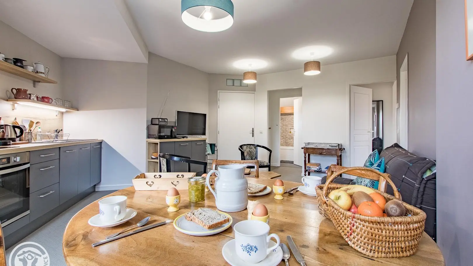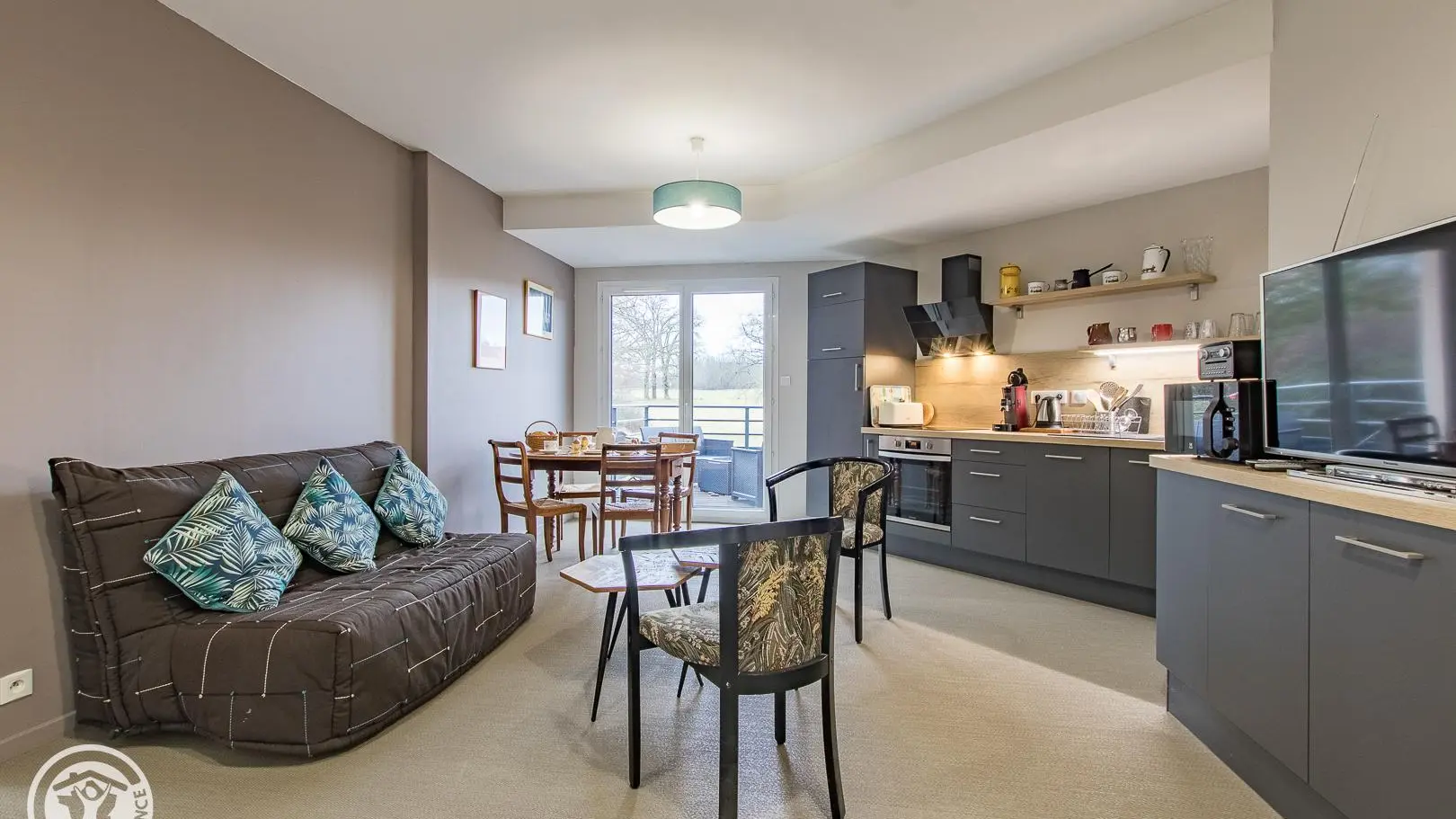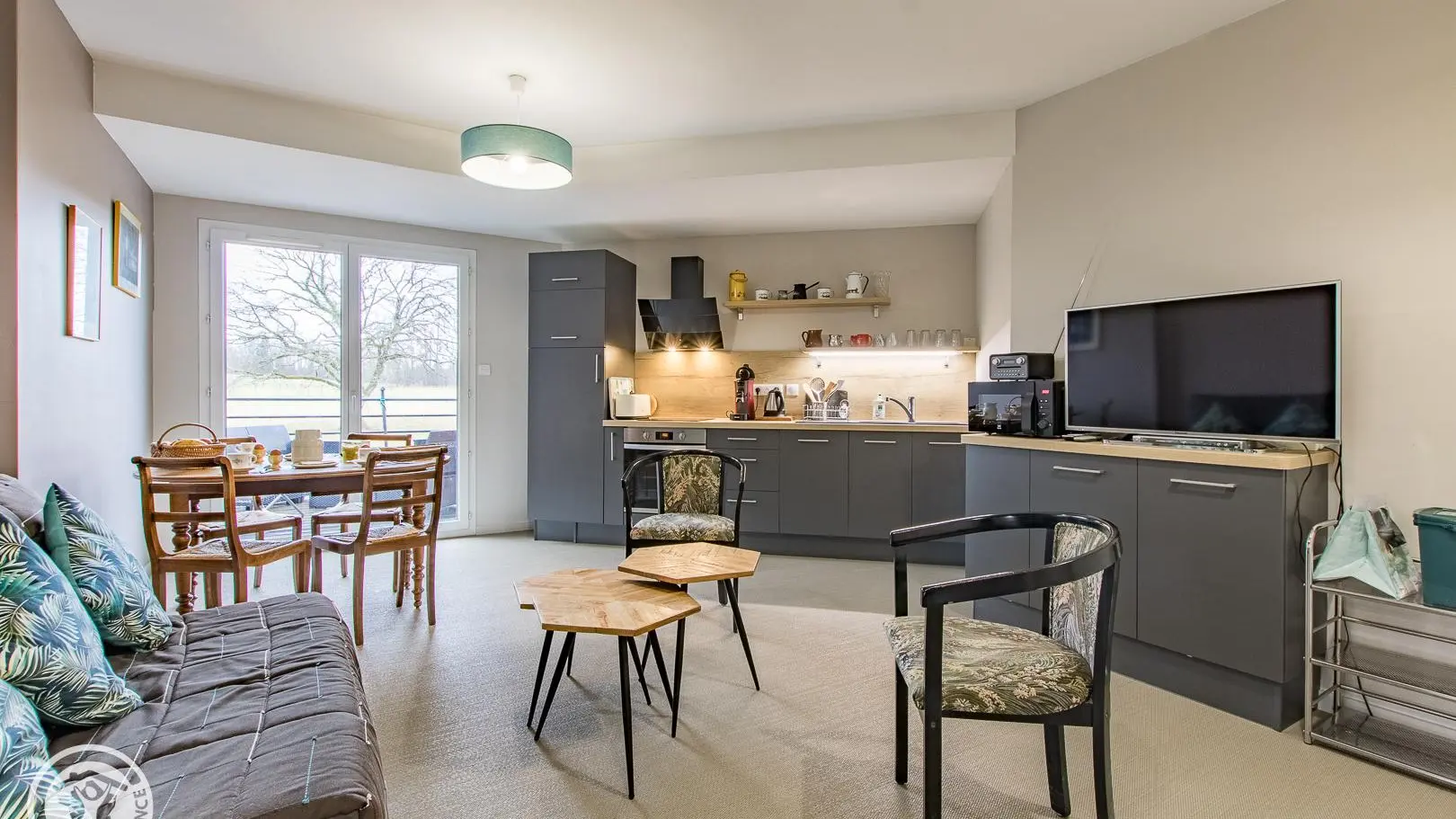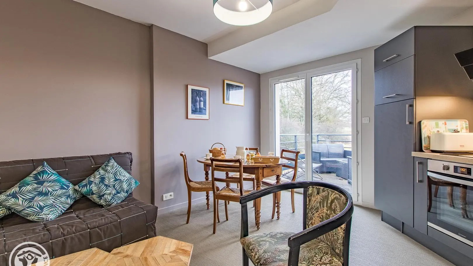 - Belle pièce de vie avec cuisine équipée ouverte sur le séjour : canapé, télévision, lecteur DVD, table repas... accès à la terrasse-balcon.