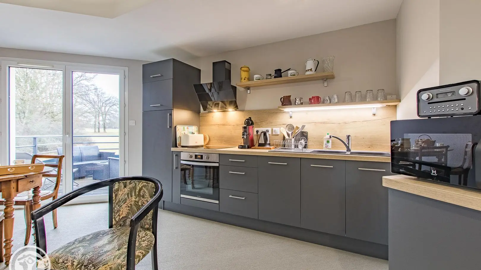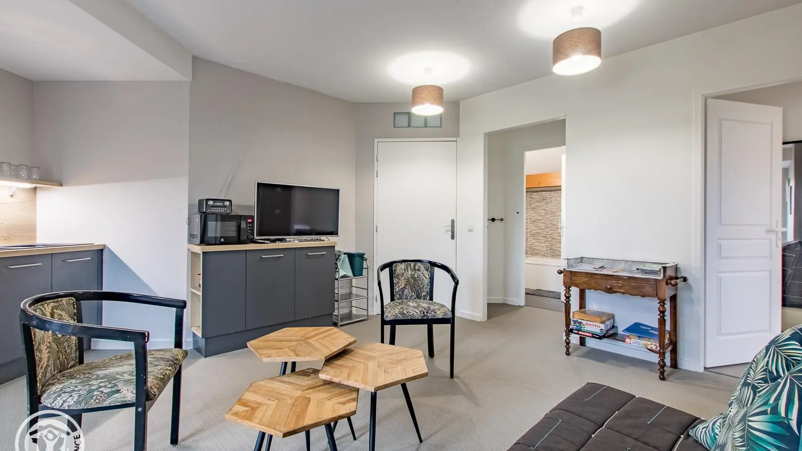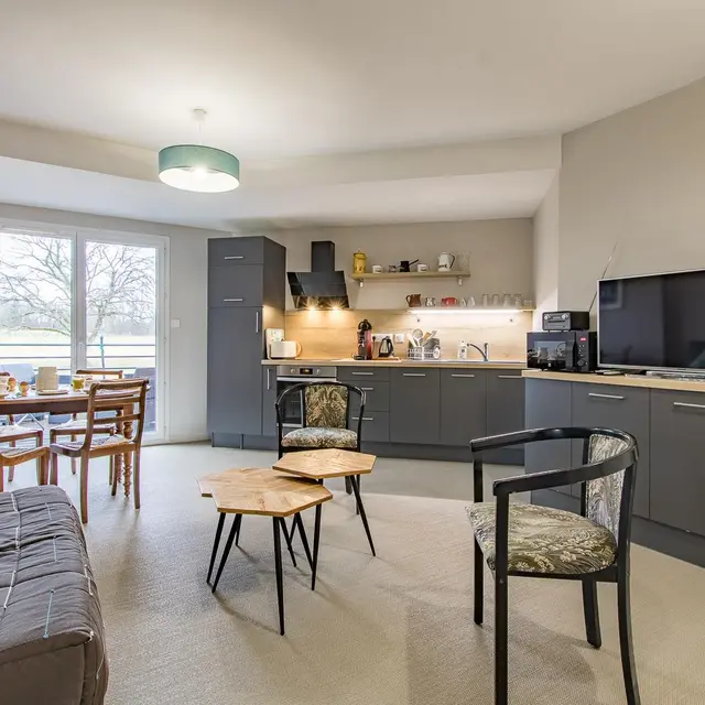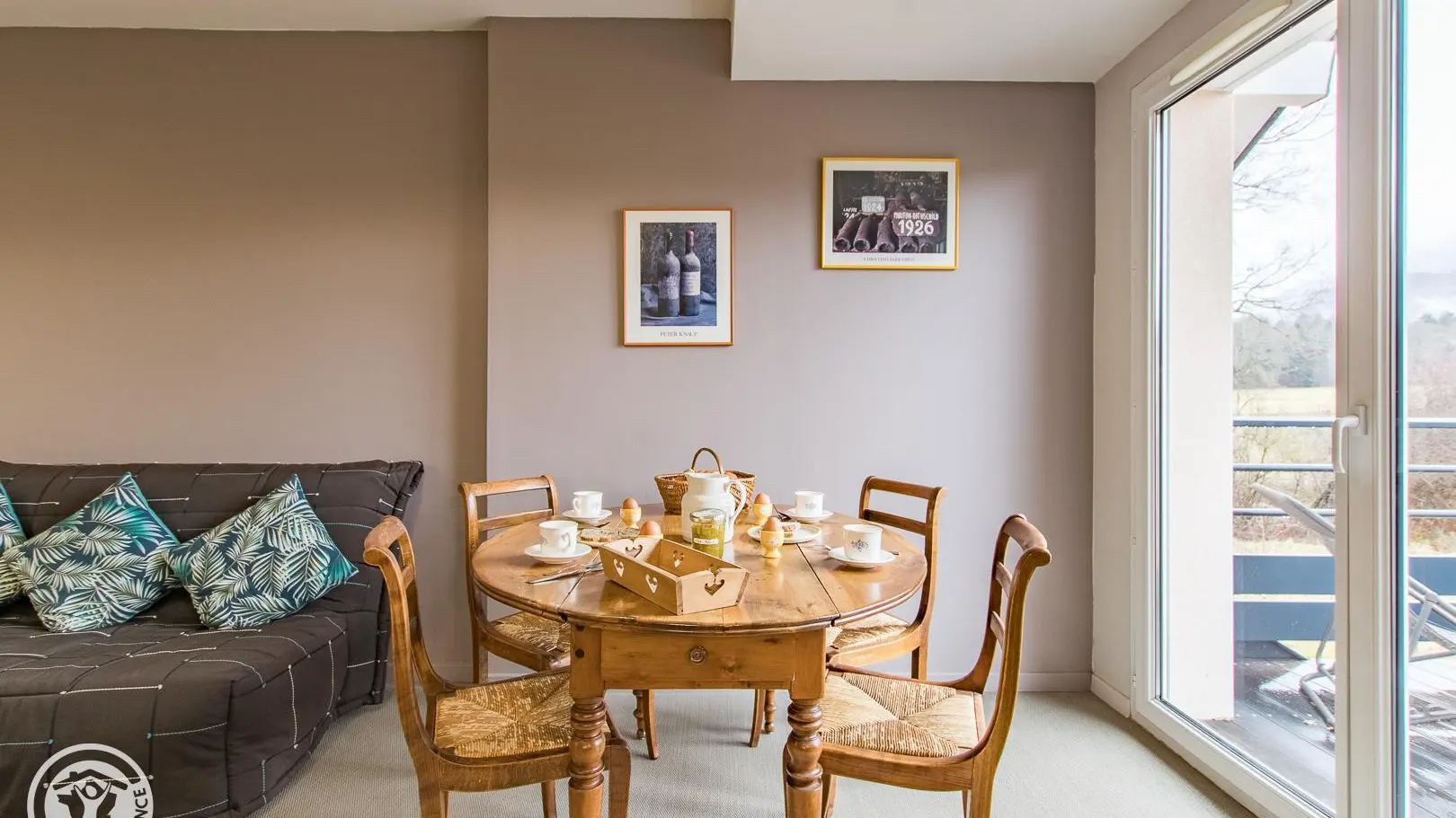 - Belle pièce de vie avec cuisine équipée ouverte sur le séjour : canapé, télévision, lecteur DVD, table repas... accès à la terrasse-balcon.