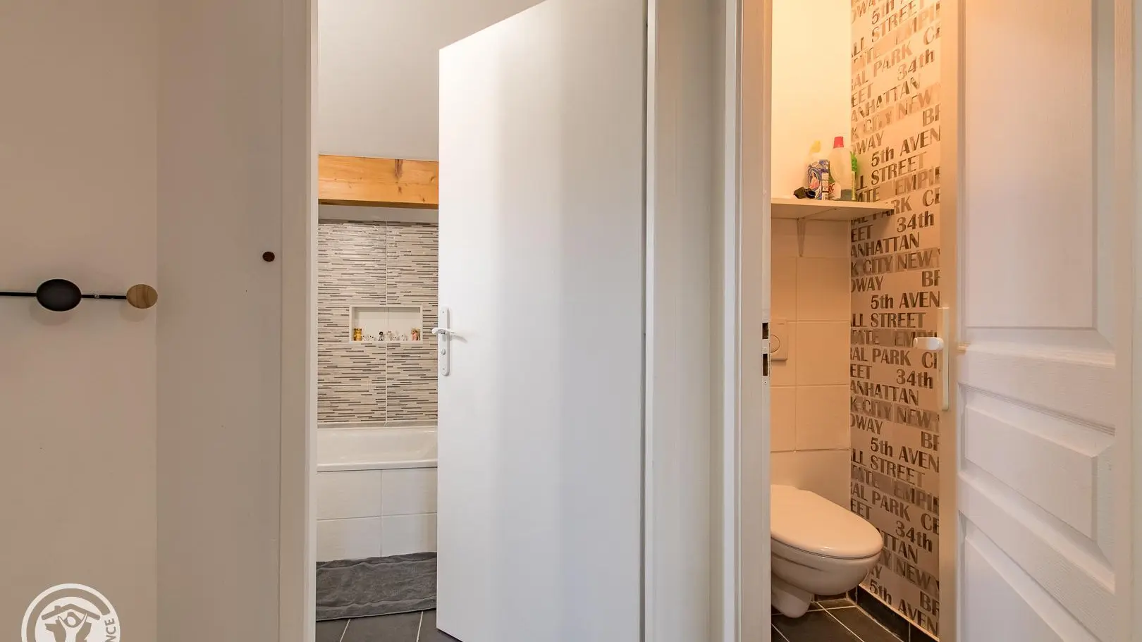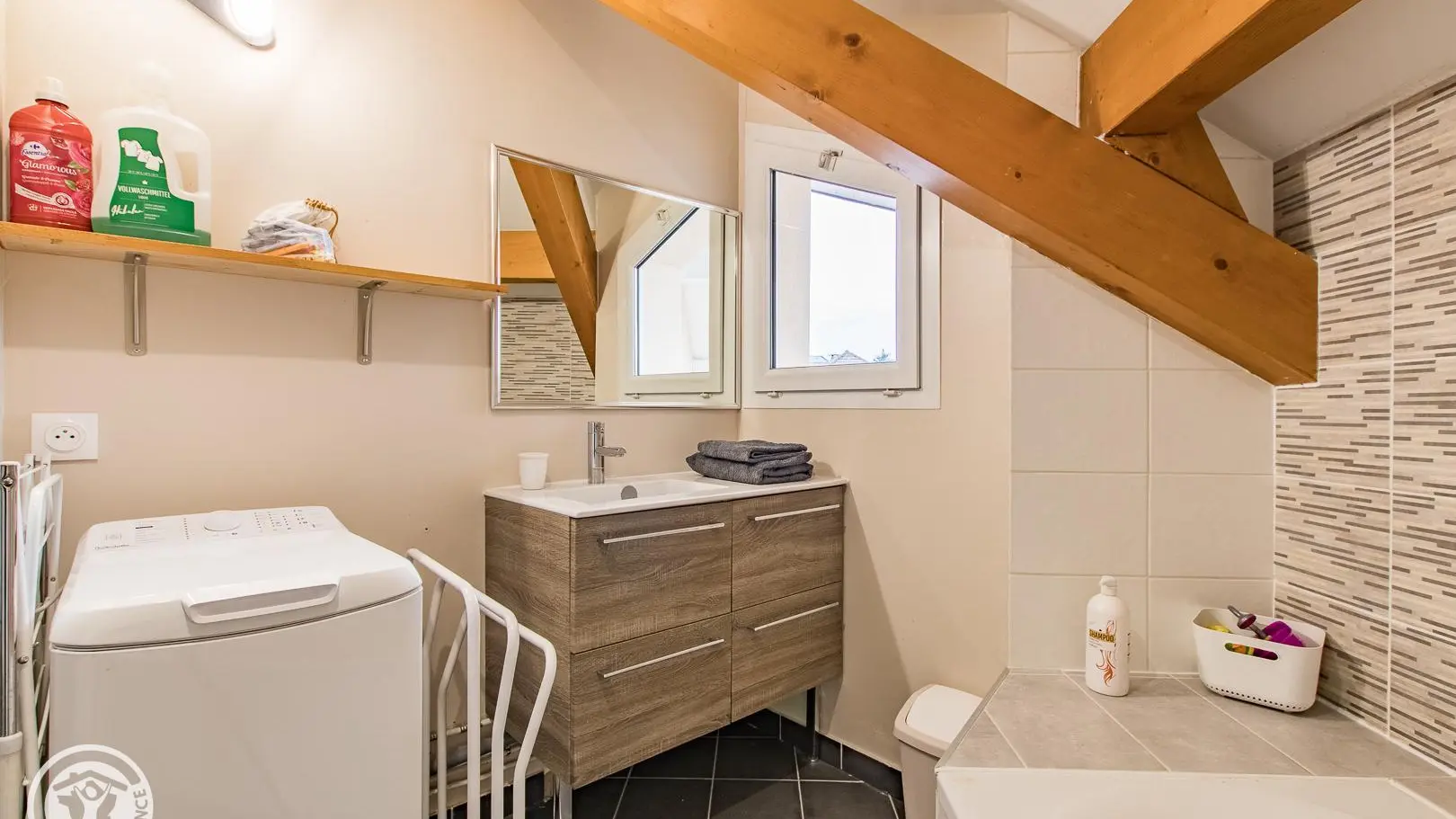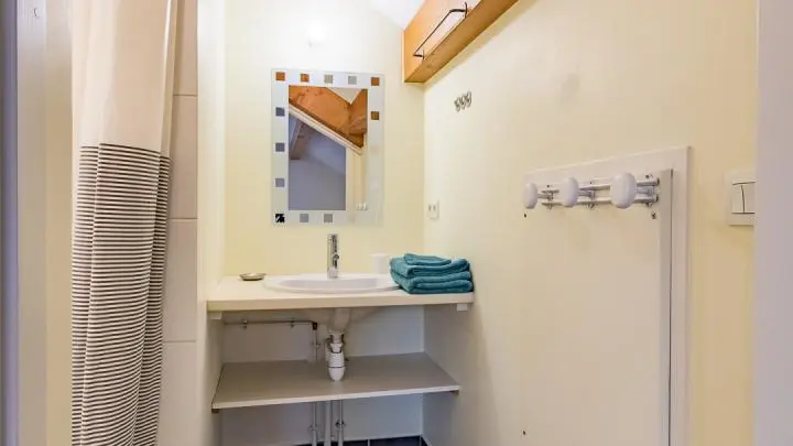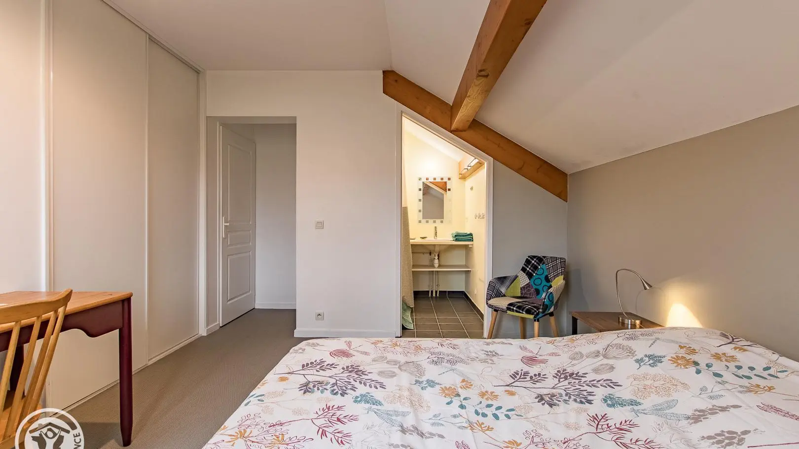 - Chambre 1 : 1 lit 160x200cm, bureau, salle d'eau ouverte avec vasque et douche.