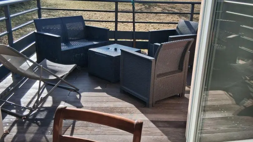 Terrasse-balcon avec salon de détente et transats. Jardin commun, barbecue. Parking privé dans la cour. Possibilité de recharge voiture électrique sur prise domestique traditionnelle (avec supplément - temps de recharge à convenir avec propriétaires qui possèdent également une voiture électrique). Possibilité de laisser des vélos ou skis dans le garage des propriétaires.