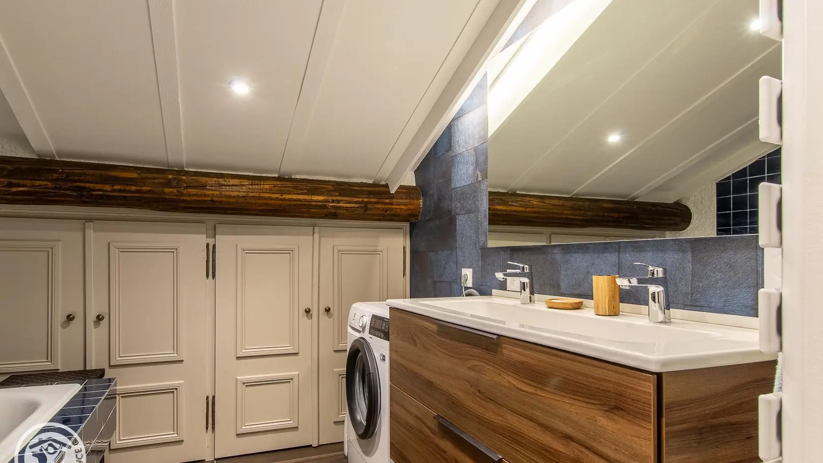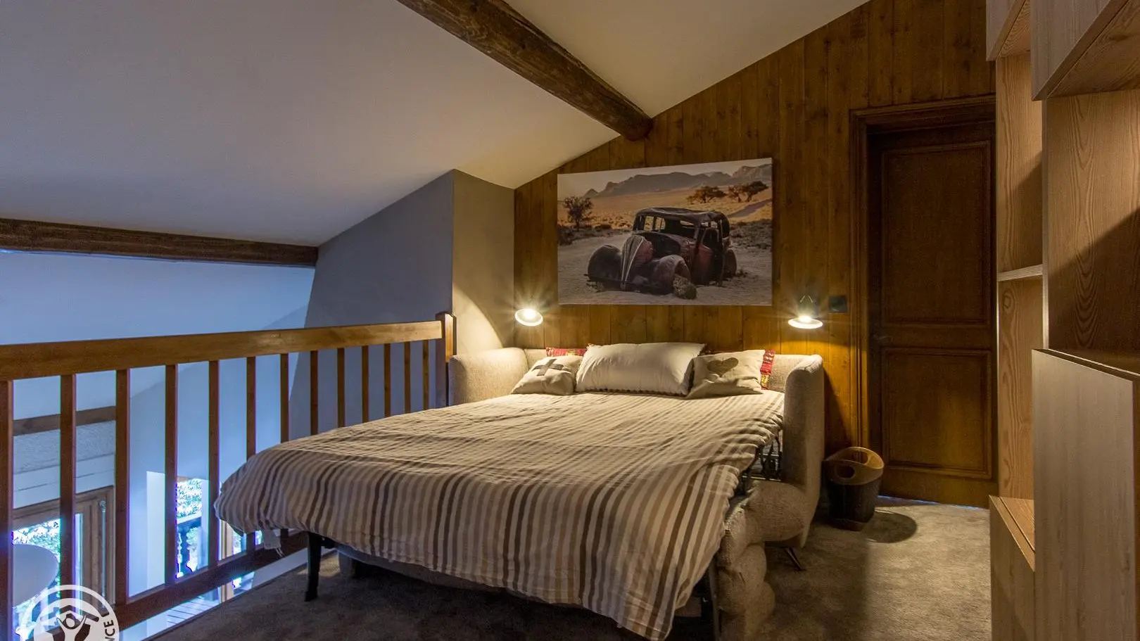 A l'étage : mezzanine avec coin bureau et rangement, canapé convertible (rapido offrant un couchage d'appoint de bon confort 140x190cm), chambre 2 (2 lits 80x190cm jumelables), salle de bains (baignoire), wc indépendant.