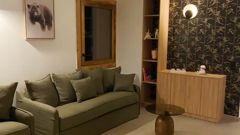 La cuisine est équipée d'un four, micro-onde, plaques de cuissons x4, hotte, frigo avec compartiment freezer, machine à café Nespresso, lave-vaisselle... Le coin séjour avec un canapé, Smart TV, wifi ADSL.