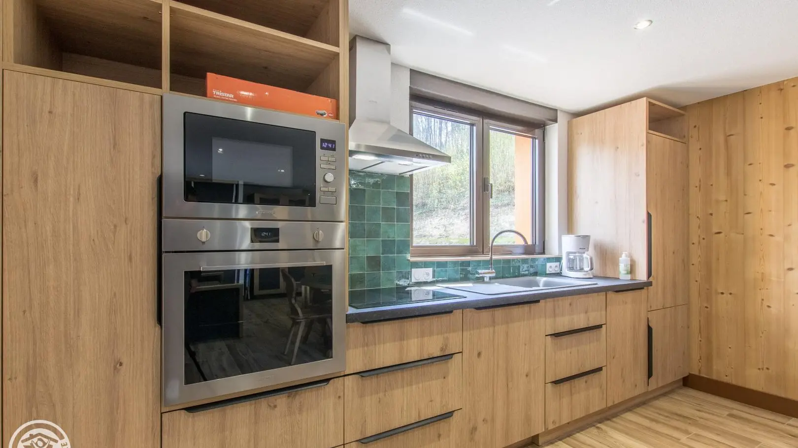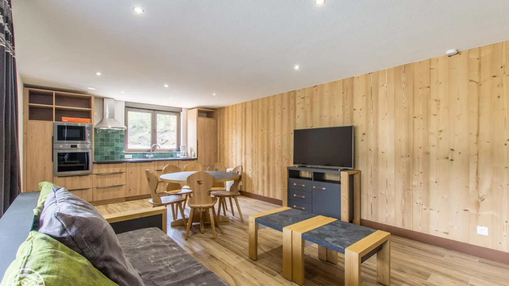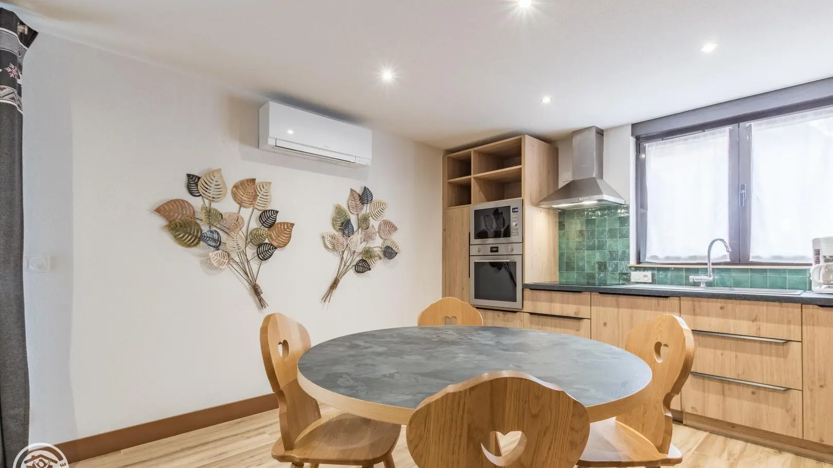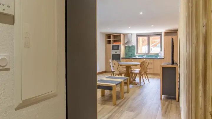 Entrée commune au rez-de-chaussée : cuisine intégrée ouverte sur séjour (Tv, banquette-lit gigogne offrant 2 couchages 80x190cm jumelables en lit 160cm).