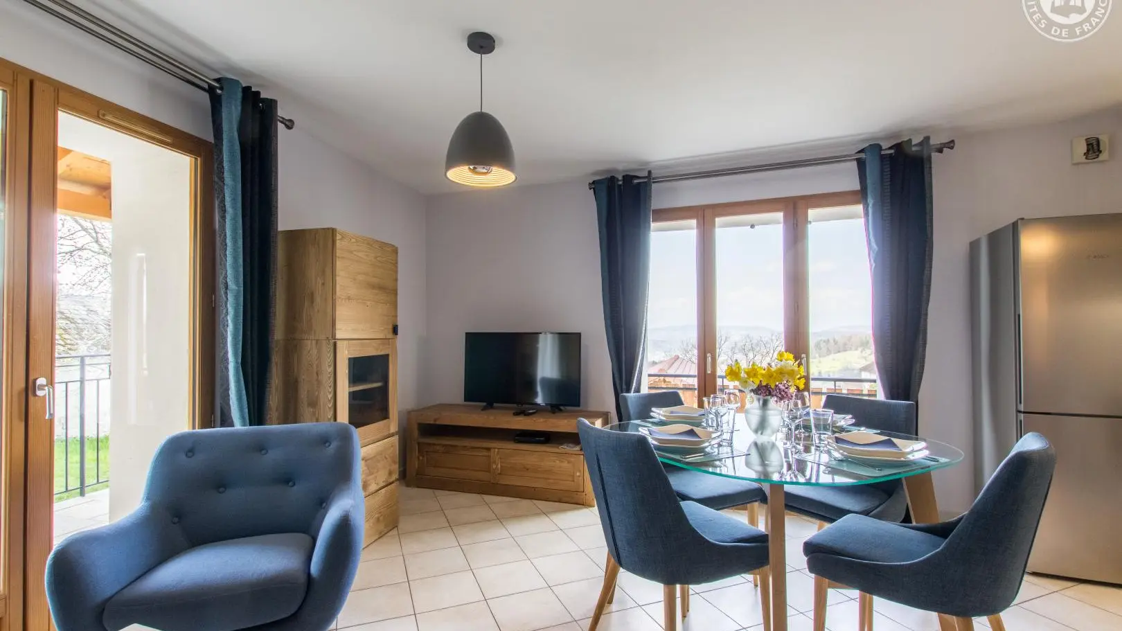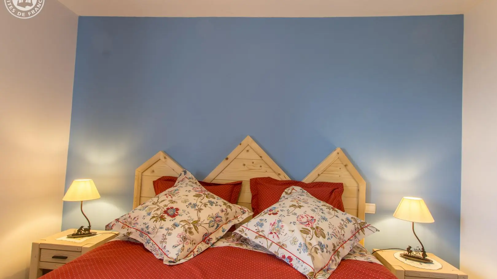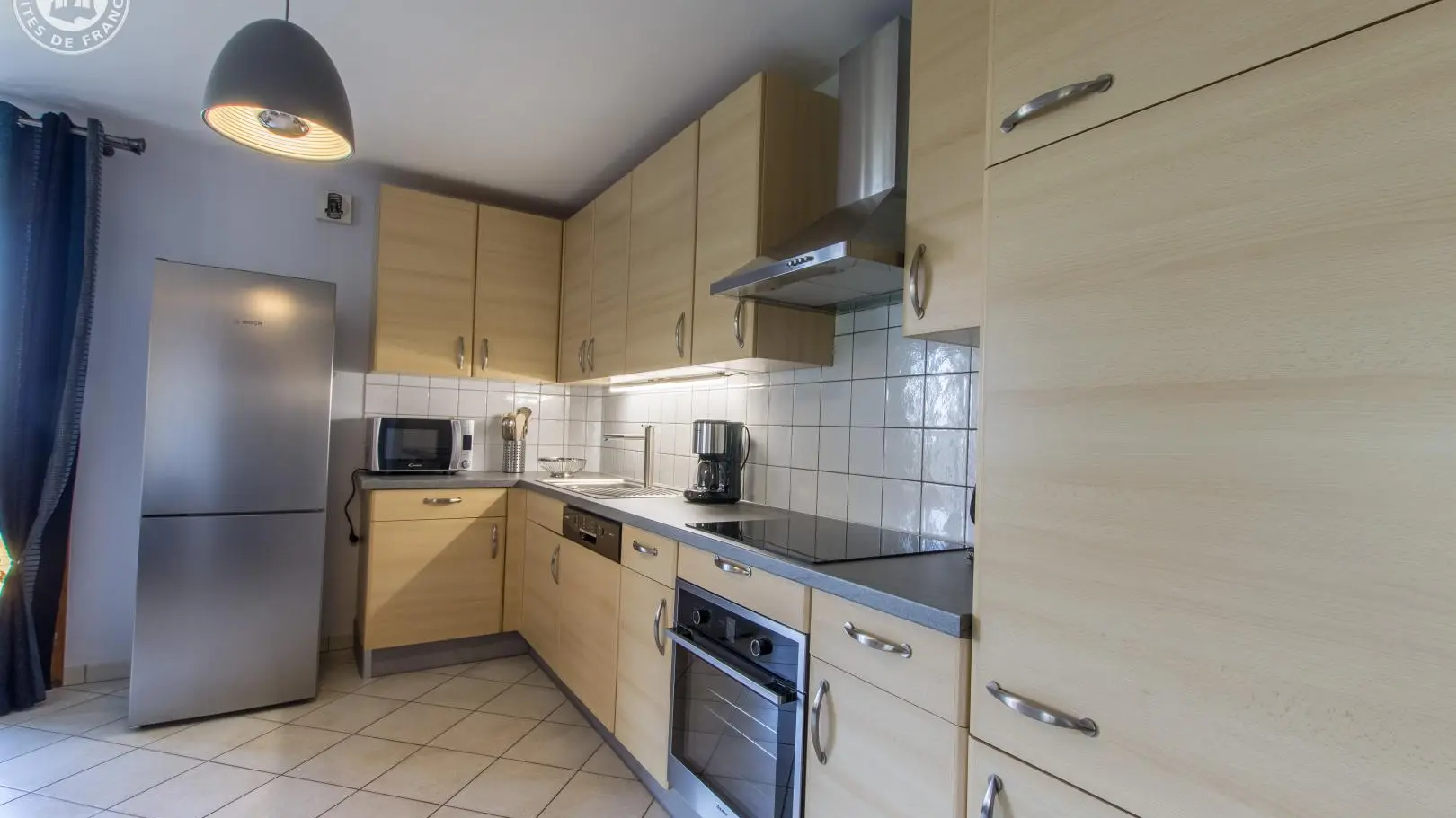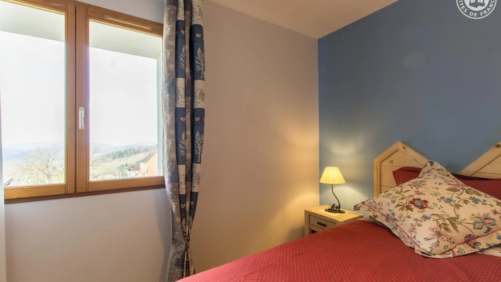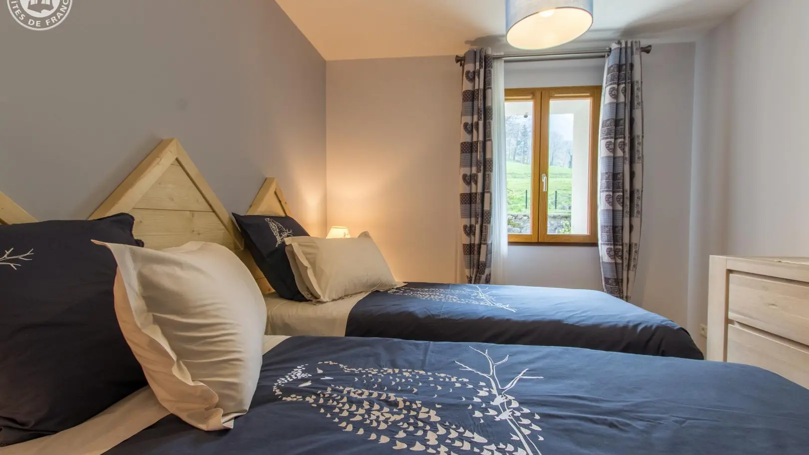 Entrée commune avec les 2 autres gîtes: hall d'entrée, cuisine intégrée ouverte sur séjour (canapé, Tv), chambre 1 (1 lit 160x200cm), chambre 2 (2 lits 90x200cm jumelables), salle d'eau (douche), wc indépendant. Chauffage au sol. Petite terrasse sud avec mobilier de jardin, balcon ouest, terrain commun en contre-bas avec table forestière et transats. Les draps sont fournis (lits faits à l'arrivée). Parking commun à 20m de la maison (accès par marches).