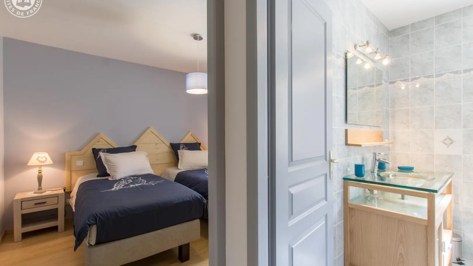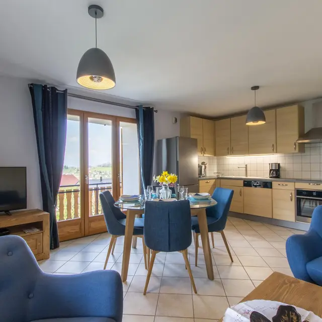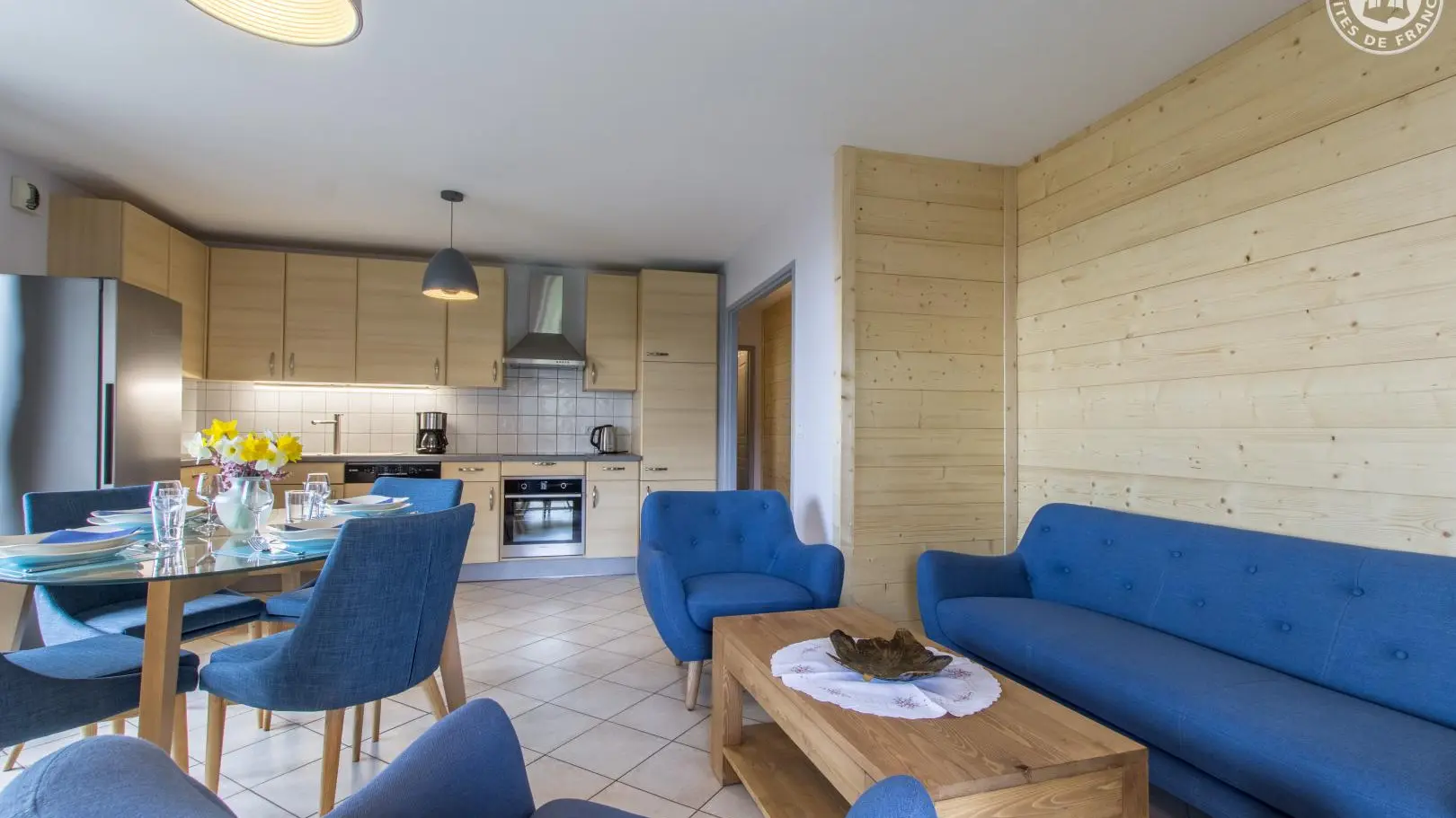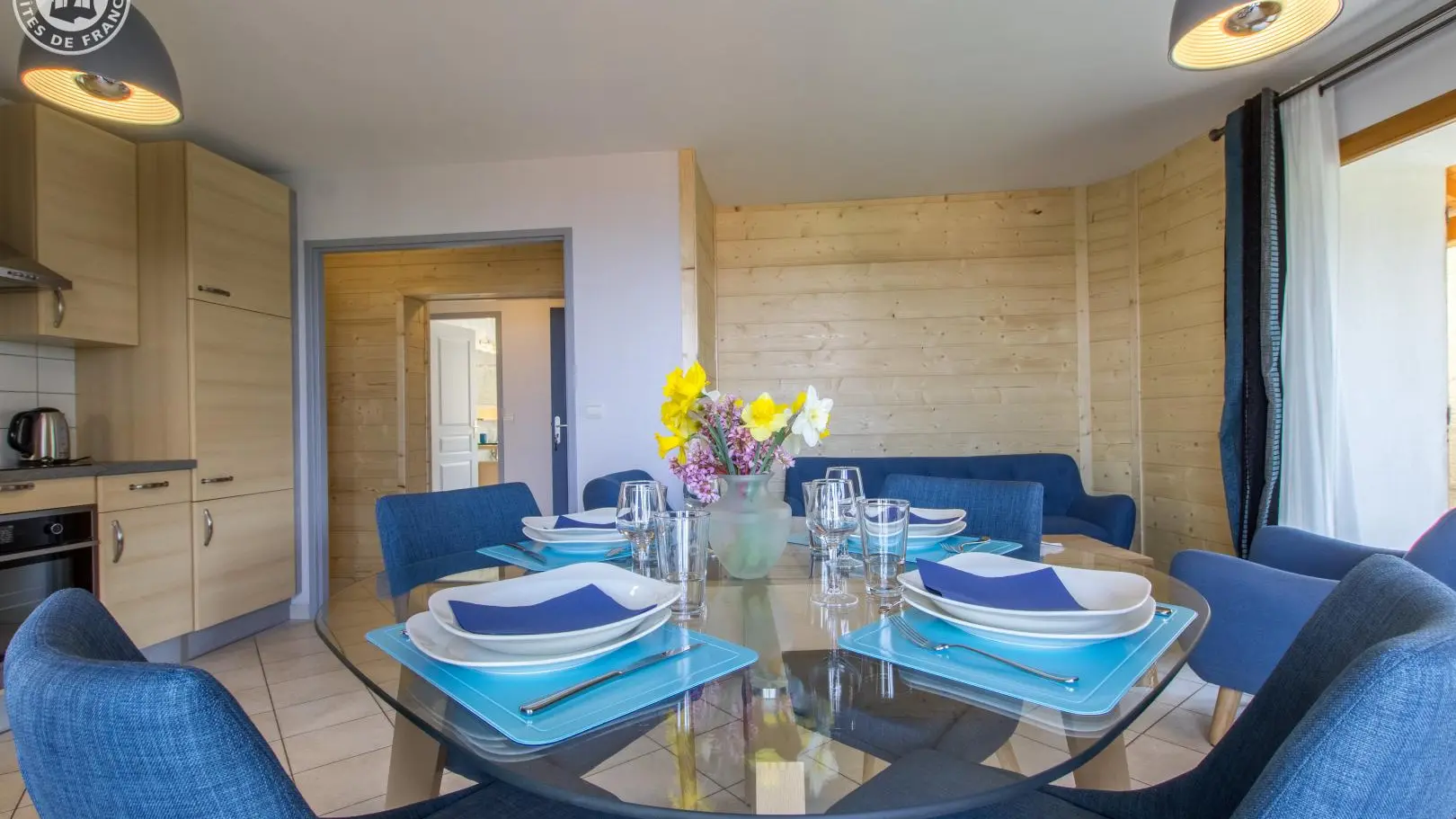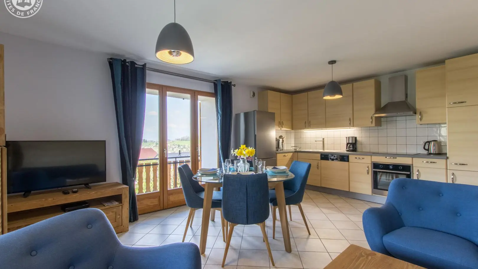 Entrée commune avec les 2 autres gîtes: hall d'entrée, cuisine intégrée ouverte sur séjour (canapé, Tv), chambre 1 (1 lit 160x200cm), chambre 2 (2 lits 90x200cm jumelables), salle d'eau (douche), wc indépendant. Chauffage au sol. Petite terrasse sud avec mobilier de jardin, balcon ouest, terrain commun en contre-bas avec table forestière et transats. Les draps sont fournis (lits faits à l'arrivée). Parking commun à 20m de la maison (accès par marches).