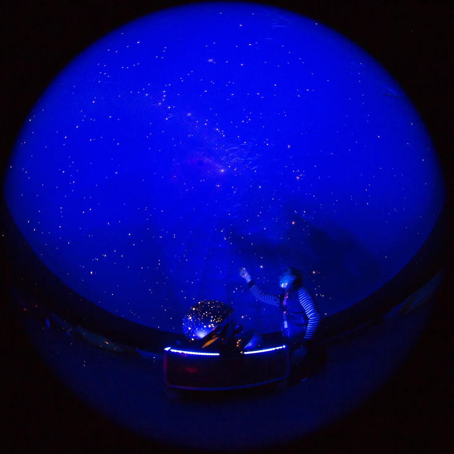 Séance immersive sous un planétarium gonflable pour découvrir des histoires du ciel avec un médiateur de La Turbine Sciences.