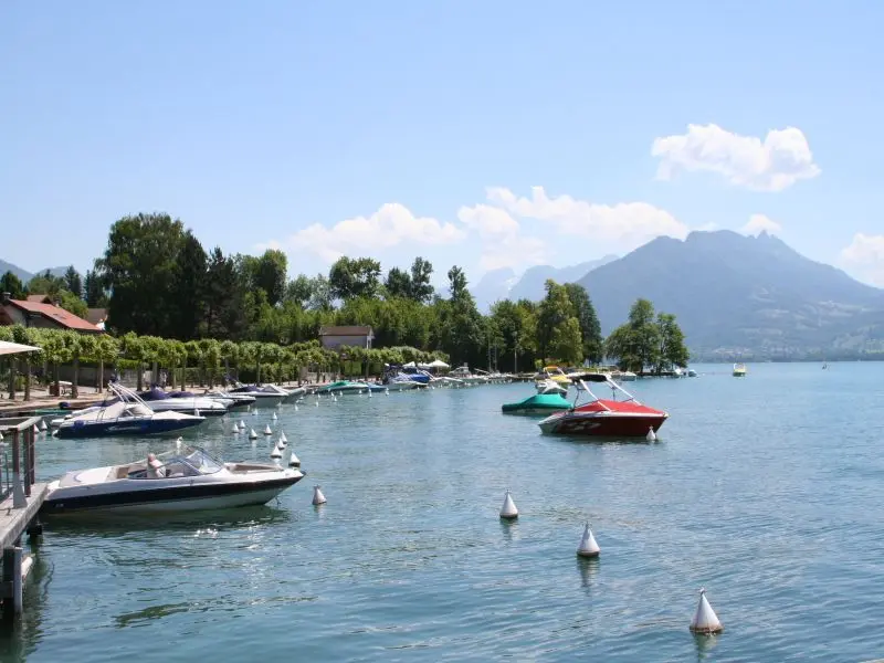 Port situé sur la promenade piétonne du Quai Général Doyen, récemment réaménagée. Vue le Massif des Bauges et Annecy. Près de la plage municipale.