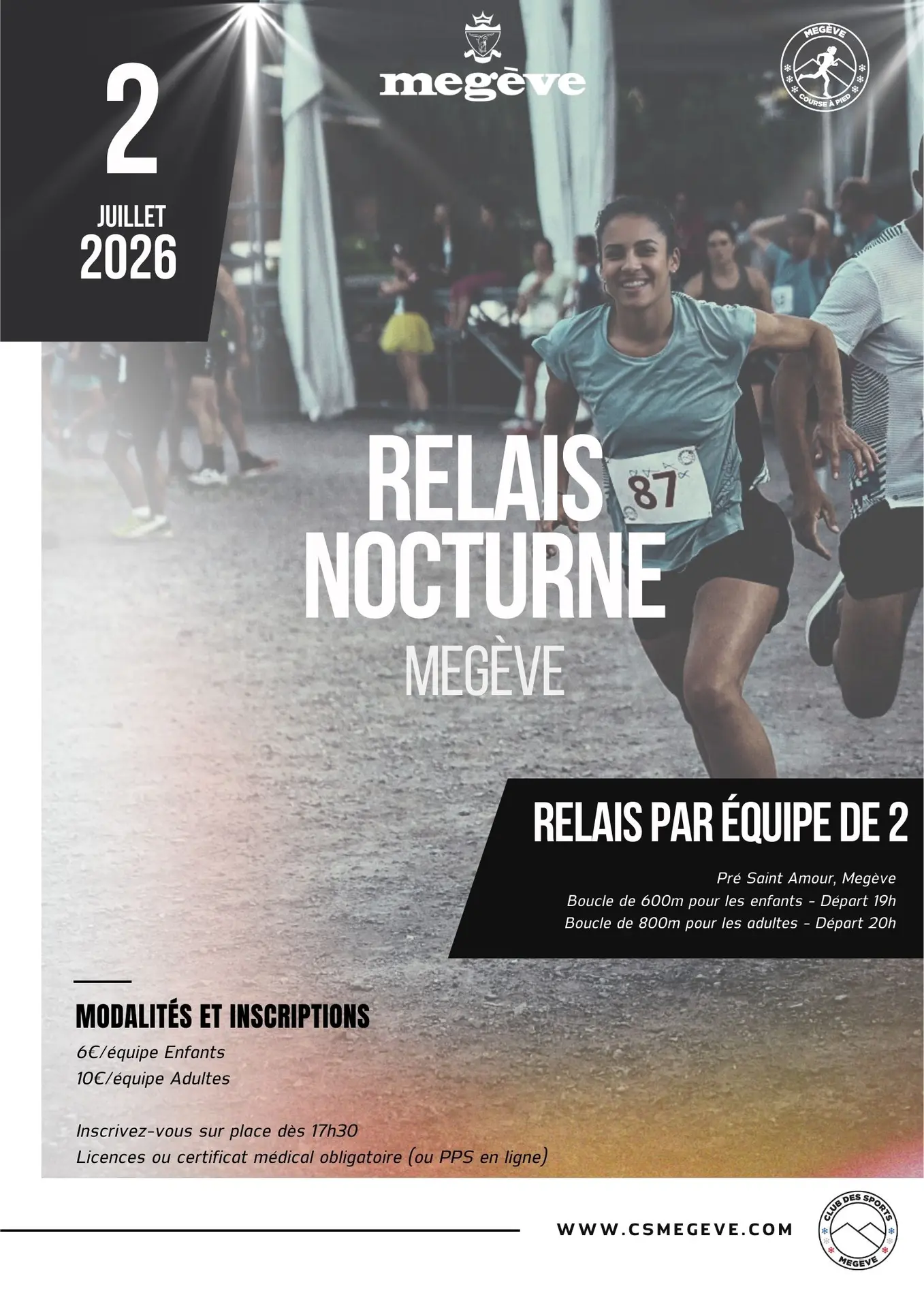 Le relais nocturne de Megève se fait par équipe de deux et se déroule en plein centre de Megève. Des boucles d'environ 600 mètres pour les enfants et de 800 mètres pour les adultes, de quoi faire monter le cardio pendant toute la soirée !