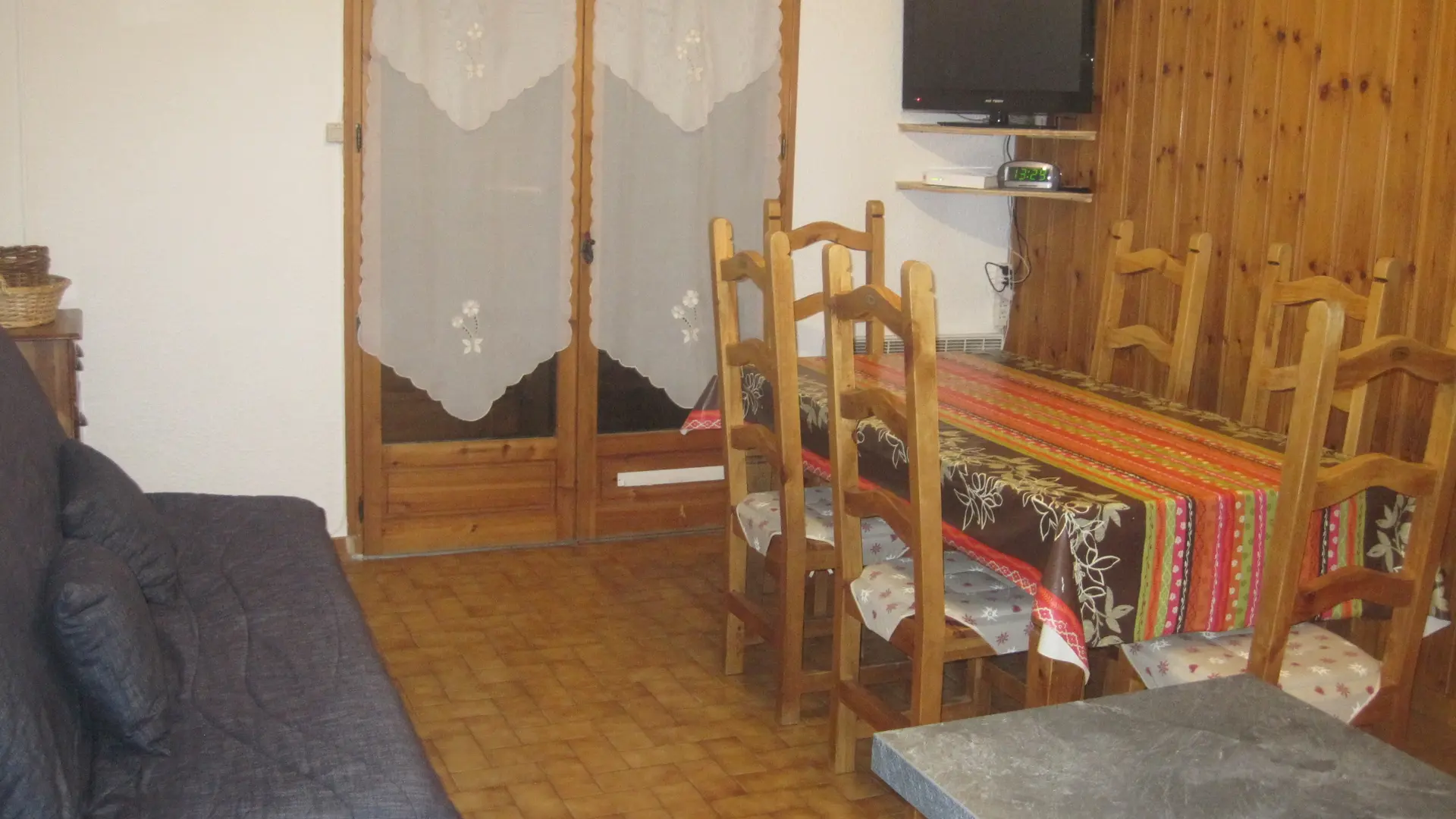 Coquet appartement de 35 m2, lumineux, avec grand balcon exposé S-E, au coeur du village, comprenant 1 grand séjour avec coin cuisine et une chambre, au 1er étage d'un immeuble de 4 étages.