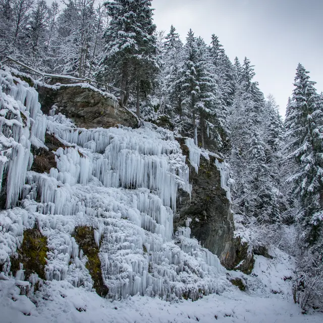 Tentez une initiation à l'escalade sur glace, encadré par un guide sur le site majestueux de Notre-Dame de la Gorge, sur réservation.