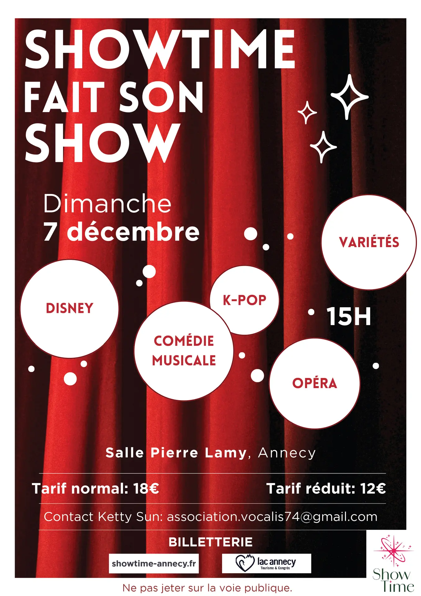 11 chanteurs de l’association annécienne Vocalis ShowTime vous entraînent au cœur des grands airs de comédie musicale, de variétés en passant par Disney, sans oublier l’opéra et même la KPop, lors de ce concert glamour et haut en couleurs.