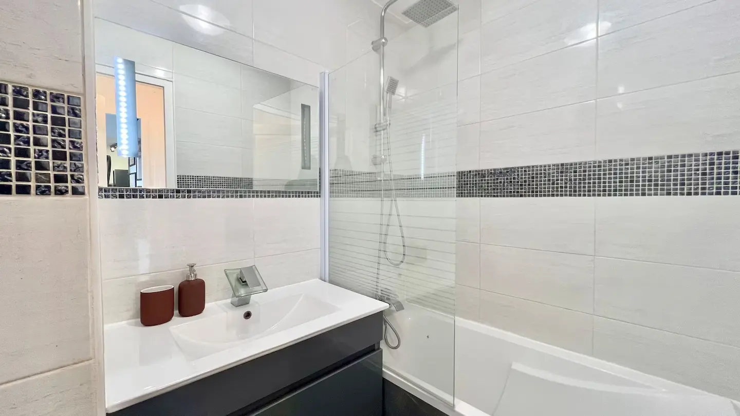 ★ La Salle-de-bains, avec baignoire, sèche serviette et meuble vasque moderne !