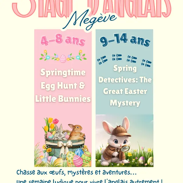 Les enfants participent chaque jour à une séance de 1h30 entièrement dédiée à la pratique de l’anglais dans une atmosphère dynamique et bienveillante. Le stage s’articule autour d’un thème de printemps inspiré de l’univers de Pâques : mystères, chasse aux indices et petits défis d’équipe rythment la semaine. Les enfants deviennent explorateurs et détectives, résolvent des énigmes simples, participent à des jeux de rôle et réalisent de petites activités créatives tout en utilisant l’anglais de manière naturelle.