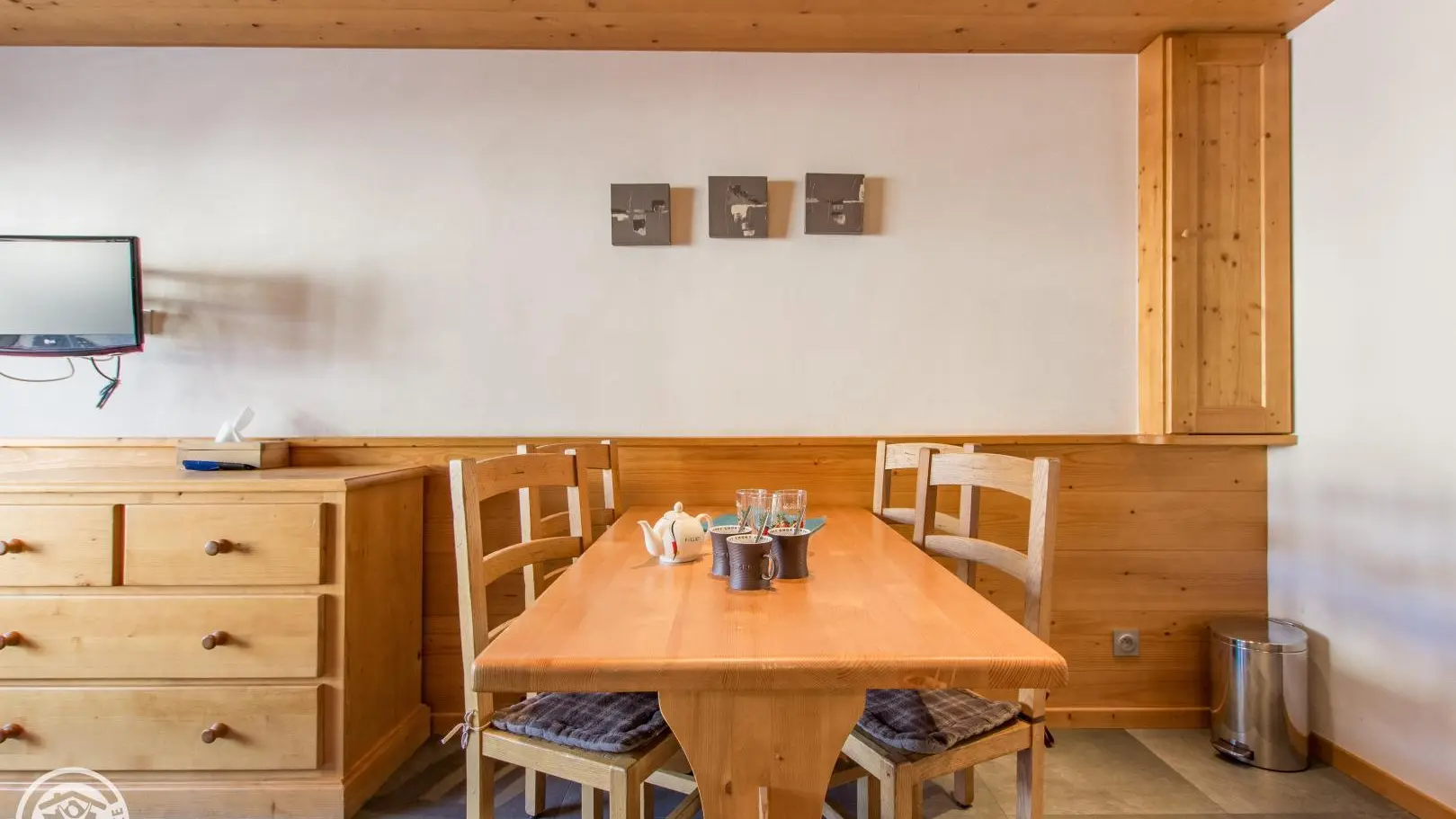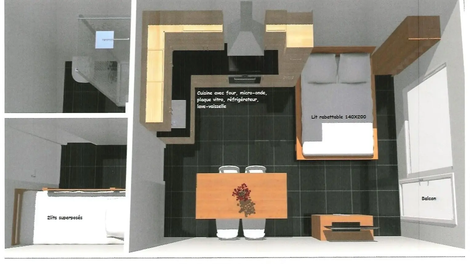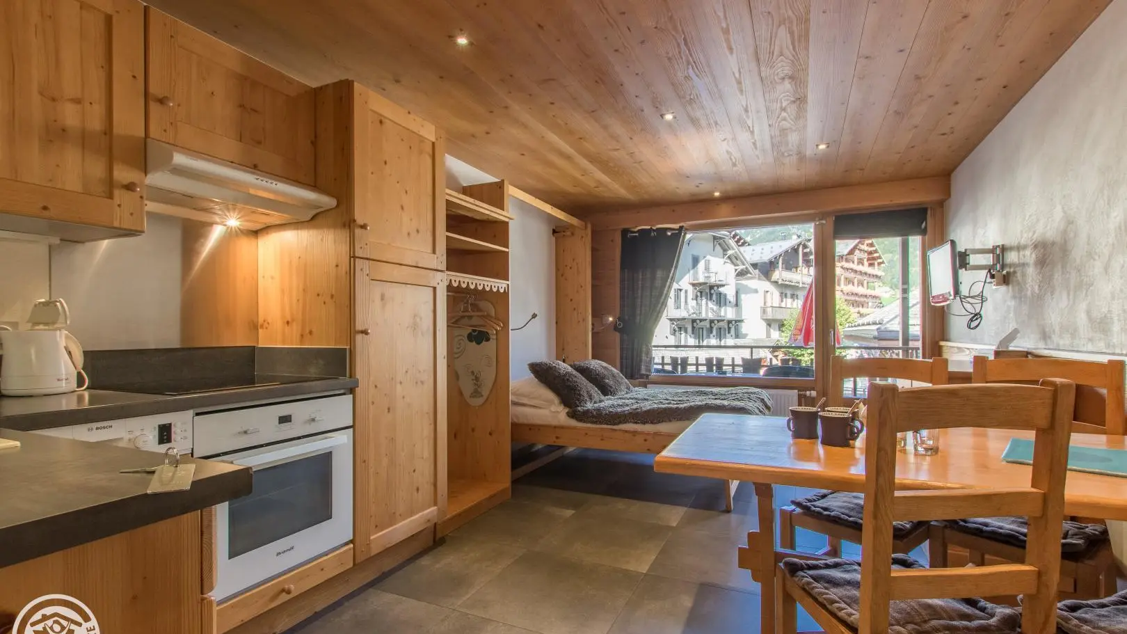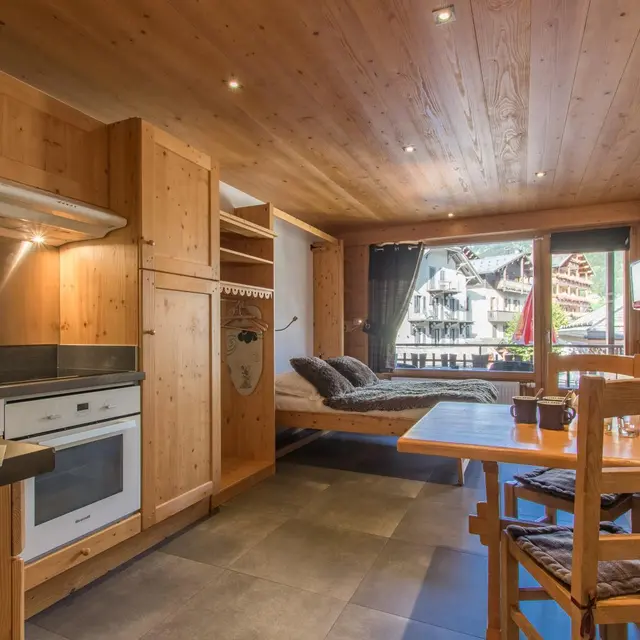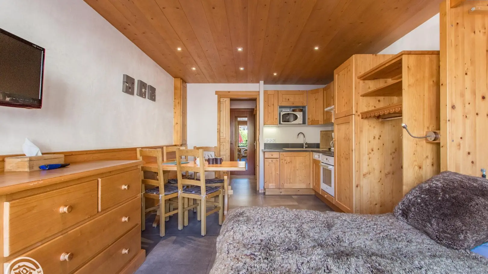 Cuisine équipée ouverte sur l'espace nuit : table repas, télévision, 1 lit double escamotable 140x190cm. Porte-fenêtre donnant accès au balcon.